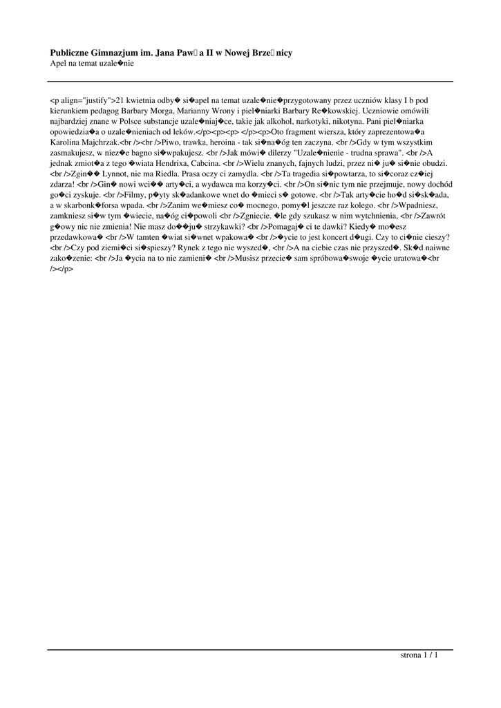 Apel na temat uzale nie - Publiczne Gimnazjum w Nowej Brzeźnicy