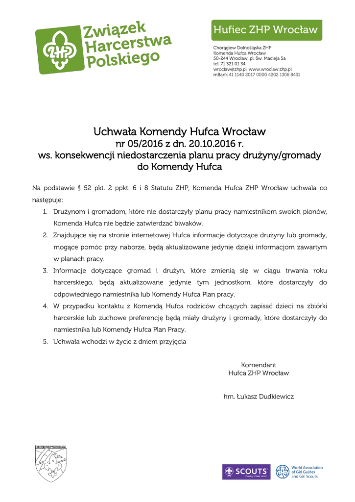 Hufiec ZHP Wrocław Chorągiew Dolnośląska ZHP Komenda Hufca Wrocław 50-244 Wrocław, pl. Św. Macieja 5a tel. 71 321 01 34 [email protected], www.wroclaw.zhp.pl mBank 41 1140 2017 0000 4202 1306 8431 Uchwała Komendy Hufca Wrocław nr 05/2016 z dn. 20.10.2016 r. ws. konsekwencji niedostarczenia planu pracy drużyny/gromady do Komendy Hufca Na podstawie § 52 pkt. 2 ppkt. 6 i 8 Statutu ZHP, Komenda Hufca ZHP Wrocław uchwala co następuje: 1. Drużynom i gromadom, które nie dostarczyły planu pracy namiestnikom swoich pionów, Komenda Hufca nie będzie zatwierdzać biwaków. 2. Znajdujące się na stronie internetowej Hufca informacje dotyczące drużyny lub gromady, mogące pomóc przy naborze, będą aktualizowane jedynie dzięki informacjom zawartym w planach pracy. 3. Informacje dotyczące gromad i drużyn, które zmienią się w ciągu trwania roku harcerskiego, będą aktualizowane jedynie tym jednostkom, które dostarczyły do odpowiedniego namiestnika lub Komendy Hufca Plan pracy. 4. W przypadku kontaktu z Komendą Hufca rodziców chcących zapisać dzieci na zbiórki harcerskie lub zuchowe preferencję będą miały drużyny i gromady, które dostarczyły do namiestnika lub Komendy Hufca Plan Pracy. 5. Uchwała wchodzi w życie z dniem przyjęcia Komendant Hufca ZHP Wrocław hm. Łukasz Dudkiewicz