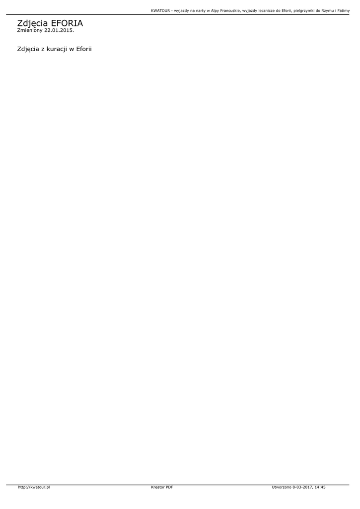 KWATOUR - wyjazdy na narty w Alpy Francuskie, wyjazdy lecznicze do Eforii, pielgrzymki do Rzymu i Fatimy Zdjęcia EFORIA Zmieniony 22.01.2015. Zdjęcia z kuracji w Eforii http://kwatour.pl Kreator PDF Utworzono 8-03-2017, 14:45