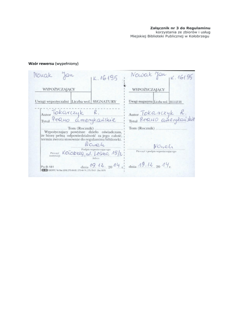 Załącznik nr 3 do Regulaminu korzystania ze zbiorów i usług Miejskiej Biblioteki Publicznej w Kołobrzegu Wzór rewersu (wypełniony)