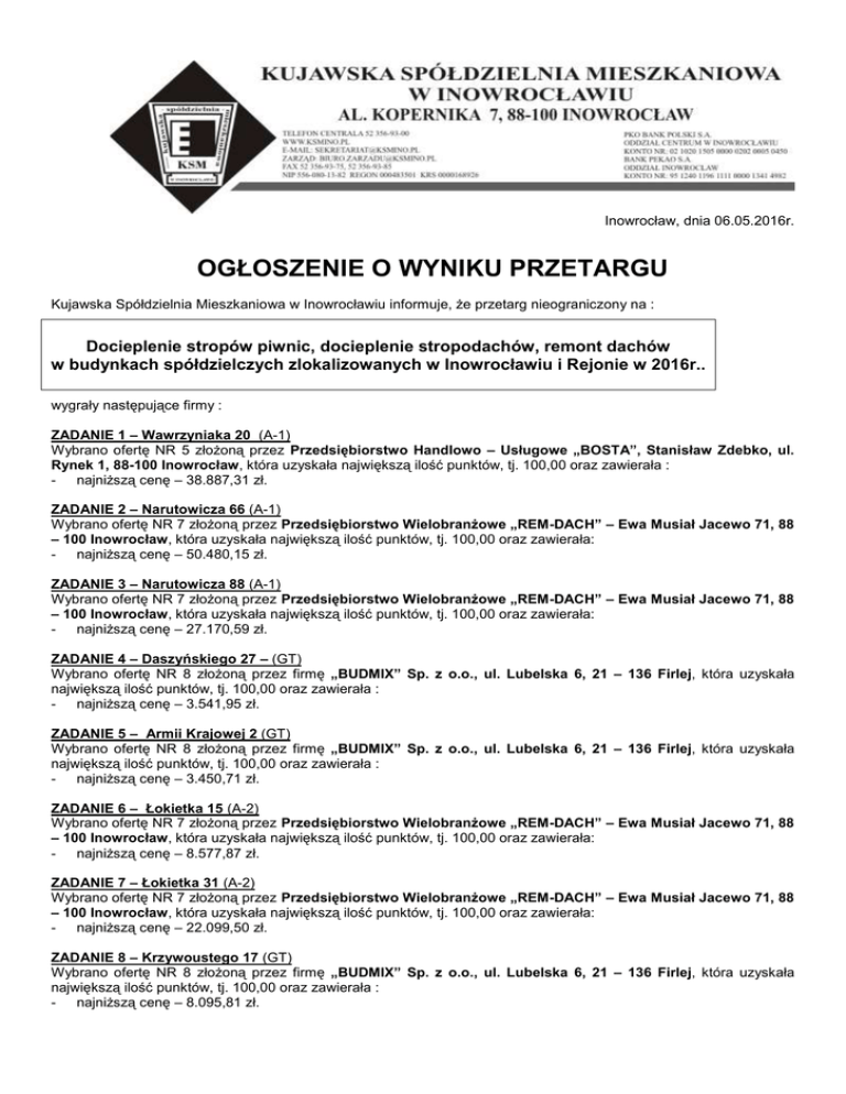 Inowrocław, dnia 06.05.2016r. OGŁOSZENIE O WYNIKU PRZETARGU Kujawska Spółdzielnia Mieszkaniowa w Inowrocławiu informuje, że przetarg nieograniczony na : Docieplenie stropów piwnic, docieplenie stropodachów, remont dachów w budynkach spółdzielczych zlokalizowanych w Inowrocławiu i Rejonie w 2016r.. wygrały następujące firmy : ZADANIE 1 – Wawrzyniaka 20 (A-1) Wybrano ofertę NR 5 złożoną przez Przedsiębiorstwo Handlowo – Usługowe „BOSTA”, Stanisław Zdebko, ul. Rynek 1, 88-100 Inowrocław, która uzyskała największą ilość punktów, tj. 100,00 oraz zawierała : - najniższą cenę – 38.887,31 zł. ZADANIE 2 – Narutowicza 66 (A-1) Wybrano ofertę NR 7 złożoną przez Przedsiębiorstwo Wielobranżowe „REM-DACH” – Ewa Musiał Jacewo 71, 88 – 100 Inowrocław, która uzyskała największą ilość punktów, tj. 100,00 oraz zawierała: - najniższą cenę – 50.480,15 zł. ZADANIE 3 – Narutowicza 88 (A-1) Wybrano ofertę NR 7 złożoną przez Przedsiębiorstwo Wielobranżowe „REM-DACH” – Ewa Musiał Jacewo 71, 88 – 100 Inowrocław, która uzyskała największą ilość punktów, tj. 100,00 oraz zawierała: - najniższą cenę – 27.170,59 zł. ZADANIE 4 – Daszyńskiego 27 – (GT) Wybrano ofertę NR 8 złożoną przez firmę „BUDMIX” Sp. z o.o., ul. Lubelska 6, 21 – 136 Firlej, która uzyskała największą ilość punktów, tj. 100,00 oraz zawierała : - najniższą cenę – 3.541,95 zł. ZADANIE 5 – Armii Krajowej 2 (GT) Wybrano ofertę NR 8 złożoną przez firmę „BUDMIX” Sp. z o.o., ul. Lubelska 6, 21 – 136 Firlej, która uzyskała największą ilość punktów, tj. 100,00 oraz zawierała : - najniższą cenę – 3.450,71 zł. ZADANIE 6 – Łokietka 15 (A-2) Wybrano ofertę NR 7 złożoną przez Przedsiębiorstwo Wielobranżowe „REM-DACH” – Ewa Musiał Jacewo 71, 88 – 100 Inowrocław, która uzyskała największą ilość punktów, tj. 100,00 oraz zawierała: - najniższą cenę – 8.577,87 zł. ZADANIE 7 – Łokietka 31 (A-2) Wybrano ofertę NR 7 złożoną przez Przedsiębiorstwo Wielobranżowe „REM-DACH” – Ewa Musiał Jacewo 71, 88 – 100 Inowrocław, która uzyskała największą ilość punktów, tj. 100,00 oraz zawierała: - najniższą cenę – 22.099,50 zł. ZADANIE 8 – Krzywoustego 17 (GT) Wybrano ofertę NR 8 złożoną przez firmę „BUDMIX” Sp. z o.o., ul. Lubelska 6, 21 – 136 Firlej, która uzyskała największą ilość punktów, tj. 100,00 oraz zawierała : - najniższą cenę – 8.095,81 zł. ZADANIE 9 – Wojska Polskiego 15 (A-4) Wybrano ofertę NR 5 złożoną przez Przedsiębiorstwo Handlowo – Usługowe „BOSTA”, Stanisław Zdebko, ul. Rynek 1, 88-100 Inowrocław, która uzyskała największą ilość punktów, tj. 100,00 oraz zawierała : - najniższą cenę – 4.273,66 zł. ZADANIE 10 – Wojska Polskiego 17 (A-4) Wybrano ofertę NR 5 złożoną przez Przedsiębiorstwo Handlowo – Usługowe „BOSTA”, Stanisław Zdebko, ul. Rynek 1, 88-100 Inowrocław, która uzyskała największą ilość punktów, tj. 100,00 oraz zawierała : - najniższą cenę – 4.268,69 zł. ZADANIE 11 – Alejnika 4 (GT) Wybrano ofertę NR 4 złożoną przez firmę „MILENIUM” Ryszard Durczak, ul. Milenijna 44 , 44 – 207 Rybnik, która uzyskała największą ilość punktów, tj. 100,00 oraz zawierała : - najniższą cenę – 121.562,68 zł, ZADANIE 12 – E. Plater 8 (GT) Wybrano ofertę NR 9 złożoną przez Zakład Dekarsko Blacharski s. c. – R. D. Pęczkowscy, Młyńska 14, 88 – 100 Inowrocław, która uzyskała największą ilość punktów, tj. 100,00 oraz zawierała : - najniższą cenę – 33.888,54 zł. ZADANIE 13 – Cymsa 3 (GT) Wybrano ofertę NR 9 złożoną przez Zakład Dekarsko Blacharski s. c. – R. D. Pęczkowscy, Młyńska 14, 88 – 100 Inowrocław, która uzyskała największą ilość punktów, tj. 100,00 oraz zawierała : - najniższą cenę – 12.123,72 zł. ZADANIE 14 – Wojska Polskiego 51 (GT) Wybrano ofertę NR 9 złożoną przez Zakład Dekarsko Blacharski s. c. – R. D. Pęczkowscy, Młyńska 14, 88 – 100 Inowrocław, która uzyskała największą ilość punktów, tj. 100,00 oraz zawierała : - najniższą cenę – 20.188,48 zł, ZADANIE 15 – Jaworskiej 4 (GT) Wybrano ofertę NR 9 złożoną przez Zakład Dekarsko Blacharski s. c. – R. D. Pęczkowscy, Młyńska 14, 88 – 100 Inowrocław, która uzyskała największą ilość punktów, tj. 100,00 oraz zawierała : - najniższą cenę – 14.299,52 zł, ZADANIE 16 – Jaworskiej 3 (GT) Wybrano ofertę NR 9 złożoną przez Zakład Dekarsko Blacharski s. c. – R. D. Pęczkowscy, Młyńska 14, 88 – 100 Inowrocław, która uzyskała największą ilość punktów, tj. 100,00 oraz zawierała : - najniższą cenę – 40.595,30 zł, ZADANIE 17 – Wojska Polskiego 23 (GT) Wybrano ofertę NR 9 złożoną przez Zakład Dekarsko Blacharski s. c. – R. D. Pęczkowscy, Młyńska 14, 88 – 100 Inowrocław, która uzyskała największą ilość punktów, tj. 100,00 oraz zawierała : - najniższą cenę – 36.940,97 zł, ZADANIE 18 – Szarych Szeregów 4 (GT) Wybrano ofertę NR 9 złożoną przez Zakład Dekarsko Blacharski s. c. – R. D. Pęczkowscy, Młyńska 14, 88 – 100 Inowrocław, która uzyskała największą ilość punktów, tj. 100,00 oraz zawierała : - najniższą cenę – 17.026,36 zł. ZADANIE 19 – Krzymińskiego 9 (GT/A-5) Wybrano ofertę NR 9 złożoną przez Zakład Dekarsko Blacharski s. c. – R. D. Pęczkowscy, Młyńska 14, 88 – 100 Inowrocław, która uzyskała największą ilość punktów, tj. 100,00 oraz zawierała : - najniższą cenę – 104.000,00 zł. ul. ul. ul. ul. ul. ul. ul. ul. ZADANIE 20 – Kleeberga 9 (GT) Wybrano ofertę NR 8 złożoną przez firmę „BUDMIX” Sp. z o.o., ul. Lubelska 6, 21 – 136 Firlej, która uzyskała największą ilość punktów, tj. 100,00 oraz zawierała : - najniższą cenę – 9.296,53 zł. ZADANIE 21 – Wojska P