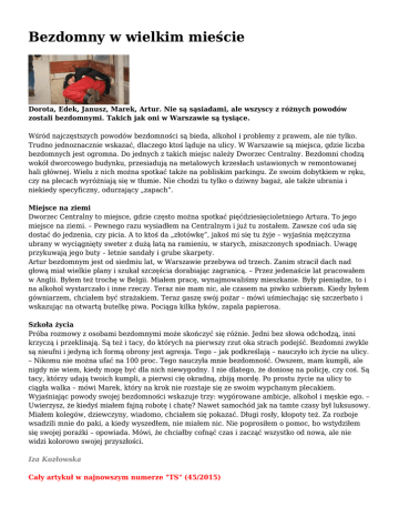 Bezdomny w wielkim mieście Dorota, Edek, Janusz, Marek, Artur. Nie są sąsiadami, ale wszyscy z różnych powodów zostali bezdomnymi. Takich jak oni w Warszawie są tysiące. Wśród najczęstszych powodów bezdomności są bieda, alkohol i problemy z prawem, ale nie tylko. Trudno jednoznacznie wskazać, dlaczego ktoś ląduje na ulicy. W Warszawie są miejsca, gdzie liczba bezdomnych jest ogromna. Do jednych z takich miejsc należy Dworzec Centralny. Bezdomni chodzą wokół dworcowego budynku, przesiadują na metalowych krzesłach ustawionych w remontowanej hali głównej. Wielu z nich można spotkać także na pobliskim parkingu. Ze swoim dobytkiem w ręku, czy na plecach wyróżniają się w tłumie. Nie chodzi tu tylko o dziwny bagaż, ale także ubrania i niekiedy specyficzny, odurzający „zapach”. Miejsce na ziemi Dworzec Centralny to miejsce, gdzie często można spotkać pięćdziesięcioletniego Artura. To jego miejsce na ziemi. – Pewnego razu wysiadłem na Centralnym i już tu zostałem. Zawsze coś uda się dostać do jedzenia, czy picia. A to ktoś da „złotówkę”, jakoś mi się tu żyje – wyjaśnia mężczyzna ubrany w wyciągnięty sweter z dużą łatą na ramieniu, w starych, zniszczonych spodniach. Uwagę przykuwają jego buty – letnie sandały i grube skarpety. Artur bezdomnym jest od siedmiu lat, w Warszawie przebywa od trzech. Zanim stracił dach nad głową miał wielkie plany i szukał szczęścia dorabiając zagranicą. – Przez jedenaście lat pracowałem w Anglii. Byłem też trochę w Belgii. Miałem pracę, wynajmowaliśmy mieszkanie. Były pieniądze, to i na alkohol wystarczało i inne rzeczy. Teraz nie mam nic, ale czasem na piwko uzbieram. Kiedy byłem gówniarzem, chciałem być strażakiem. Teraz gaszę swój pożar – mówi uśmiechając się szczerbato i wskazując na otwartą butelkę piwa. Pociąga kilka łyków, zapala papierosa. Szkoła życia Próba rozmowy z osobami bezdomnymi może skończyć się różnie. Jedni bez słowa odchodzą, inni krzyczą i przeklinają. Są też i tacy, do których na pierwszy rzut oka strach podejść. Bezdomni zwykle są nieufni i jedyną ich formą obrony jest agresja. Tego – jak podkreślają – nauczyło ich życie na ulicy. – Nikomu nie można ufać na 100 proc. Tego nauczyła mnie bezdomność. Owszem, mam kumpli, ale nigdy nie wiem, kiedy mogę być dla nich niewygodny. I nie dlatego, że doniosę na policję, czy coś. Są tacy, którzy udają twoich kumpli, a pierwsi cię okradną, zbiją mordę. Po prostu życie na ulicy to ciągła walka – mówi Marek, który na krok nie rozstaje się ze swoim wypchanym plecakiem. Wyjaśniając powody swojej bezdomności wskazuje trzy: wygórowane ambicje, alkohol i męskie ego. – Uwierzysz, że kiedyś miałem fajną robotę i chatę? Nawet samochód jak na tamte czasy był luksusowy. Miałem kolegów, dziewczyny, wiadomo, chciałem się pokazać. Długi rosły, kłopoty też. Za rozboje wsadzili mnie do paki, a kiedy wyszedłem, nie miałem nic. Nie poprosiłem o pomoc, bo wstydziłem się swojej porażki – opowiada. Mówi, że chciałby cofnąć czas i zacząć wszystko od nowa, ale nie widzi kolorowo swojej przyszłości. Iza Kozłowska Cały artykuł w najnowszym numerze "TS" (45/2015) fot. T. Gutry