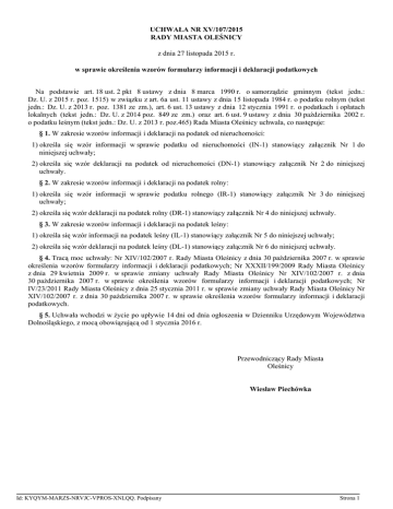 UCHWAŁA NR XV/107/2015 RADY MIASTA OLEŚNICY z dnia 27 listopada 2015 r. w sprawie określenia wzorów formularzy informacji i deklaracji podatkowych Na podstawie art. 18 ust. 2 pkt 8 ustawy z dnia 8 marca 1990 r. o samorządzie gminnym (tekst jedn.: Dz. U. z 2015 r. poz. 1515) w związku z art. 6a ust. 11 ustawy z dnia 15 listopada 1984 r. o podatku rolnym (tekst jedn.: Dz. U. z 2013 r. poz. 1381 ze zm.), art. 6 ust. 13 ustawy z dnia 12 stycznia 1991 r. o podatkach i opłatach lokalnych (tekst jedn.: Dz. U. z 2014 poz. 849 ze zm.) oraz art. 6 ust. 9 ustawy z dnia 30 października 2002 r. o podatku leśnym (tekst jedn.: Dz. U. z 2013 r. poz.465) Rada Miasta Oleśnicy uchwala, co następuje: § 1. W zakresie wzorów informacji i deklaracji na podatek od nieruchomości: 1) określa się wzór informacji w sprawie podatku od nieruchomości (IN-1) stanowiący załącznik Nr 1 do niniejszej uchwały; 2) określa się wzór deklaracji na podatek od nieruchomości (DN-1) stanowiący załącznik Nr 2 do niniejszej uchwały. § 2. W zakresie wzorów informacji i deklaracji na podatek rolny: 1) określa się wzór informacji w sprawie podatku rolnego (IR-1) stanowiący załącznik Nr 3 do niniejszej uchwały; 2) określa się wzór deklaracji na podatek rolny (DR-1) stanowiący załącznik Nr 4 do niniejszej uchwały. § 3. W zakresie wzorów informacji i deklaracji na podatek leśny: 1) określa się wzór informacji na podatek leśny (IL-1) stanowiący załącznik Nr 5 do niniejszej uchwały; 2) określa się wzór deklaracji na podatek leśny (DL-1) stanowiący załącznik Nr 6 do niniejszej uchwały. § 4. Tracą moc uchwały: Nr XIV/102/2007 r. Rady Miasta Oleśnicy z dnia 30 października 2007 r. w sprawie określenia wzorów formularzy informacji i deklaracji podatkowych; Nr XXXII/199/2009 Rady Miasta Oleśnicy z dnia 29 kwietnia 2009 r. w sprawie zmiany uchwały Rady Miasta Oleśnicy Nr XIV/102/2007 r. z dnia 30 października 2007 r. w sprawie określenia wzorów formularzy informacji i deklaracji podatkowych; Nr IV/23/2011 Rady Miasta Oleśnicy z dnia 25 stycznia 2011 r. w sprawie zmiany uchwały Rady Miasta Oleśnicy Nr XIV/102/2007 r. z dnia 30 października 2007 r. w sprawie określenia wzorów formularzy informacji i deklaracji podatkowych. § 5. Uchwała wchodzi w życie po upływie 14 dni od dnia ogłoszenia w Dzienniku Urzędowym Województwa Dolnośląskiego, z mocą obowiązującą od 1 stycznia 2016 r. Przewodniczący Rady Miasta Oleśnicy Wiesław Piechówka Id: KYQYM-MARZS-NRVJC-VPROS-XNLQQ. Podpisany Strona 1 1. Identyfikator podatkowy NIP / numer PESEL (niepotrzebne skreślić)1) ................................................................................................................................................................ IN-1 Załącznik nr 1 do Uchwały Nr XV/107/2015 Rady Miasta Oleśnicy z dnia 27 listopada 2015r. INFORMACJA W SPRAWIE PODATKU OD NIERUCHOMOŚCI 2. Rok na ........................................ Podstawa prawna: Ustawa z dnia 12 stycznia 1991r. o podatkach i opłatach lokalnych (Dz. U. z 2014 r. poz. 849 ze zm.). Składający: Formularz przeznaczony dla osób fizycznych będących właścicielami nieruchomości lub obiektów budowlanych, posiadaczami samoistnymi nieruchomości lub obiektów budowlanych, użytkownikami wieczystymi gruntów, posiadaczami nieruchomości lub ich części albo obiektów budowlanych lub ich części, stanowiących własność Skarbu Państwa lub jednostki samorządu terytorialnego. Termin składania: W terminie 14 dni od zaistnienia okoliczności mających wpływ na powstanie, bądź wygaśnięcie obowiązku podatkowego lub na wysokość opodatkowania. Miejsce składania: Organ podatkowy właściwy ze względu na miejsce położenia przedmiotów opodatkowania. A. MIEJSCE SKŁADANIA INFORMACJI 3. Nazwa i adres siedziby organu podatkowego BURMISTRZ MIASTA OLEŚNICY Adres: 56-400 Oleśnica, Rynek-Ratusz B. DANE SKŁADAJĄCEGO INFORMACJĘ B.1. DANE IDENTYFIKACYJNE 4. Rodzaj własności, posiadania (zaznaczyć właściwy kwadrat) 1. właściciel 2. współwłaściciel 3. posiadacz samoistny 4. współposiadacz samoistny 5. użytkownik wieczysty 6. współużytkownik wieczysty 7. posiadacz zależny (np. dzierżawca, najemca) 8. współposiadacz zależny (np. dzierżawca, najemca) 5. Miejsce/a (adres/y) położenia przedmiotów opodatkowania oraz identyfikator/y działek, budynków, lokali (Uwaga! Wykazuje się odrębnie dla każdej nieruchomości) 1)........................................................................................................................................................................................................................ 2)........................................................................................................................................................................................................................ 3)........................................................................................................................................................................................................................ 4)........................................................................................................................................................................................................................ 6. Numer/y księgi wieczystej lub zbioru/ów dokumentów oraz nazwa sądu, w którym prowadzona jest księga wieczysta lub zbiór dokumentów (Uwaga! Wykazuje się odrębnie dla każdej nieruchomości) 1)........................................................................................................................................................................................................................ 2)........................................................................................................................................................................................................