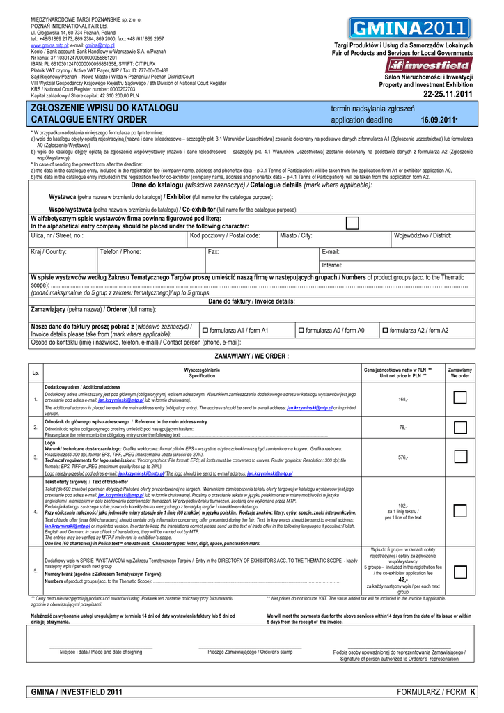 MIĘDZYNARODOWE TARGI POZNAŃSKIE sp. z o. o. POZNAŃ INTERNATIONAL FAIR Ltd. ul. Głogowska 14, 60-734 Poznań, Poland tel.: +48/61869 2173, 869 2384, 869 2000, fax.: +48 /61/ 869 2957 www.gmina.mtp.pl; e-mail: [email protected] Konto / Bank account: Bank Handlowy w Warszawie S.A. o/Poznań Nr konta: 37 103012470000000055861201 IBAN: PL 66103012470000000055861358, SWIFT: CITIPLPX Płatnik VAT czynny / Active VAT Payer, NIP / Tax ID: 777-00-00-488 Sąd Rejonowy Poznań – Nowe Miasto i Wilda w Poznaniu / Poznan District Court VIII Wydział Gospodarczy Krajowego Rejestru Sądowego / 8th Division of National Court Register KRS / National Court Register number: 0000202703 Kapitał zakładowy / Share capital: 42 310 200,00 PLN Targi Produktów i Usług dla Samorządów Lokalnych Fair of Products and Services for Local Governments Salon Nieruchomości i Inwestycji Property and Investment Exhibition 22-25.11.2011 ZGŁOSZENIE WPISU DO KATALOGU CATALOGUE ENTRY ORDER termin nadsyłania zgłoszeń application deadline 16.09.2011* * W przypadku nadesłania niniejszego formularza po tym terminie: a) wpis do katalogu objęty opłatą rejestracyjną (nazwa i dane teleadresowe – szczegóły pkt. 3.1 Warunków Uczestnictwa) zostanie dokonany na podstawie danych z formularza A1 (Zgłoszenie uczestnictwa) lub formularza A0 (Zgłoszenie Wystawcy) b) wpis do katalogu objęty opłatą za zgłoszenie współwystawcy (nazwa i dane teleadresowe – szczegóły pkt. 4.1 Warunków Uczestnictwa) zostanie dokonany na podstawie danych z formularza A2 (Zgłoszenie współwystawcy). * In case of sending the present form after the deadline: a) the data in the catalogue entry, included in the registration fee (company name, address and phone/fax data – p.3.1 Terms of Participation) will be taken from the application form A1 or exhibitor application A0, b) the data in the catalogue entry included in the registration fee for co-exhibitor (company name, address and phone/fax data – p.4.1 Terms of Participation) will be taken from the application form A2. Dane do katalogu (właściwe zaznaczyć) / Catalogue details (mark where applicable): Wystawca (pełna nazwa w brzmieniu do katalogu) / Exhibitor (full name for the catalogue purpose): Wspólwystawca (pełna nazwa w brzmieniu do katalogu) / Co-exhibitor (full name for the catalogue purpose): W alfabetycznym spisie wystawców firma powinna figurować pod literą: In the alphabetical entry company should be placed under the following character: Ulica, nr / Street, no.: Kod pocztowy / Postal code: Miasto / City: Kraj / Country: Telefon / Phone: Fax: Województwo / District: E-mail: Internet: W spisie wystawców według Zakresu Tematycznego Targów proszę umieścić naszą firmę w następujących grupach / Numbers of product groups (acc. to the Thematic scope): .....................................................................................................…………………………………………………………………………………………………………………………… (podać maksymalnie do 5 grup z zakresu tematycznego)/ up to 5 groups Dane do faktury / Invoice details: Zamawiający (pełna nazwa) / Orderer (full name): Nasze dane do faktury proszę pobrać z (właściwe zaznaczyć) / formularza A1 / form A1 Invoice details please take from (mark where applicable): Osoba do kontaktu (imię i nazwisko, telefon, e-mail) / Contact person (phone, e-mail): formularza A0 / form A0 formularza A2 / form A2 ZAMAWIAMY / WE ORDER : Wyszczególnienie Specification Lp. Cena jednostkowa netto w PLN ** Unit net price in PLN ** 1. Dodatkowy adres / Additional address Dodatkowy adres umieszczany jest pod głównym (obligatoryjnym) wpisem adresowym. Warunkiem zamieszczenia dodatkowego adresu w katalogu wystawców jest jego przesłanie pod adres e-mail: [email protected] lub w formie drukowanej. The additional address is placed beneath the main address entry (obligatory entry). The address should be send to e-mail address: [email protected] or in printed version. 168,- 2. Odnośnik do głównego wpisu adresowego / Reference to the main address entry Odnośnik do wpisu obligatoryjnego prosimy umieścić pod następującym hasłem: Please place the reference to the obligatory entry under the following text: …………………………………………………………………………………………… 78,- 3. Logo Warunki techniczne dostarczania logo: Grafika wektorowa: format plików EPS – wszystkie uŜyte czcionki muszą być zamienione na krzywe. Grafika rastrowa: Rozdzielczość 300 dpi, format EPS, TIFF, JPEG (maksymalna utrata jakości do 20%). Technical requirements for logo submissions: Vector graphics: File format: EPS; all fonts must be converted to curves. Raster graphics: Resolution: 300 dpi; file formats: EPS, TIFF or JPEG (maximum quality loss up to 20%). Logo naleŜy przesłać pod adres e-mail: [email protected]/ The logo should be send to e-mail address: [email protected] 576,- 4. Tekst oferty targowej / Text of trade offer Tekst (do 600 znaków) powinien dotyczyć Państwa oferty prezentowanej na targach. Warunkiem zamieszczenia tekstu oferty targowej w katalogu wystawców jest jego przesłanie pod adres e-mail: [email protected] lub w formie drukowanej. Prosimy o przesłanie tekstu w języku polskim oraz w miarę moŜliwości w języku angielskim i niemieckim w celu zachowania poprawności tłumaczeń. W przypadku braku tłumaczeń, zostaną one wykonane przez MTP. Redakcja katalogu zastrzega sobie prawo do korekty tekstu niezgodnego z tematyką targów i charakterem katalogu. Przy obliczaniu naleŜności jako jednostkę miary stosuje się 1 linię (60 znaków) w języku polskim. Rodzaje znaków: litery, cyfry, spacje, znaki interpunkcyjne. Text of trade offer (max 600 characters) should contain only information concerning offer presented during the fair. Text in key words should be send to e-mail address: [email protected] o