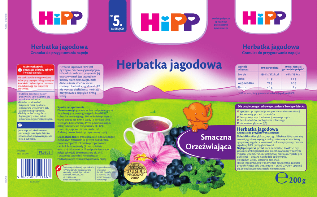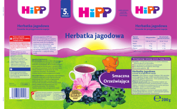 PL3803 / 43786/10/2010 5. PO MIESIĄCU środek spożywczy specjalnego przeznaczenia żywieniowego Herbatka jagodowa Herbatka jagodowa Granulat do przygotowania napoju Ważne wskazówki dotyczące ochrony ząbków Twojego dziecka Herbatka zawiera węglowodany, które przy częstym i długotrwałym kontakcie z zębami podczas ssania z butelki mogą być przyczyną próchnicy. • Butelki z piciem nie należy podawać w celu usypiania czy uspokajania dziecka. • Butelka powinna być trzymana przez opiekuna i podawana wyłącznie w celu zaspokojenia pragnienia. • Należy zadbać o regularną higienę jamy ustnej już od pojawienia się pierwszego ząbka. Jeszcze przed ukończeniem pierwszego roku życia dziecko powinno być przyzwyczajane do picia z kubeczka. 3059/7128 3059/7128 156/231/442/490 9 PL3803 06 2 300 1 1 1 4 6 7 06_0363EM Granulat do przygotowania napoju Herbatka jagodowa HiPP jest pysznym i orzeźwiającym napojem, który doskonale gasi pragnienie. Jej owocowy smak jest szczególnie lubiany przez niemowlęta, małe dzieci, a także dzieci w wieku szkolnym. Herbatka jagodowa HiPP nie wymaga dosładzania, można ją przygotować z ciepłą lub zimną wodą. Sposób przygotowania Dla niemowląt: granulat w ilości odpowiadającej 1 czubatej łyżeczce (4 g) wsyp do butelki lub kubeczka zawierającego 100 ml świeżo przegoto wanej ciepłej lub zimnej wody (1 porcja) i silnie wstrząśnij lub zamieszaj. Przed podaniem napój należy schłodzić do temperatury ok. 37°C i uważnie ją sprawdzić. Nie dosładzaj! Podawaj zawsze świeżo przygotowany napój. Dla małych dzieci: granulat w ilości odpowiadającej 2 czubatym łyżeczkom (8 g) wsyp do kubeczka zawierającego 200 ml świeżo przegotowanej ciepłej lub zimnej wody (1 porcja) i silnie wstrząśnij lub zamieszaj. Przed podaniem napój należy schłodzić do temperatury ok. 37°C i uważnie ją sprawdzić. Nie dosładzaj! Podawaj zawsze świeżo przygotowany napój. Dodatkowych informacji o produktach HiPP oraz porad w zakresie żywienia niemowląt i małych dzieci udziela: SERWIS DLA RODZICÓW: tel. 22 853-44-44 e-mail: [email protected] Wyprodukowano w Szwajcarii dla HiPP Polska Sp. z o.o. ul. Puławska 303 02-785 Warszawa www.hipp.pl Herbatka jagodowa Wartość odżywcza 100 g granulatu 100 ml herbatki gotowej do spożycia* Energia Białko Węglowodany Tłuszcz 1580 kJ/372 kcal <1g 93 g <1g 65 kJ/15 kcal <1g 3,7 g <1g * 100 ml wody i 4 g granulatu Herbatki jagodowej HiPP. Dla bezpiecznego i zdrowego żywienia Twojego dziecka z godnie z przepisami prawnymi nie zawiera substancji konserwujących ani barwników bez syntetycznych substancji aromatycznych bez składników pochodzenia mlecznego nie zawiera glutenu Smaczna Orzeźwiająca Herbatka jagodowa Granulat do przygotowania napoju Składniki: cukier, glukoza, wyciąg z hibiskusa 1,9%, naturalny aromat jagodowy, wyciąg z melisy, naturalny aromat trawy cytrynowej, regulator kwasowości – kwas cytrynowy, proszek jagodowy 0,2% (syrop glukozowy). Najlepiej spożyć przed: data minimalnej trwałości ory ginalnie zamkniętej herbatki, przechowywanej w suchym miejscu, w temperaturze pokojowej oraz numer partii pro dukcyjnej – podane na spodzie opakowania. Po każdym użyciu starannie zamknąć. Jakość tego produktu w momencie opuszczania zakładu produkcyjnego była bez zarzutu – przed użyciem upewnij się, że opakowanie pozostało nienaruszone. 0200 g