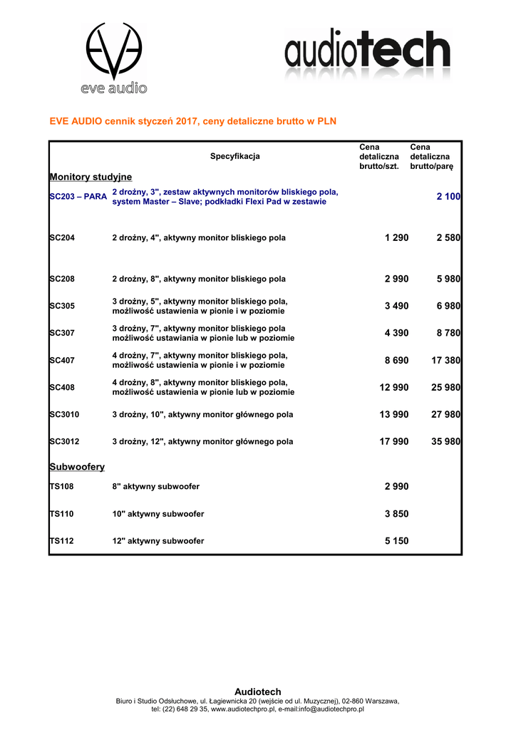 EVE AUDIO cennik styczeń 2017, ceny detaliczne brutto w PLN Specyfikacja Cena detaliczna brutto/szt. Cena detaliczna brutto/parę Monitory studyjne SC203 – PARA 2 drożny, 3", zestaw aktywnych monitorów bliskiego pola, system Master – Slave; podkładki Flexi Pad w zestawie SC204 2 drożny, 4", aktywny monitor bliskiego pola 1 290 2 580 SC208 2 drożny, 8", aktywny monitor bliskiego pola 2 990 5 980 SC305 3 drożny, 5", aktywny monitor bliskiego pola, możliwość ustawienia w pionie i w poziomie 3 490 6 980 SC307 3 drożny, 7", aktywny monitor bliskiego pola możliwość ustawiania w pionie lub w poziomie 4 390 8 780 SC407 4 drożny, 7", aktywny monitor bliskiego pola, możliwość ustawienia w pionie i w poziomie 8 690 17 380 SC408 4 drożny, 8", aktywny monitor bliskiego pola, możliwość ustawienia w pionie lub w poziomie 12 990 25 980 SC3010 3 drożny, 10", aktywny monitor głównego pola 13 990 27 980 SC3012 3 drożny, 12", aktywny monitor głównego pola 17 990 35 980 2 100 Subwoofery TS108 8" aktywny subwoofer 2 990 TS110 10" aktywny subwoofer 3 850 TS112 12" aktywny subwoofer 5 150 Audiotech Biuro i Studio Odsłuchowe, ul. Łagiewnicka 20 (wejście od ul. Muzycznej), 02-860 Warszawa, tel: (22) 648 29 35, www.audiotechpro.pl, e-mail:[email protected]