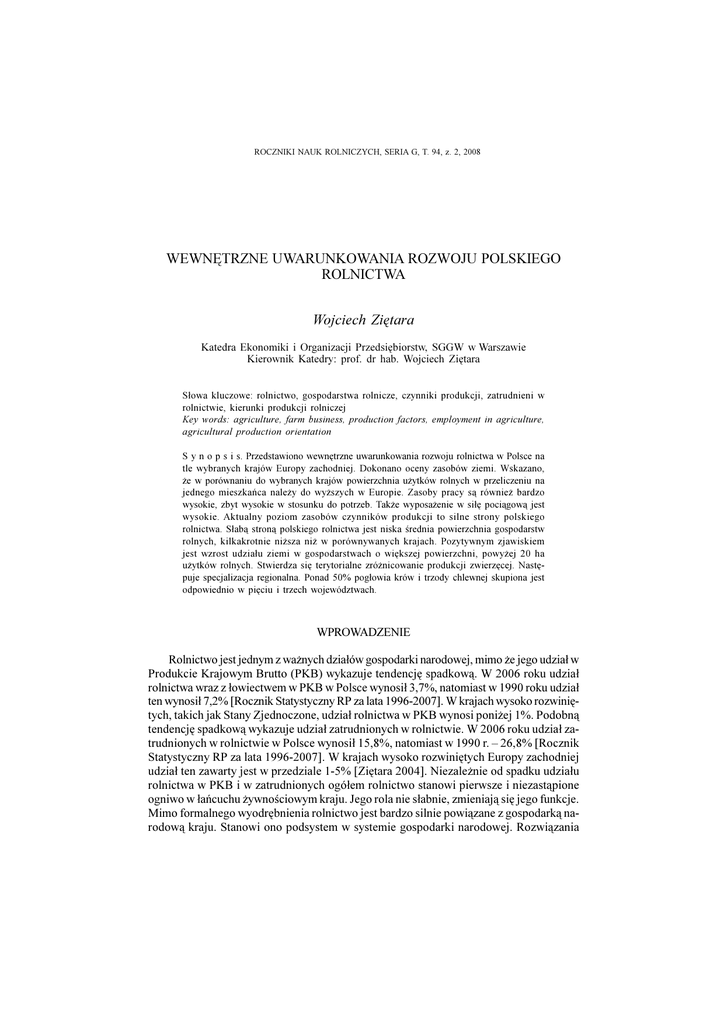 80 ROCZNIKI NAUK ROLNICZYCH, SERIA G, T. 94, z. 2, 2008 W. ZIÊTARA WEWNÊTRZNE UWARUNKOWANIA ROZWOJU POLSKIEGO ROLNICTWA Wojciech Ziêtara Katedra Ekonomiki i Organizacji Przedsiêbiorstw, SGGW w Warszawie Kierownik Katedry: prof. dr hab. Wojciech Ziêtara S³owa kluczowe: rolnictwo, gospodarstwa rolnicze, czynniki produkcji, zatrudnieni w rolnictwie, kierunki produkcji rolniczej Key words: agriculture, farm business, production factors, employment in agriculture, agricultural production orientation S y n o p s i s. Przedstawiono wewnêtrzne uwarunkowania rozwoju rolnictwa w Polsce na tle wybranych krajów Europy zachodniej. Dokonano oceny zasobów ziemi. Wskazano, ¿e w porównaniu do wybranych krajów powierzchnia u¿ytków rolnych w przeliczeniu na jednego mieszkañca nale¿y do wy¿szych w Europie. Zasoby pracy s¹ równie¿ bardzo wysokie, zbyt wysokie w stosunku do potrzeb. Tak¿e wyposa¿enie w si³ê poci¹gow¹ jest wysokie. Aktualny poziom zasobów czynników produkcji to silne strony polskiego rolnictwa. S³ab¹ stron¹ polskiego rolnictwa jest niska rednia powierzchnia gospodarstw rolnych, kilkakrotnie ni¿sza ni¿ w porównywanych krajach. Pozytywnym zjawiskiem jest wzrost udzia³u ziemi w gospodarstwach o wiêkszej powierzchni, powy¿ej 20 ha u¿ytków rolnych. Stwierdza siê terytorialne zró¿nicowanie produkcji zwierzêcej. Nastêpuje specjalizacja regionalna. Ponad 50% pog³owia krów i trzody chlewnej skupiona jest odpowiednio w piêciu i trzech województwach. WPROWADZENIE Rolnictwo jest jednym z wa¿nych dzia³ów gospodarki narodowej, mimo ¿e jego udzia³ w Produkcie Krajowym Brutto (PKB) wykazuje tendencjê spadkow¹. W 2006 roku udzia³ rolnictwa wraz z ³owiectwem w PKB w Polsce wynosi³ 3,7%, natomiast w 1990 roku udzia³ ten wynosi³ 7,2% [Rocznik Statystyczny RP za lata 1996-2007]. W krajach wysoko rozwiniêtych, takich jak Stany Zjednoczone, udzia³ rolnictwa w PKB wynosi poni¿ej 1%. Podobn¹ tendencjê spadkow¹ wykazuje udzia³ zatrudnionych w rolnictwie. W 2006 roku udzia³ zatrudnionych w rolnictwie w Polsce wynosi³ 15,8%, natomiast w 1990 r. 26,8% [Rocznik Statystyczny RP za lata 1996-2007]. W krajach wysoko rozwiniêtych Europy zachodniej udzia³ ten zawarty jest w przedziale 1-5% [Ziêtara 2004]. Niezale¿nie od spadku udzia³u rolnictwa w PKB i w zatrudnionych ogó³em rolnictwo stanowi pierwsze i niezast¹pione ogniwo w ³añcuchu ¿ywnociowym kraju. Jego rola nie s³abnie, zmieniaj¹ siê jego funkcje. Mimo formalnego wyodrêbnienia rolnictwo jest bardzo silnie powi¹zane z gospodark¹ narodow¹ kraju. Stanowi ono podsystem w systemie gospodarki narodowej. Rozwi¹zania WEWNÊTRZNE UWARUNKOWANIA ROZWOJU POLSKIEGO ROLNICTWA 81 prawne i tendencje wystêpuj¹ce w gospodarce narodowej silne oddzia³uj¹ na rolnictwo. Z tego wzglêdu analiza wewnêtrznych uwarunkowañ rozwoju polskiego rolnictwa jest bardzo trudna. Mo¿liwa jest jedynie przy uwzglêdnieniu tendencji wystêpuj¹cych w ca³ej gospodarce. Dobr¹ ilustracj¹ wp³ywu tendencji wystêpuj¹cych w ca³ej gospo darce narodowej na rolnictwo jest dy namika cen kosztów czynników produkcji i cen produktów rolnych w Polsce w latach 1995-2006, co przedstawia rysunek 1. Najwy¿sz¹ dynamikê wzrostu wykazuj¹ koszty pracy w dzia³ach pozarolRysunek 1. Zmiany cen czynników produkcji i produktów rolniczych w Polsce w latach 1995-2006 niczych, których g³ównym sk³adnikiem ród³o: Analiza produkcyjno-ekonomicznej sytuacji s¹ wynagrodzenia. Wskanik wzrostu rolnictwa i gospodarki ¿ywnociowej (w latach 1996, kosztów pracy w tym okresie wyniós³ 2000, 2005, 2007), IERiG¯ PIB, Warszawa. 382,2%, nieco ni¿szy by³ wskanik wzrostu cen towarów nabywanych przez rolników, wynosi³ 222%. Natomiast zdecydowanie ni¿szy by³ wskanik wzrostu cen produktów rolnych sprzedawanych przez rolników, wynosi³ on w tym okresie tylko 154%. Wskanik no¿yc cen w ca³ym analizowanym okresie wynosi³ 69%. Oznacza to, ¿e ceny produktów rolnych sprzedawanych przez rolników ros³y o 30% wolniej od wzrostu cen towarów nabywanych przez rolników. Wystêpuj¹ce tendencje s¹ charakterystyczne dla wszystkich krajów o gospodarce rynkowej. Maj¹ one charakter ponadczasowych prawid³owoci. Powoduj¹ one spadek jednostkowej op³acalnoci produkcji rolniczej. Rolnicy chc¹c osi¹gn¹æ dochód z gospodarstwa przynajmniej na poziomie parytetowym musz¹ zwiêkszaæ skalê produkcji. Cel ten mog¹ osi¹gn¹æ przez wzrost poziomu ekonomicznej wydajnoci pracy, któr¹ wyra¿a wartoæ produkcji w przeliczeniu na jednego zatrudnionego zgodnie z wzorem: Ewp = P/Z gdzie: % &HQ\SURGXNWyZUROQ\FKVSU]HGDZDQ\FK &HQ\WRZDUyZ]DNXSRZDQ\FKSU]H]UROQLNyZ :\QDJURG]HQLHZJRVSRGDUFHQDURGRZHM :VND QLNQR \FFHQZRNUHVLH :VND QLNQR \FFHQZGDQ\PURNX Ewp ekonomiczna wydajnoæ pracy, P wartoæ produkcji, Z liczba zatrudnionych. Wzrost ekonomicznej wydajnoci pracy rolnicy mog¹ osi¹gn¹æ przez: wzrost wartoci produkcji przy sta³ym zatrudnieniu, zmniejszenie zatrudnienia przy dotychczasowym poziomie produkcji, szybsze tempo wzrostu produkcji od tempa wzrostu zatrudnienia, szybszy spadek zatrudnienia od spadku produkcji. Wykorzystanie pierwszego sposobu by³oby bardzo wskazane, jednak napotyka barierê popytu. Potencja³ polskiego rolnictwa jest zdecydowanie wy¿szy, ani¿eli potrzeby rynku wewnêtrznego. Szans¹ jest eksport produktów rolnych. Drugi sposób wi¹¿e siê ze spadkiem zatrudnienia w rolnictwie, którego tempo zale¿y od rozwoju gospodarki i mo¿liwoci stworzenia miejsc pracy dla ludnoci rolniczej w innych dzia³ach gospodarki. Sposoby trzeci i czwarty s¹ kombinacj¹ dwóch pierwszych sposobów. 82 W. ZIÊTARA W tym miejscu nale¿y postawiæ istotne pytanie: jakie s¹ wewnêtrzne uwarunkowania rozwoju polskiego rolnictwa. Podstawowym celem artyku³u jest próba udzielenia odpowiedzi na tak postawione pytanie. Przez rozwój rolnictwa nale¿y rozumieæ ilociowe i jakociowe zmiany zachodz¹ce w tym dziale gospodarki narodowej. Wewnêtrzne uw