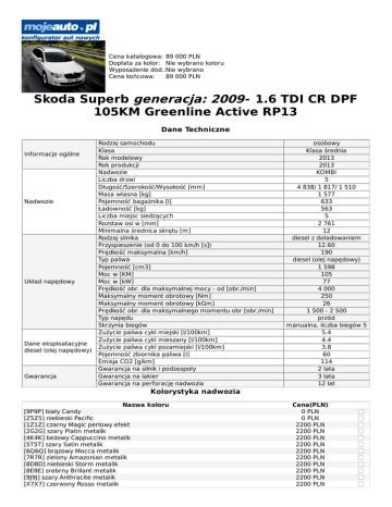 Cena katalogowa: 89 000 PLN Dopłata za kolor: Nie wybrano koloru Wyposażenie dod.:Nie wybrano Cena końcowa: 89 000 PLN Skoda Superb generacja: 2009- 1.6 TDI CR DPF 105KM Greenline Active RP13 Dane Techniczne Informacje ogólne Nadwozie Układ napędowy Dane eksploatacyjne diesel (olej napędowy) Gwarancja Rodzaj samochodu Klasa Rok modelowy Rok produkcji Nadwozie Liczba drzwi Długość/Szerokość/Wysokość [mm] Masa własna [kg] Pojemność bagażnika [l] Ładowność [kg] Liczba miejsc siedzących Rozstaw osi w [mm] Minimalna średnica skrętu [m] Rodzaj silnika Przyspieszenie (od 0 do 100 km/h [s]) Prędkość maksymalna [km/h] Typ paliwa Pojemność [cm3] Moc w [KM] Moc w [kW] Prędkość obr. dla maksymalnej mocy - od [obr./min] Maksymalny moment obrotowy [Nm] Maksymalny moment obrotowy [kGm] Prędkość obr. dla maksymalnego momentu obr [obr./min] Typ napędu Skrzynia biegów Zużycie paliwa cykl miejski [l/100km] Zużycie paliwa cykl mieszany [l/100km] Zużycie paliwa cykl pozamiejski [l/100km] Pojemność zbiornika paliwa [l] Emisja CO2 [g/km] Gwarancja na silnik i podzespoły Gwarancja na lakier Gwarancja na perforację nadwozia osobowy Klasa średnia 2013 2013 KOMBI 5 4 838/ 1 817/ 1 510 1 577 633 563 5 2 761 12 diesel z doładowaniem 12.60 190 diesel (olej napędowy) 1 598 105 77 4 000 250 26 1 500 - 2 500 przód manualna, liczba biegów 5 5.4 4.4 3.8 60 114 2 lata 3 lata 12 lat Kolorystyka nadwozia Nazwa koloru [9P9P] biały Candy [Z5Z5] niebieski Pacific [1Z1Z] czarny Magic perłowy efekt [2G2G] szary Platin metalik [4K4K] beżowy Cappuccino metalik [5T5T] szary Satin metalik [6Q6Q] brązowy Mocca metalik [7R7R] zielony Amazonian metalik [8D8D] niebieski Storm metalik [8E8E] srebrny Brillant metalik [9J9J] szary Anthracite metalik [X7X7] czerwony Rosso metalik Cena(PLN) 0 PLN 0 PLN 2200 PLN 2200 PLN 2200 PLN 2200 PLN 2200 PLN 2200 PLN 2200 PLN 2200 PLN 2200 PLN 2200 PLN Wyposażenie standardowe Nazwa elementu bi-ksenonowe reflektory przednie z funkcją adaptacji świateł AFS (spryskiwacze reflektorów, czujnik deszczu, Maxi-DOT, światła przeciwmgielne z funkcją Corner) boczne poduszki powietrzne z przodu czteroramienna kierownica pokryta skórą czujnik deszczu czujnik parkowania - tył elektrycznie sterowane i podgrzewane lusterka boczne ESP (z ABS, EBV, MSR, ASR, HBA, EDL, ACS, DSR) fotel kierowcy i pasażera z regulacją lędźwiową gniazdo AUX IN w podłokietniku Jumbo Box klimatyzacja manualna Climatic kurtyny powietrzne Light Assistant (Coming home, Leaving home, Tunnel light, Day light) podgrzewane fotele przednie podłokietnik Jumbo Box z wyświetlaczem temperatury i zegarem poduszka chroniąca kolana kierowcy poduszka powietrzna dla kierowcy i pasażera przednie światła przeciwmgielne radioodtwarzacz Swing CD, MP3 (2DIN) relingi dachowe w kolorze czarnym Softtouch - elektromechaniczny system otwierania pokrywy bagażnika spryskiwacze reflektorów przednich stalowe obręcze kół z osłonami Tempel 7Jx16" (4 szt.) system kontroli ciśnienia w oponach tempomat TWINDOOR - system zmiennego otwierania pokrywy bagażnika wyświetlacz Maxi-DOT zagłówki przednie typu WOKS zdalnie sterowany centralny zamek zestaw naprawczy do kół Wyposażenie dodatkowe Lista wyposażenia dodatkowego Cena bi-ksenonowe reflektory przednie z funkcją adaptacji świateł AFS (spryskiwacze reflektorów, 5700 PLN czujnike deszczu, Maxi-DOT, światła przeciwmgielne z funkcją Corner) Climatronic - dwustrefowa klimatyzacja automatyczna 2000 PLN czteroramienna skórzana kierownica 800 PLN czteroramienna skórzana kierownica wielofunkcyjna (obsługuje radioodtwarzacz); wymaga 1300 PLN zamówienia wyświetlacza Maxi-Dot czujnik deszczu 800 PLN czujnik parkowania - przód 1300 PLN fotel kierowcy i pasażera z przodu regulowane na odcinku lędźwiowym 300 PLN obręcze kół ze stopów lekkich Spectrum 7Jx16" (4 szt.) 2500 PLN podgrzewane dysze spryskiwaczy przedniej szyby 100 PLN podgrzewane fotele przednie 1000 PLN podgrzewane fotele przednie i zewnętrzne miejsca tylnej kanapy 2000 PLN podłoga bagażnika z systemem mocującym 800 PLN przednie światła przeciwmgielne z funkcją Corner 500 PLN przygotowanie pod telefon GSM II (Bluetooth) 1900 PLN przygotowanie pod telefon GSM II (Bluetooth); tylko z systemem nawigacji Amundsen+ 1200 PLN radioodtwarzacz Bolero CD, MP3, zintegrowana zmieniarka płyt CD (2DIN) 1300 PLN relingi dachowe w kolorze srebrnym 700 PLN spryskiwacze reflektorów przednich 800 PLN system nawigacji satelitarnej Amundsen+ (2 DIN, CD, SD, MP3) z mapą Europy Zachodniej lub 2900 PLN Wschodniej system nawigacji satelitarnej Columbus (2 DIN, DVD, SD, MP3) z wyświetlaczem Maxi-Dot; 8000 PLN cena opcji nie obejmuje płyty DVD z mapą tempomat 1200 PLN wyświetlacz Maxi-DOT 700 PLN