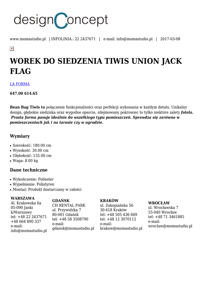 www.momastudio.pl | INFOLINIA.: 22 2437671 | e-mail: [email protected] | 2017-03-08 WOREK DO SIEDZENIA TIWIS UNION JACK FLAG LA FORMA 647.00 614.65 Bean Bag Tiwis to połączenie funkcjonalności oraz perfekcji wykonania w każdym detalu. Unikalny design, głębokie siedziska oraz wygodne oparcie, zdejmowany pokrowiec to tylko niektóre zalety fotela. Prosta forma pasuje idealnie do wszelkiego typu pomieszczeń. Sprawdza się zarówno w pomieszczeniach jak i na tarasie czy w ogrodzie. Wymiary ● ● ● ● Szerokość: 180.00 cm Wysokość: 30.00 cm Głębokość: 135.00 cm Waga: 8.00 kg Dane techniczne ● ● ● Wykończenie: Poliester Wypełnienie: Polistyren Montaż: Produkt dostarczany w całości WARSZAWA Al. Krakowska 6a 05-090 Janki k/Warszawy tel: +48 22 2437671 +48 664 890 337 e-mail: [email protected] GDAŃSK CH RENTAL PARK ul. Przywidzka 7 80-001 Gdańsk tel: +48 58 3508790 e-mail: [email protected] KRAKÓW ul. Zakopiańska 56 30-418 Kraków tel: +48 505 436 669 tel: +48 12 3070112 e-mail: [email protected] WROCŁAW ul. Wrocławska 7 55-040 Wrocław tel: +48 71 3461885 e-mail: [email protected]