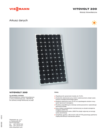 VITOVOLT 200 Moduły fotowoltaiczne 5609 650 4/2012 Arkusz danych VITOVOLT 200 Zalety Typ M190SA, M195SA Monokrystaliczne moduły fotowoltaiczne o mocy znamionowej wyn. 190/195 Wp Do zamiany energii słonecznej na prąd nWspółczynnik Viessmann sp. z o.o. ul. Karkonoska 65 53-015 Wrocław tel.: (071) 36 07100 faks: (071) 36 07101 www.viessmann.com sprawności modułu do 15,3%. właściwości przy niskim nasłonecznieniu dzięki zastosowaniu wiodącej technologii ogniw. nDodatnia tolerancja mocy 0/+5% do zapobiegania stratom mocy ogniw łączonych szeregowo. nPowłoka antyrefleksyjna redukuje zanieczyszczenia i optymalizuje absorpcję światła. nDuży stopień obciążalności mechanicznej na skutek obciążenia śniegiem (5400 Pa) i wiatrem/zasysania wiatru (3800 Pa) dzięki odpornej na korozję ramie aluminiowej. nCertyfikaty zgodne z IEC 61215 i IEC 61730 gwarantują spełnienie międzynarodowych standardów jakości. nZnakomite Dane techniczne Dane techniczne Vitovolt 200 Typ M190SA M195SA Dane dotyczące mocy w STC*1 Moc znamionowa Pmax. Tolerancja mocy Napięcie przy MPP *2 Umpp Natężenie el. przy MPP *2 Umpp Napięcie jałowe Uoc Prąd zwarciowy Isc Współczynnik sprawności modułu Wp % V A V A % 190 0/+5 36,60 5,20 45,20 5,62 14,9 195 0/+5 36,60 5,33 45,50 5,69 15,3 Dane dotyczące mocy przy NOCT *3 Moc Pmax. Napięcie Umpp Natężenie prądu Impp Napięcie jałowe Uoc Prąd zwarciowy Isc Wp V A V A 139 33,1 4,19 41,3 4,56 142 33,2 4,27 41,8 4,61 Redukcja współczynnika sprawności przy 200 W/m2 % < 4,5 < 4,5 Współczynniki temperaturowe Wydajność Napięcie jałowe Prąd zwarciowy %/K %/K %/K –0,45 –0,34 0,05 –0,45 –0,34 0,05 Maksymalne napięcie systemowe V 1000 1000 Maksymalny prąd znamionowy A 15 15 STC = Standard Test Conditions (standardowe warunki kontrolne: Natężenie nasłonecznienia 1000 W/m2, temperatura ogniwa 25°C i liczba masowa atmosfery AM 1,5). *2 MPP = Maximum Power Point (moc maksymalna w warunkach standardowych). *3 NOCT = Nominal Operating Cell Temperature (nominalna temperatura pracy modułu: Natężenie nasłonecznienia 800 W/m2, liczba masowa atmosfery AM 1,5, prędkość wiatru 1 m/s, temperatura otoczenia 20°C). *1 Typ ogniwa: N I K J A Gniazdo przyłączeniowe B Przewody przyłączeniowe C Przyłącze uziemienia (ø 5,1 mm) D Otwory montażowe (14 x 9) Tabela wymiarów a b c d e f g h k mm mm mm mm mm mm mm mm mm 1580 808 758 800 1300 35 35 11 1,5 Liczba ogniw: Tolerancja pomiaru: Folia tylna: Gniazdo przyłączeniowe (Klasa zabezpieczenia): Rama: Monokrystaliczne ogniwo krzemowe 125 x 125 (5 ogniw) 72 (6 x 12) ±3% Polietylen-co-octan winylu (EVA) IP67 Eloksalowany stop aluminiowy, srebro Szyba zewnętrzna: Szkło hartowane o małej zawartości żelaza, 3,2 mm Masa: 15,5 kg Maksymalne obciążenie ciśnieniem: 5400 Pa/3800 Pa Przyłącze: Przewody o dł. 1,0 m i przekroju 4 mm2 ze złączem wtykowym H&S Radox Wymogi statyczne: Konstrukcja dachowa o odpowiedniej wytrzymałości na wiatr Klasa zabezpieczenia: II Klasa zastosowania: A Opakowanie: 26 sztuk na palecie Gwarancja na produkt od producenta zgodnie z kartą gwarancyjną na 10 lat. Wskazówka Warunki gwarancji producenta: www.viessmann.de/Login. Gwarancja wydajności od producenta zgodnie z kartą gwarancyjną n5 lat: 95 % n12 lat: 90 % n18 lat: 85 % n25 lat: 80 % Gwarancja na produkt f-my Viessmann na 5 lat. Potwierdzona jakość Certyfikacja zgodnie z: IEC 61215, IEC 61730 Wyprodukowano w zakładach posiadających certyfikat ISO 9001 i 14001. Oznaczenie CE zgodnie z istniejącymi dyrektywami UE. Zmiany techniczne zastrzeżone!