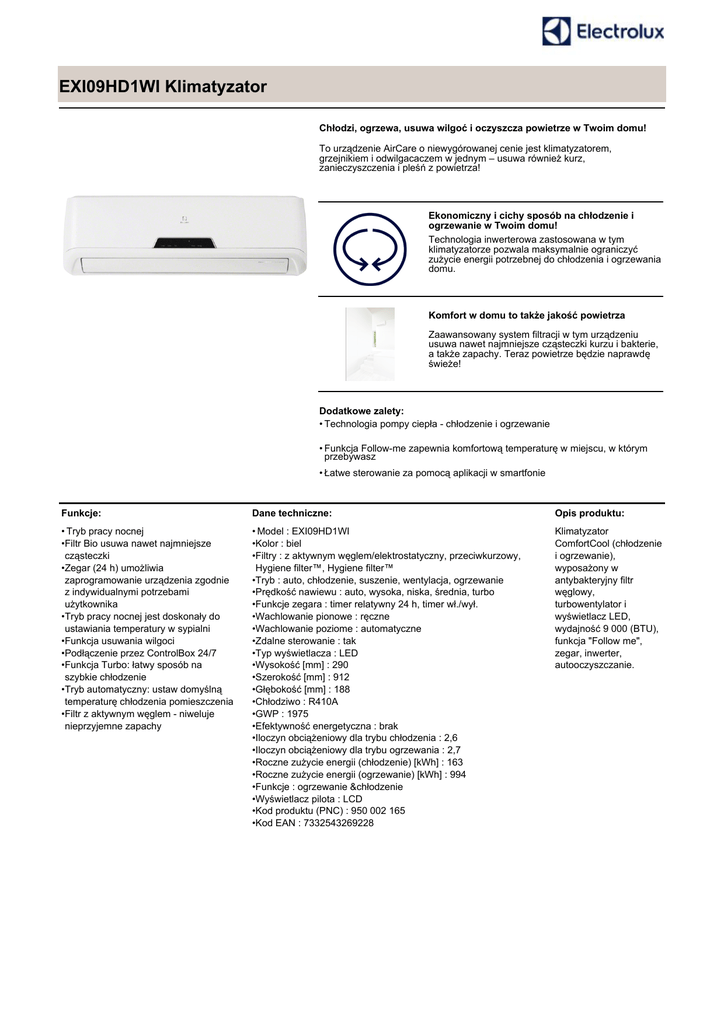EXI09HD1WI Klimatyzator Chłodzi, ogrzewa, usuwa wilgoć i oczyszcza powietrze w Twoim domu! To urządzenie AirCare o niewygórowanej cenie jest klimatyzatorem, grzejnikiem i odwilgacaczem w jednym – usuwa również kurz, zanieczyszczenia i pleśń z powietrza! Ekonomiczny i cichy sposób na chłodzenie i ogrzewanie w Twoim domu! Technologia inwerterowa zastosowana w tym klimatyzatorze pozwala maksymalnie ograniczyć zużycie energii potrzebnej do chłodzenia i ogrzewania domu. Komfort w domu to także jakość powietrza Zaawansowany system filtracji w tym urządzeniu usuwa nawet najmniejsze cząsteczki kurzu i bakterie, a także zapachy. Teraz powietrze będzie naprawdę świeże! Dodatkowe zalety: • Technologia pompy ciepła - chłodzenie i ogrzewanie • Funkcja Follow-me zapewnia komfortową temperaturę w miejscu, w którym przebywasz • Łatwe sterowanie za pomocą aplikacji w smartfonie Funkcje: Dane techniczne: Opis produktu: • Tryb pracy nocnej •Filtr Bio usuwa nawet najmniejsze cząsteczki •Zegar (24 h) umożliwia zaprogramowanie urządzenia zgodnie z indywidualnymi potrzebami użytkownika •Tryb pracy nocnej jest doskonały do ustawiania temperatury w sypialni •Funkcja usuwania wilgoci •Podłączenie przez ControlBox 24/7 •Funkcja Turbo: łatwy sposób na szybkie chłodzenie •Tryb automatyczny: ustaw domyślną temperaturę chłodzenia pomieszczenia •Filtr z aktywnym węglem - niweluje nieprzyjemne zapachy • Model : EXI09HD1WI •Kolor : biel •Filtry : z aktywnym węglem/elektrostatyczny, przeciwkurzowy, Hygiene filter™, Hygiene filter™ •Tryb : auto, chłodzenie, suszenie, wentylacja, ogrzewanie •Prędkość nawiewu : auto, wysoka, niska, średnia, turbo •Funkcje zegara : timer relatywny 24 h, timer wł./wył. •Wachlowanie pionowe : ręczne •Wachlowanie poziome : automatyczne •Zdalne sterowanie : tak •Typ wyświetlacza : LED •Wysokość [mm] : 290 •Szerokość [mm] : 912 •Głębokość [mm] : 188 •Chłodziwo : R410A •GWP : 1975 •Efektywność energetyczna : brak •Iloczyn obciążeniowy dla trybu chłodzenia : 2,6 •Iloczyn obciążeniowy dla trybu ogrzewania : 2,7 •Roczne zużycie energii (chłodzenie) [kWh] : 163 •Roczne zużycie energii (ogrzewanie) [kWh] : 994 •Funkcje : ogrzewanie &chłodzenie •Wyświetlacz pilota : LCD •Kod produktu (PNC) : 950 002 165 •Kod EAN : 7332543269228 Klimatyzator ComfortCool (chłodzenie i ogrzewanie), wyposażony w antybakteryjny filtr węglowy, turbowentylator i wyświetlacz LED, wydajność 9 000 (BTU), funkcja "Follow me", zegar, inwerter, autooczyszczanie.