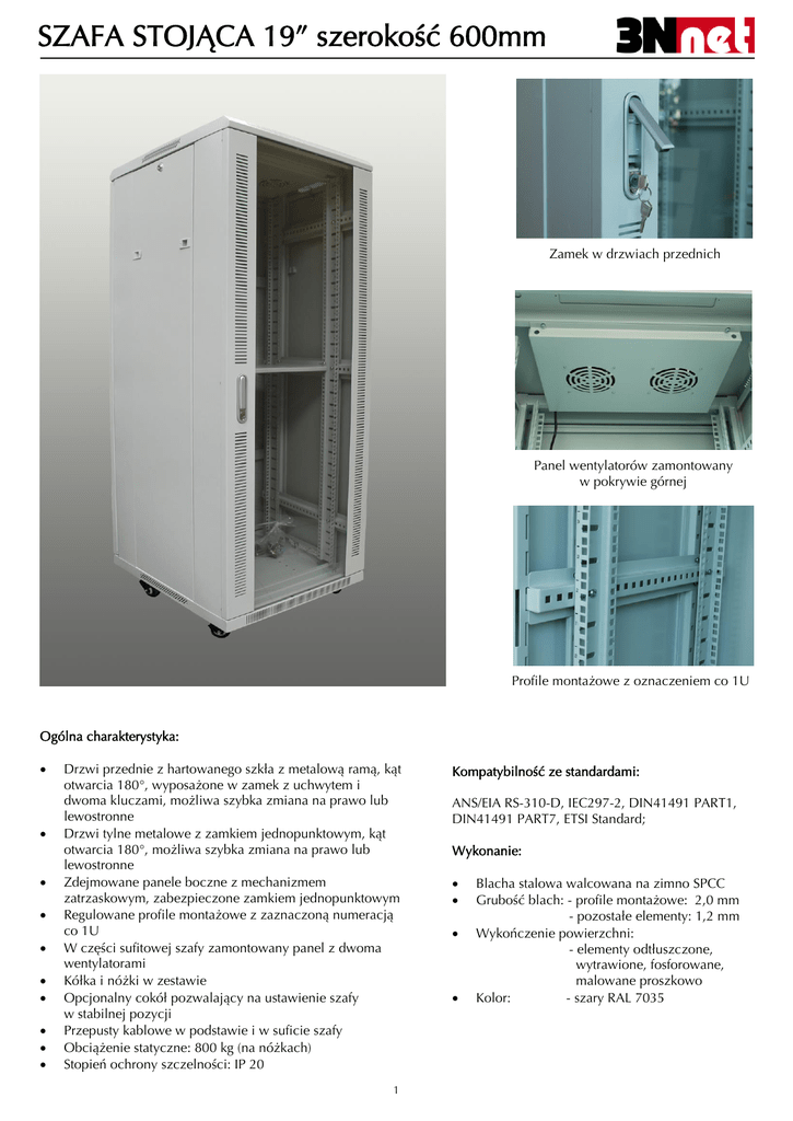 SZAFA STOJĄCA 19” szerokość 600mm Zamek w drzwiach przednich Panel wentylatorów zamontowany w pokrywie górnej Profile montażowe z oznaczeniem co 1U Ogólna charakterystyka: Drzwi przednie z hartowanego szkła z metalową ramą, kąt otwarcia 180°, wyposażone w zamek z uchwytem i dwoma kluczami, możliwa szybka zmiana na prawo lub lewostronne Drzwi tylne metalowe z zamkiem jednopunktowym, kąt otwarcia 180°, możliwa szybka zmiana na prawo lub lewostronne Zdejmowane panele boczne z mechanizmem zatrzaskowym, zabezpieczone zamkiem jednopunktowym Regulowane profile montażowe z zaznaczoną numeracją co 1U W części sufitowej szafy zamontowany panel z dwoma wentylatorami Kółka i nóżki w zestawie Opcjonalny cokół pozwalający na ustawienie szafy w stabilnej pozycji Przepusty kablowe w podstawie i w suficie szafy Obciążenie statyczne: 800 kg (na nóżkach) Stopień ochrony szczelności: IP 20 1 Kompatybilność ze standardami: ANS/EIA RS-310-D, IEC297-2, DIN41491 PART1, DIN41491 PART7, ETSI Standard; Wykonanie: Blacha stalowa walcowana na zimno SPCC Grubość blach: - profile montażowe: 2,0 mm - pozostałe elementy: 1,2 mm Wykończenie powierzchni: - elementy odtłuszczone, wytrawione, fosforowane, malowane proszkowo Kolor: - szary RAL 7035 SZAFA STOJĄCA 19” szerokość 600mm Budowa: 1. 2. 3. 4. 5. 6. 7. 8. 9. 10. 11. Przód bez drzwi Przód – drzwi z szybą Wymiary – profile montaż (rozstaw 19” 1U) Bok Pokrywa górna 2 Pokrywa górna Panel wentylatorów Profil montażowy Poprzeczka montażowa Drzwi przednie z szybą hartowaną Zamek z uchwytem Drzwi tylne z zamkiem jednopunktowym Pokrywa dolna Kółka Rama nośna Panel boczny Tył Pokrywa dolna (wymiary profili montażowych względem obudowy) SZAFA STOJĄCA 19” szerokość 600mm Przepusty kablowe w pokrywie dolnej Kółka i nóżki Dostępne rodzaje: Kod produktu SZAFA-P-60/60-22U/3NNET SZAFA-P-60/80-22U/3NNET SZAFA-P-60/100-22U/3NNET SZAFA-P-60/60-32U/3NNET SZAFA-P-60/80-32U/3NNET SZAFA-P-60/60-42U/3NNET SZAFA-P-60/80-42U/3NNET SZAFA-P-60/100-42U/3NNET Wysokość 22U 22U 22U 32U 32U 42U 42U 42U Wysokość (mm) Szerokość (mm) 1175 600 1175 600 1175 600 1615 600 1615 600 2055 600 2055 600 2055 600 3 Głębokość (mm) Wyposażenie 600 W zestawie: panel - dwa wentylatory dachowe, kółka, nóżki, zestaw elementów montażowych 800 W zestawie: panel - cztery wentylatory dachowe, kółka, nóżki, zestaw elementów montażowych 1000 W zestawie: panel - cztery wentylatory dachowe, kółka, nóżki, zestaw elementów montażowych 600 W zestawie: panel - dwa wentylatory dachowe, kółka, nóżki, zestaw elementów montażowych 800 W zestawie: panel - cztery wentylatory dachowe, kółka, nóżki, zestaw elementów montażowych 600 W zestawie: panel - dwa wentylatory dachowe, kółka, nóżki, zestaw elementów montażowych 800 W zestawie: panel - cztery wentylatory dachowe, kółka, nóżki, zestaw elementów montażowych 1000 W zestawie: panel - cztery wentylatory dachowe, kółka, nóżki, zestaw elementów montażowych
