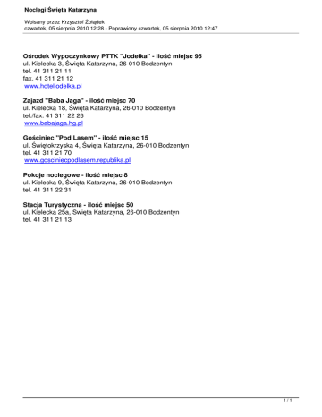 Noclegi Święta Katarzyna Wpisany przez Krzysztof Żołądek czwartek, 05 sierpnia 2010 12:28 - Poprawiony czwartek, 05 sierpnia 2010 12:47 Ośrodek Wypoczynkowy PTTK "Jodełka" - ilość miejsc 95 ul. Kielecka 3, Święta Katarzyna, 26-010 Bodzentyn tel. 41 311 21 11 fax. 41 311 21 12 www.hoteljodelka.pl Zajazd "Baba Jaga" - ilość miejsc 70 ul. Kielecka 18, Święta Katarzyna, 26-010 Bodzentyn tel./fax. 41 311 22 26 www.babajaga.hg.pl Gościniec "Pod Lasem" - ilość miejsc 15 ul. Świętokrzyska 4, Święta Katarzyna, 26-010 Bodzentyn tel. 41 311 21 70 www.gosciniecpodlasem.republika.pl Pokoje noclegowe - ilość miejsc 8 ul. Kielecka 9, Święta Katarzyna, 26-010 Bodzentyn tel. 41 311 22 31 Stacja Turystyczna - ilość miejsc 50 ul. Kielecka 25a, Święta Katarzyna, 26-010 Bodzentyn tel. 41 311 21 13 1/1