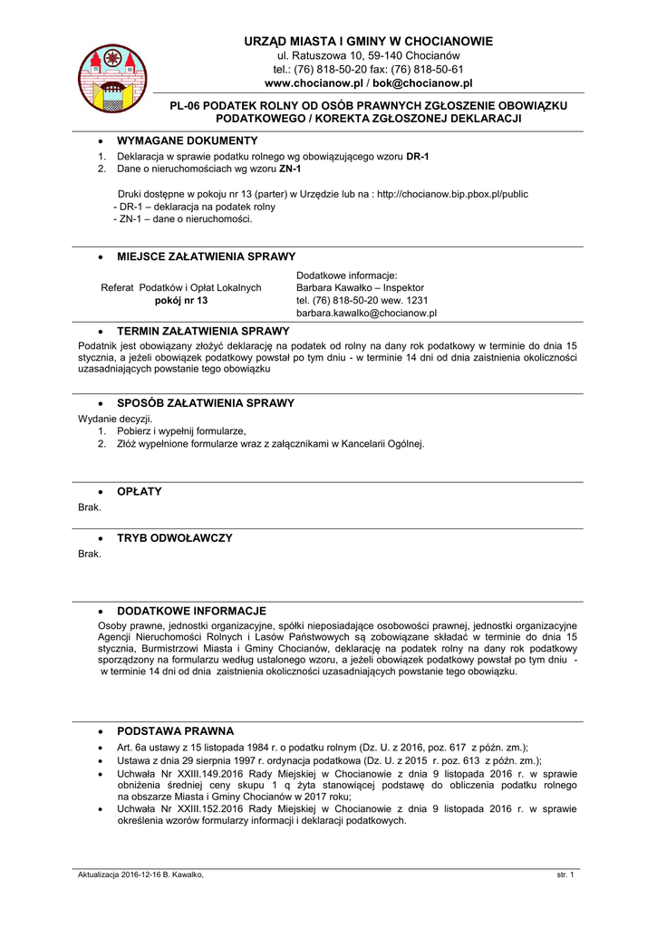 URZĄD MIASTA I GMINY W CHOCIANOWIE ul. Ratuszowa 10, 59-140 Chocianów tel.: (76) 818-50-20 fax: (76) 818-50-61 www.chocianow.pl / [email protected] PL-06 PODATEK ROLNY OD OSÓB PRAWNYCH ZGŁOSZENIE OBOWIĄZKU PODATKOWEGO / KOREKTA ZGŁOSZONEJ DEKLARACJI WYMAGANE DOKUMENTY 1. 2. Deklaracja w sprawie podatku rolnego wg obowiązującego wzoru DR-1 Dane o nieruchomościach wg wzoru ZN-1 Druki dostępne w pokoju nr 13 (parter) w Urzędzie lub na : http://chocianow.bip.pbox.pl/public - DR-1 – deklaracja na podatek rolny - ZN-1 – dane o nieruchomości. MIEJSCE ZAŁATWIENIA SPRAWY Referat Podatków i Opłat Lokalnych pokój nr 13 Dodatkowe informacje: Barbara Kawałko – Inspektor tel. (76) 818-50-20 wew. 1231 [email protected] TERMIN ZAŁATWIENIA SPRAWY Podatnik jest obowiązany złożyć deklarację na podatek od rolny na dany rok podatkowy w terminie do dnia 15 stycznia, a jeżeli obowiązek podatkowy powstał po tym dniu - w terminie 14 dni od dnia zaistnienia okoliczności uzasadniających powstanie tego obowiązku SPOSÓB ZAŁATWIENIA SPRAWY Wydanie decyzji. 1. Pobierz i wypełnij formularze, 2. Złóż wypełnione formularze wraz z załącznikami w Kancelarii Ogólnej. OPŁATY Brak. TRYB ODWOŁAWCZY Brak. DODATKOWE INFORMACJE Osoby prawne, jednostki organizacyjne, spółki nieposiadające osobowości prawnej, jednostki organizacyjne Agencji Nieruchomości Rolnych i Lasów Państwowych są zobowiązane składać w terminie do dnia 15 stycznia, Burmistrzowi Miasta i Gminy Chocianów, deklarację na podatek rolny na dany rok podatkowy sporządzony na formularzu według ustalonego wzoru, a jeżeli obowiązek podatkowy powstał po tym dniu w terminie 14 dni od dnia zaistnienia okoliczności uzasadniających powstanie tego obowiązku. PODSTAWA PRAWNA Art. 6a ustawy z 15 listopada 1984 r. o podatku rolnym (Dz. U. z 2016, poz. 617 z późn. zm.); Ustawa z dnia 29 sierpnia 1997 r. ordynacja podatkowa (Dz. U. z 2015 r. poz. 613 z późn. zm.); Uchwała Nr XXIII.149.2016 Rady Miejskiej w Chocianowie z dnia 9 listopada 2016 r. w sprawie obniżenia średniej ceny skupu 1 q żyta stanowiącej podstawę do obliczenia podatku rolnego na obszarze Miasta i Gminy Chocianów w 2017 roku; Uchwała Nr XXIII.152.2016 Rady Miejskiej w Chocianowie z dnia 9 listopada 2016 r. w sprawie określenia wzorów formularzy informacji i deklaracji podatkowych. Aktualizacja 2016-12-16 B. Kawalko, str. 1