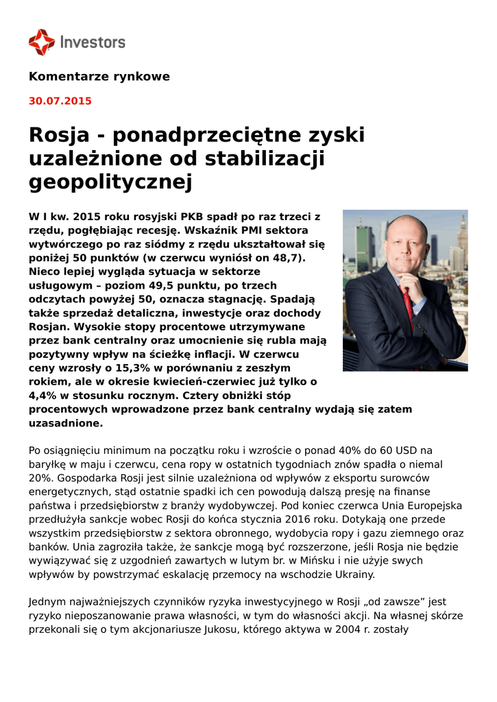 Komentarze rynkowe 30.07.2015 Rosja - ponadprzeciętne zyski uzależnione od stabilizacji geopolitycznej W I kw. 2015 roku rosyjski PKB spadł po raz trzeci z rzędu, pogłębiając recesję. Wskaźnik PMI sektora wytwórczego po raz siódmy z rzędu ukształtował się poniżej 50 punktów (w czerwcu wyniósł on 48,7). Nieco lepiej wygląda sytuacja w sektorze usługowym – poziom 49,5 punktu, po trzech odczytach powyżej 50, oznacza stagnację. Spadają także sprzedaż detaliczna, inwestycje oraz dochody Rosjan. Wysokie stopy procentowe utrzymywane przez bank centralny oraz umocnienie się rubla mają pozytywny wpływ na ścieżkę inflacji. W czerwcu ceny wzrosły o 15,3% w porównaniu z zeszłym rokiem, ale w okresie kwiecień-czerwiec już tylko o 4,4% w stosunku rocznym. Cztery obniżki stóp procentowych wprowadzone przez bank centralny wydają się zatem uzasadnione. Po osiągnięciu minimum na początku roku i wzroście o ponad 40% do 60 USD na baryłkę w maju i czerwcu, cena ropy w ostatnich tygodniach znów spadła o niemal 20%. Gospodarka Rosji jest silnie uzależniona od wpływów z eksportu surowców energetycznych, stąd ostatnie spadki ich cen powodują dalszą presję na finanse państwa i przedsiębiorstw z branży wydobywczej. Pod koniec czerwca Unia Europejska przedłużyła sankcje wobec Rosji do końca stycznia 2016 roku. Dotykają one przede wszystkim przedsiębiorstw z sektora obronnego, wydobycia ropy i gazu ziemnego oraz banków. Unia zagroziła także, że sankcje mogą być rozszerzone, jeśli Rosja nie będzie wywiązywać się z uzgodnień zawartych w lutym br. w Mińsku i nie użyje swych wpływów by powstrzymać eskalację przemocy na wschodzie Ukrainy. Jednym najważniejszych czynników ryzyka inwestycyjnego w Rosji „od zawsze” jest ryzyko nieposzanowanie prawa własności, w tym do własności akcji. Na własnej skórze przekonali się o tym akcjonariusze Jukosu, którego aktywa w 2004 r. zostały skonfiskowane w wyniku oskarżeń o niepłacenie podatków. Po ponad 10-letniej batalii w sądach arbitrażowych, byłym akcjonariuszom Jukosu przyznano odszkodowanie w wysokości 50 mld USD. W czerwcu tego roku władze w Belgii i Francji przystąpiły do zajmowania rachunków bankowych oraz nieruchomości należących do Federacji Rosyjskiej oraz rosyjskich przedsiębiorstw państwowych. Szacuje się, że to zajęte aktywa mogą przynieść ok. 2 mld USD. Choć to niewielka część przyznanego akcjonariuszom odszkodowania, to można mieć nadzieję, że takie działania spowodują, że władze w Rosji będą nieco bardziej skłonne przestrzegać prawa międzynarodowego. Indeks giełdy rosyjskiej Micex zyskał w pierwszej połowie roku ponad 18%, co w połączeniu z umocnieniem się rubla o 4%, dało niemal 24% zysku - drugi najlepszy wynik po indeksie giełdy w Szanghaju. Wyceny według wskaźników fundamentalnych plasują ten rynek pośród trzech najtańszych rynków na świecie, ale jest to odzwierciedleniem ryzyka politycznego i uzależnienia gospodarki od zmiennych i spadających w ostatnich miesiącach surowców. Podsumowując, inwestycje w Rosji mogą zachęcić inwestorów niskimi wycenami, ale realizacja ponadprzeciętnych zysków jest uzależniona od stabilizacji geopolitycznej, a w szczególności od rozwiązania problemu wschodniej Ukrainy, co pozwoliłoby na normalizację relacji z Unią Europejską. Maciej Kołodziejczyk Zarządzający Funduszami Interesują Cię bieżące informacje o rynkach wschodzących? Zapraszamy do zapoznania się z opiniami i prognozami ekspertów na temat gospodarki i rynków kapitałowych krajów rozwijających się, w szczególności Turcji, Brazylii, Rosji, Indii, Chin. Komentarze rynków wschodzących Kup fundusze inwestujące na rynku rosyjskim. Teraz 0% opłat! Investor Rosja Kup fundusz Investor BRIC Kup fundusz Investor Zrównoważony Rynków Wschodzących Kup fundusz