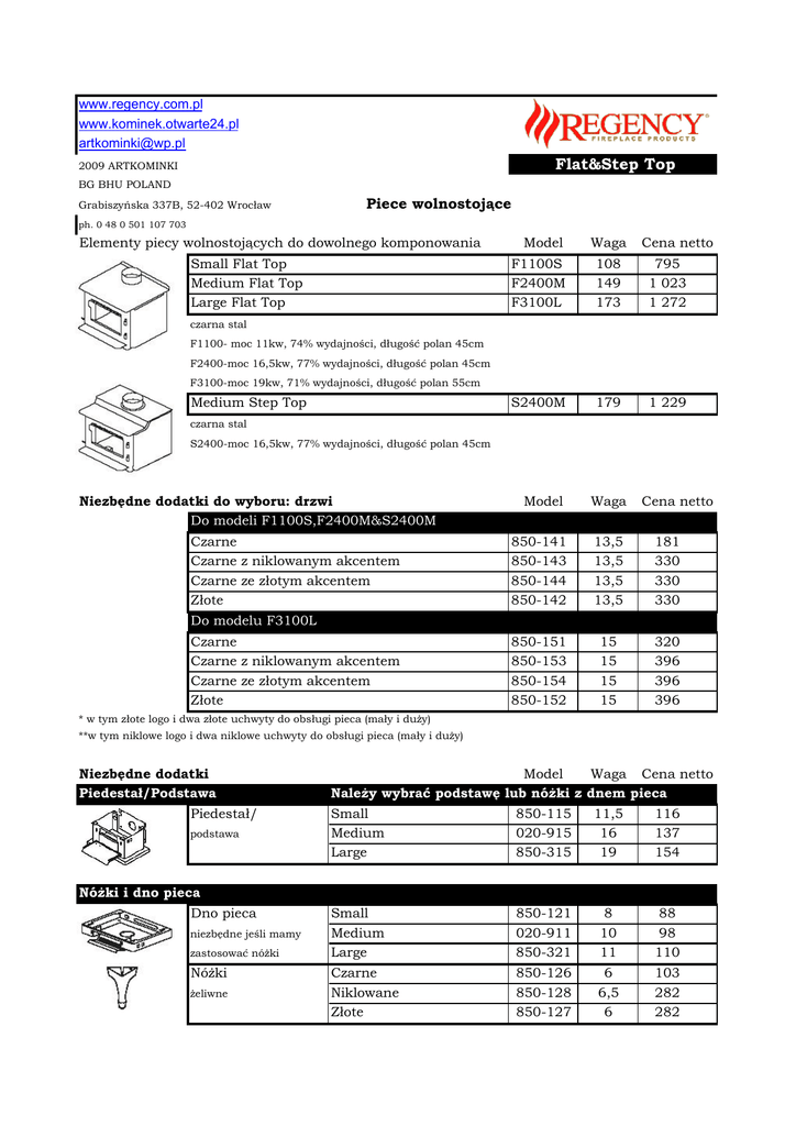 www.regency.com.pl www.kominek.otwarte24.pl [email protected] Flat&Step Top 2009 ARTKOMINKI BG BHU POLAND Grabiszyńska 337B, 52-402 Wrocław Piece wolnostojące ph. 0 48 0 501 107 703 Elementy piecy wolnostojących do dowolnego komponowania Small Flat Top Medium Flat Top Large Flat Top Model Waga Cena netto F1100S F2400M F3100L 108 149 173 795 1 023 1 272 S2400M 179 1 229 czarna stal F1100- moc 11kw, 74% wydajności, długość polan 45cm F2400-moc 16,5kw, 77% wydajności, długość polan 45cm F3100-moc 19kw, 71% wydajności, długość polan 55cm Medium Step Top czarna stal S2400-moc 16,5kw, 77% wydajności, długość polan 45cm Niezbędne dodatki do wyboru: drzwi Do modeli F1100S,F2400M&S2400M Czarne Czarne z niklowanym akcentem Czarne ze złotym akcentem Złote Model Waga Cena netto 850-141 850-143 850-144 850-142 13,5 13,5 13,5 13,5 181 330 330 330 850-151 850-153 850-154 850-152 15 15 15 15 320 396 396 396 Do modelu F3100L Czarne Czarne z niklowanym akcentem Czarne ze złotym akcentem Złote * w tym złote logo i dwa złote uchwyty do obsługi pieca (mały i duży) **w tym niklowe logo i dwa niklowe uchwyty do obsługi pieca (mały i duży) Niezbędne dodatki Piedestał/Podstawa Piedestał/ podstawa Model Waga Cena netto Należy wybrać podstawę lub nóżki z dnem pieca Small Medium Large 850-115 020-915 850-315 11,5 16 19 116 137 154 Small Medium Large 850-121 020-911 850-321 8 10 11 88 98 110 Czarne Niklowane Złote 850-126 850-128 850-127 6 6,5 6 103 282 282 Nóżki i dno pieca Dno pieca niezbędne jeśli mamy zastosować nóżki Nóżki żeliwne 2008 ART-KOM Cennik detaliczny netto Piece wolnostojące - Akcesoria Model Zestaw ozdób niklowych 850-138 Waga Cena 0,3 34 846-513 6 220 otwartego Small or Medium Large 846-101 846-103 2,5 2,5 92 92 Dodatkowy płaszcz konwekcyjny Small or Medium Large 850-105 850-305 9 11,5 72 79 Popielnik do piedestału do nóżek 850-100 850-101 5 3,5 88 88 dwa zawiasy obejmujące z niklu i dwa niklowe uchwyty do obsługi pieca Wentylator 240V z termostatem Siatka do kominka 2008 ART-KOM Cennik detaliczny netto ART-KOM Artur Doliński Grabiszyńska 337B, 52-402 Wrocław Wkłady kominkowe Model Small insert I1100S Cena netto w Euro 117,5 891 Waga czarna stal I1100-moc 11kw, 73,8% wydajności, długość polan 45cm Medium insert Large insert I2400M I3100L 187 211 1 348 1 435 H2100M 157 1 247 Model Waga 850-141 850-143 850-144 850-142 13,5 13,5 13,5 13,5 181 330 330 330 850-151 850-153 850-154 850-152 15 15 15 15 320 396 396 396 7 10 9 12 10 13 8 12 117 137 121 148 132 157 121 148 czarna stal, jedna czarna kratka (163-930) I2400-moc 16,5kw, 77% wydajności, długość polan 45cm I310-moc 19kw, 71% wydajności, długość polan 55cm Hearth Heater czarna stal H2100-moc 18kw,72% wydajności, długość polan 45cm Niezbędne dodatki: drzwi Do modelu I1100S Czarne Czarne z niklowanym akcentem ** Czarne ze złotym akcentem * Złote Cena netto Do modelu I2400M,I3100L&H2100M Czarne Czarne z niklowanym akcentem ** Czarne ze złotym akcentem * Gold/Zlaté* * w tym złote logo i dwa złote uchwyty do obsługi pieca (mały i duży) **w tym niklowe logo i dwa niklowe uchwyty do obsługi pieca (mały i duży) Maskownica (czarna z czarnymi listwami) Rozmiary płyt (wys/szer w mm) Small (I1100S) Medium (I2400M) Large (I3100L) Hearth Heater (H2100M) Normalny (650/900) Powiększony (750/1050) Normalny (800/1000) Powiększony (825/1200) Normalny (800/1100) Powiększony(850/1250) Normalny (800/1000) Powiększony(825/1200) Standard Adaptor/kouř.adaptér-přímý Offset Adaptor/kouř.adaptér-vybočený 170-911 170-913 140-911 140-913 163-910 163-912 120-910 120-912 45 78 2008 ART-KOM Cennik detaliczny netto Wkłady kominkowe - Akcesoria Model Waga Cena netto Included 63 63 Boczne kratki Boczne kratki do wkładów kominkowych I2400M i I3100L Boczne kratki Czarne Niklowe Złote 163-930 163-931 163-932 0,5 0,5 0,5 Wentylator 240V I1100-Small H2100M-Heart Heater 170-919 120-920 5 6,5 220 220 Wentylator 240V I2400M - Medium I3100L - Large 142-920 163-920 6 7,5 220 220 850-138 0,3 34 170-914 170-916 180-914 180-916 163-914 163-916 120-914 120-916 1 1 1 1 1 1 1 1 54 54 54 54 54 54 54 54 Black / černé Brushed Ni/Brouš.Ni Gold / zlaté 850-126 850-128 850-127 6 6,5 6 103 182 182 I1100 - Small I2400 - Medium I3100 - Large 846-101 846-102 846-103 2,5 2,5 2,5 92 92 92 Wentylator dwubiegowy, czarny Zestaw ozdób niklowych dwa niklowe zawiasy obejmujące i dwa niklowe uchwyty do obsługi pieca Złote listwy do maskownicy I1100 listwy Do normalnej(170-911) Do powiększonej(170-913) I2400 listwy Do normalnej(140-911) Do powiększonej(140-913) I3100 listwy Do normalnej(163-910) Do powiększonej(163-912) H2100 listwy Do normalnej(120-910) Do powiększonej(120-912) Nóżki tylko do modelu Hearth Heater H2100M Nóżki żeliwne Siatka do kominka otwartego Siatka do kominka otwartego Siatka nie nadaje się do modelu H2100M 2008 ART-KOM Cennik detaliczny netto ART-KOM Artur Doliński Grabiszyńska 337B, 52-402 Wrocław Duże wkłady kominkowe Model Warmhearth Z2510 Z czarnymi drzwiami Ze złotymi drzwiami Z2510LB Z2510LG Waga Cena netto 350 350 2 693 2 920 009-914 009-916 5,5 5,5 79 228 Dwubiegowy wentylator Termostat 000-913 000-918 4 14 220 83 Warmhearth FP90 Z czarnymi drzwiami FP90B 325 2 859 001-931 001-933 5,5 5,5 226 316 000-917 001-911 001-943 4 7 217 88 90 czarna stal i czarne drzwi, zabezpieczenie przed wypadaniem polan Z2510-moc 16,5kw, 70,7% wydajności, długość polan 55cm 180mm fi rury spalinowej Niezbędne dodatki Żaluzje Żaluzje Czarne Złote Akcesoria czarna stal, podwójne czarne drzwi, zabezpieczenie przed wypadaniem polan R90-moc 16,5kw, 70,7% wydajności, długość polan 55cm 200mm fi rury spalinowej Niezbędne dodatki Żaluzje Żaluzje Czarne Czarno-złote Akcesoria Akcesoria Dwubiegowy wentylator Popielnik Siatka do kominka otwartego