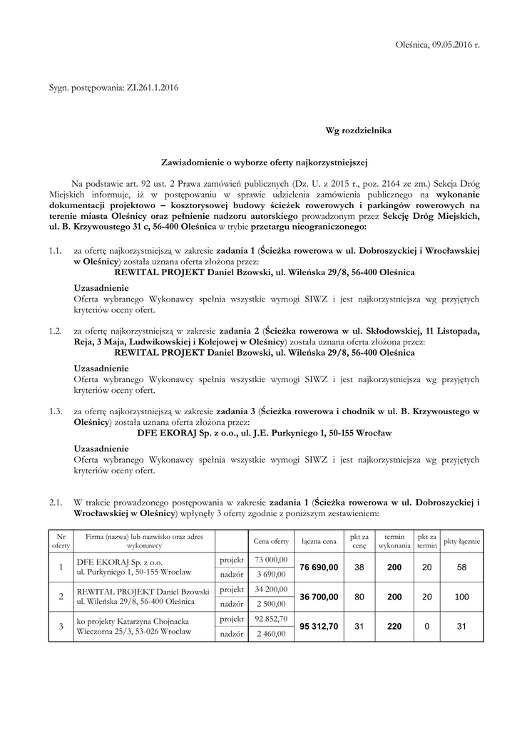 Oleśnica, 09.05.2016 r. Sygn. postępowania: ZI.261.1.2016 Wg rozdzielnika Zawiadomienie o wyborze oferty najkorzystniejszej Na podstawie art. 92 ust. 2 Prawa zamówień publicznych (Dz. U. z 2015 r., poz. 2164 ze zm.) Sekcja Dróg Miejskich informuje, iż w postępowaniu w sprawie udzielenia zamówienia publicznego na wykonanie dokumentacji projektowo – kosztorysowej budowy ścieżek rowerowych i parkingów rowerowych na terenie miasta Oleśnicy oraz pełnienie nadzoru autorskiego prowadzonym przez Sekcję Dróg Miejskich, ul. B. Krzywoustego 31 c, 56-400 Oleśnica w trybie przetargu nieograniczonego: 1.1. za ofertę najkorzystniejszą w zakresie zadania 1 (Ścieżka rowerowa w ul. Dobroszyckiej i Wrocławskiej w Oleśnicy) została uznana oferta złożona przez: REWITAL PROJEKT Daniel Bzowski, ul. Wileńska 29/8, 56-400 Oleśnica Uzasadnienie Oferta wybranego Wykonawcy spełnia wszystkie wymogi SIWZ i jest najkorzystniejsza wg przyjętych kryteriów oceny ofert. 1.2. za ofertę najkorzystniejszą w zakresie zadania 2 (Ścieżka rowerowa w ul. Skłodowskiej, 11 Listopada, Reja, 3 Maja, Ludwikowskiej i Kolejowej w Oleśnicy) została uznana oferta złożona przez: REWITAL PROJEKT Daniel Bzowski, ul. Wileńska 29/8, 56-400 Oleśnica Uzasadnienie Oferta wybranego Wykonawcy spełnia wszystkie wymogi SIWZ i jest najkorzystniejsza wg przyjętych kryteriów oceny ofert. 1.3. za ofertę najkorzystniejszą w zakresie zadania 3 (Ścieżka rowerowa i chodnik w ul. B. Krzywoustego w Oleśnicy) została uznana oferta złożona przez: DFE EKORAJ Sp. z o.o., ul. J.E. Purkyniego 1, 50-155 Wrocław Uzasadnienie Oferta wybranego Wykonawcy spełnia wszystkie wymogi SIWZ i jest najkorzystniejsza wg przyjętych kryteriów oceny ofert. 2.1. Nr oferty W trakcie prowadzonego postępowania w zakresie zadania 1 (Ścieżka rowerowa w ul. Dobroszyckiej i Wrocławskiej w Oleśnicy) wpłynęły 3 oferty zgodnie z poniższym zestawieniem: Firma (nazwa) lub nazwisko oraz adres wykonawcy Cena oferty 1 DFE EKORAJ Sp. z o.o. ul. Purkyniego 1, 50-155 Wrocław projekt 73 000,00 nadzór 3 690,00 2 REWITAL PROJEKT Daniel Bzowski ul. Wileńska 29/8, 56-400 Oleśnica projekt 34 200,00 nadzór 2 500,00 3 ko projekty Katarzyna Chojnacka Wieczorna 25/3, 53-026 Wrocław projekt 92 852,70 nadzór 2 460,00 łączna cena pkt za cenę termin pkt za pkty łącznie wykonania termin 76 690,00 38 200 20 58 36 700,00 80 200 20 100 95 312,70 31 220 0 31 2.2. Nr oferty W trakcie prowadzonego postępowania w zakresie zadania 2 (Ścieżka rowerowa w ul. Skłodowskiej, 11 Listopada, Reja, 3 Maja, Ludwikowskiej i Kolejowej w Oleśnicy) wpłynęły 2 oferty zgodnie z poniższym zestawieniem: Firma (nazwa) lub nazwisko oraz adres wykonawcy Cena oferty 1 DFE EKORAJ Sp. z o.o. ul. Purkyniego 1, 50-155 Wrocław projekt 121 770,00 nadzór 6 088,50 2 REWITAL PROJEKT Daniel Bzowski ul. Wileńska 29/8, 56-400 Oleśnica projekt 51 950,00 nadzór 3 000,00 2.3. Nr oferty łączna cena pkt za cenę termin pkt za pkty łącznie wykonania termin 127 858,50 34 200 20 54 54 950,00 80 200 20 100 W trakcie prowadzonego postępowania w zakresie zadania 3 (Ścieżka rowerowa i chodnik w ul. B. Krzywoustego w Oleśnicy) wpłynęły 2 oferty zgodnie z poniższym zestawieniem: Firma (nazwa) lub nazwisko oraz adres wykonawcy Cena oferty 1 DFE EKORAJ Sp. z o.o. ul. Purkyniego 1, 50-155 Wrocław projekt 135 300,00 nadzór 6 765,00 2 ko projekty Katarzyna Chojnacka Wieczorna 25/3, 53-026 Wrocław projekt 143 282,70 nadzór 2 460,00 łączna cena pkt za cenę termin pkt za pkty łącznie wykonania termin 142 065,00 80 200 20 100 145 742,70 78 220 0 78
