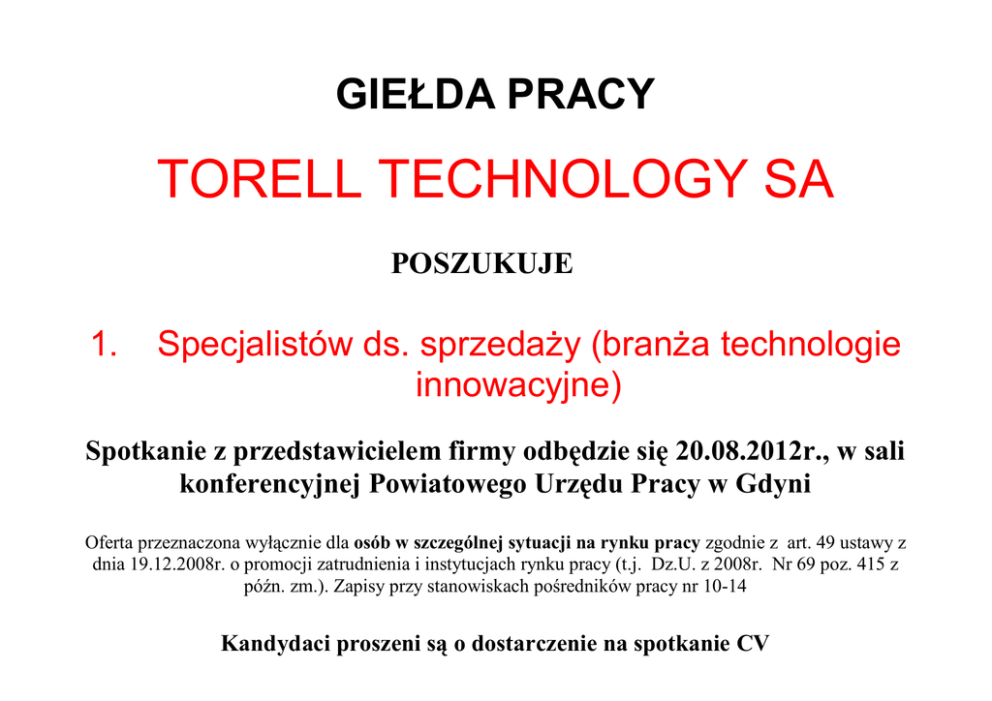 GIEŁDA PRACY TORELL TECHNOLOGY SA POSZUKUJE 1. Specjalistów ds. sprzedaży (branża technologie innowacyjne) Spotkanie z przedstawicielem firmy odbędzie się 20.08.2012r., w sali konferencyjnej Powiatowego Urzędu Pracy w Gdyni Oferta przeznaczona wyłącznie dla osób w szczególnej sytuacji na rynku pracy zgodnie z art. 49 ustawy z dnia 19.12.2008r. o promocji zatrudnienia i instytucjach rynku pracy (t.j. Dz.U. z 2008r. Nr 69 poz. 415 z późn. zm.). Zapisy przy stanowiskach pośredników pracy nr 10-14 Kandydaci proszeni są o dostarczenie na spotkanie CV Do udziału w pracach interwencyjnych uprawnieni są wyłącznie bezrobotni określeni w art. 49 ustawy z dnia 19.12.2008r. o promocji zatrudnienia i instytucjach rynku pracy (Tekst jednolity Dz.U. z 2008r. Nr 69 poz. 415 z późn. zm.) jako „osoby będące w szczególnie trudnej sytuacji na rynku pracy” i Rozporządzeniu Komisji (WE) Nr 800/2008 z dnia 6 sierpnia 2008r. uznające niektóre rodzaje pomocy za zgodne ze wspólnym rynkiem w zastosowaniu art. 87 i 88 tj.: bezrobotni do 25 roku życia (jeśli były bez (***)stałego zatrudnienia za wynagrodzeniem w okresie sześciu miesięcy), bezrobotnych długotrwale – rejestracja w Powiatowym Urzędzie Pracy łącznie ponad 12 miesięcy (albo po zakończeniu realizacji kontraktu socjalnego lub kobiet, które nie podjęły zatrudnienia po urodzeniu dziecka, jeśli były bez stałego zatrudnienia za wynagrodzeniem w okresie sześciu miesięcy), bezrobotni powyżej 50 roku życia, bezrobotni bez kwalifikacji zawodowych (wykształcenie podstawowe, bez ( np. prawa jazdy, i innych dyplomów zaświadczeń świadczących o zdobytych kwalifikacjach między innymi - książeczka spawacza) bez doświadczenia zawodowego lub bez wykształcenia średniego (jeśli były bez stałego zatrudnienia za wynagrodzeniem w okresie sześciu miesięcy), jest osoba dorosłą mieszkającą samotnie, mającą na utrzymaniu co najmniej jedną osobę- (dot. pomocy publicznej dla przedsiębiorców), natomiast bezrobotni samotnie wychowujący co najmniej jedno dziecko do 18 roku życia (dot. w przypadku pracodawcy, który nie podlega pomocy publicznej) bezrobotnych, którzy po odbyciu kary pozbawienia wolności nie podjęli zatrudnienia ( jeśli były bez (***)stałego zatrudnienia za wynagrodzeniem w okresie sześciu miesięcy), bezrobotni niepełnosprawni ( w przypadku pracodawcy, który nie podlega pomocy publicznej) w przypadku pracodawcy, który podlegania pomocy publicznej ( jeśli były bez stałego zatrudnienia za wynagrodzeniem w okresie sześciu miesięcy), jeśli były bez (***)stałego zatrudnienia za wynagrodzeniem w okresie sześciu miesięcy), ● pracuje w sektorze lub zawodzie w państwie członkowskim, w którym dysproporcja kobiet i mężczyzn jest co najmniej o 25% większa niż średnia dysproporcja we wszystkich sektorach gospodarki w tym państwie członkowskim i należy do tej grupy stanowiącej mniejszość; lub jeśli były bez (***)stałego zatrudnienia za wynagrodzeniem w okresie sześciu miesięcy), ● jest członkiem mniejszości etnicznej w państwie członkowskim, który w celu zwiększenia szans na uzyskanie do stałego zatrudnienia musi poprawić znajomość języka, uzupełnić szkolenia zawodowe lub zwiększyć doświadczenie zawodowe; (*) „pracownik znajdujący się w szczególnie niekorzystnej sytuacji” oznacza każdą osobę, która: - jest bez stałego zatrudnienia za wynagrodzeniem w okresie sześciu miesięcy; lub - nie ma wykształcenia ponadgimnazjalnego lub zawodowego; lub - jest wieku ponad 50 lat; lub - jest osoba dorosłą mieszkającą samotnie, mającą na utrzymaniu co najmniej jedną osobę; lub - pracuje w sektorze lub zawodzie w państwie członkowskim, w którym dysproporcja kobiet i mężczyzn jest co najmniej o 25% większa niż średnia dysproporcja we wszystkich sektorach gospodarki w tym państwie członkowskim i należy do tej grupy stanowiącej mniejszość; lub - jest członkiem mniejszości etnicznej w państwie członkowskim, który w celu zwiększenia szans na uzyskanie do stałego zatrudnienia musi poprawić znajomość języka, uzupełnić szkolenia zawodowe lub zwiększyć doświadczenie zawodowe; (**) „pracownik znajdujący się w bardzo niekorzystnej sytuacji” oznacza każdą osobę, która jest bezrobotna przez co najmniej 24 miesiące. (***) stałe zatrudnienie – jest to zatrudnienie na podstawie umowy o pracę.