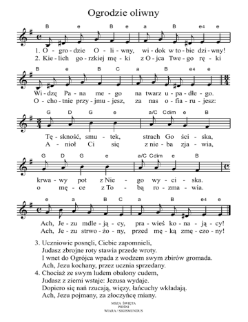 Ogrodzie oliwny # c B j ej j B & j œ œ œ #œ œ j j j œ œ œ # œj œ e a œ B e4 e œ 1. O - gro - dzie O - li - wny, wi - dok w to - bie dzi - wny! 2. Kie - lich go - rzkiej mę - ki z O - jca Twe - go rę - ki # j & j # œj œj œ œ B e B C œ œ Wi - dzę Pa - na me - go O - cho - tnie przy - jmu - jesz, # 3 Gj & 4 œ j œ D G j j œ œ œj # œj œ a j œ e œ & j œ G j œ D G œ krwa - wy pot o mę - ce a/C œ j j œ œ a/C Cdim œ # c ej œ aj j B œ J œ œ œ & C œ 43 e œ j e œ œ Cdim strach Go z nie - ba e z Nie z To e4 na twarz u - pa - dłe - go. za nas o - fia - ru - jesz: Tę - skność, smu - tek, A - nioł Ci się # B go bą j œ a B œ ści - ska, zja - wia, e B œ œ c wy - ci - ska. ro - zma - wia. j œ œj # œj œ B e4 e œ Ach, Je - zu mdle - ją - cy, pra - wieś ko - na - ją - cy! Ach, Je - zu strwo - żo - ny, przed mę - ką zmę - czo - ny! 3. Uczniowie posnęli, Ciebie zapomnieli, Judasz zbrojne roty stawia przede wroty. I wnet do Ogrójca wpada z wodzem swym zbirów gromada. Ach, Jezu kochany, przez ucznia sprzedany. 4. Chociaż ze swym ludem obalony cudem, Judasz z ziemi wstaje: Jezusa wydaje. Dopiero się nań rzucają, więzy, łańcuchy wkładają. Ach, Jezu pojmany, za złoczyńcę miany. MSZA ŚWIĘTA PIEŚNI WIARA / SIGISMUNDUS