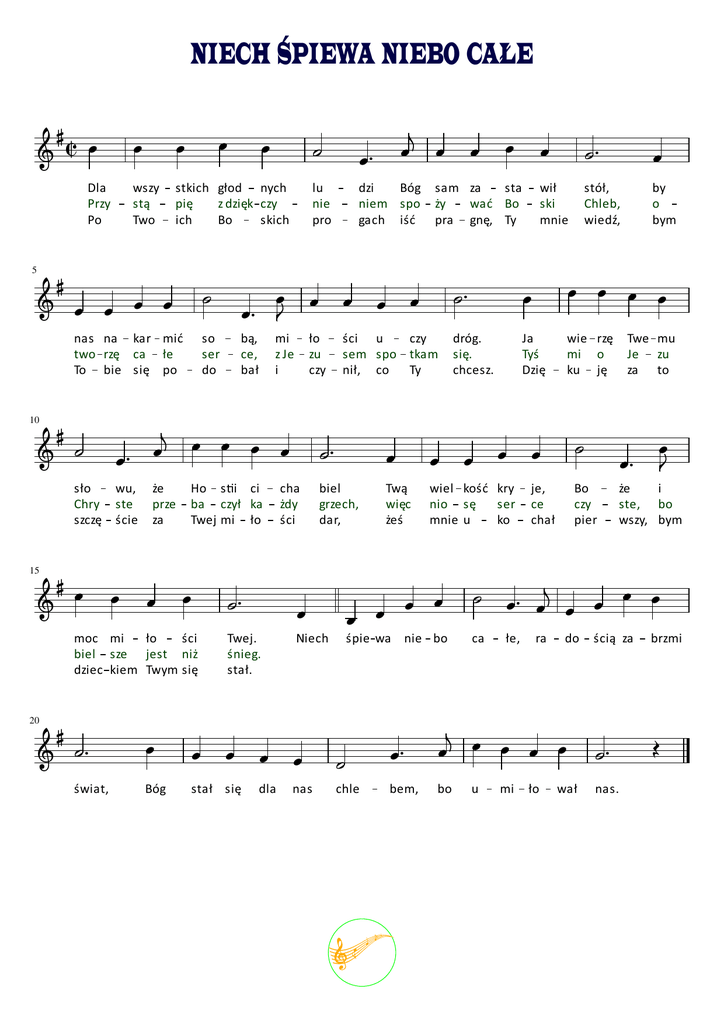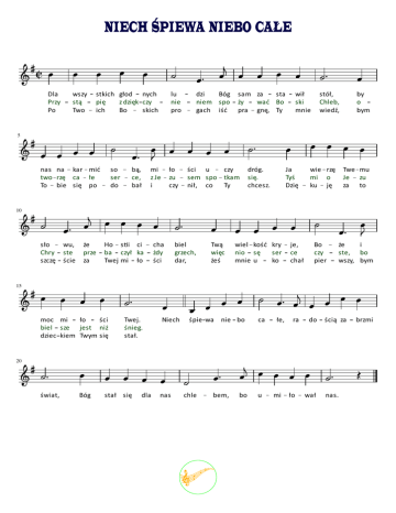 NIECH ŚPIEWA NIEBO CAŁE Dla Przy Po wszy stą Two stkich głod nych pię z dzięk czy ich Bo skich lu nie pro dzi Bóg niem spo gach iść sam za sta ży wać Bo pra gnę, Ty wił ski mnie stół, Chleb, wiedź, by o bym 5 nas na kar mić two rzę ca łe To bie się po so ser do bą, ce, bał ło zu czy ści u czy sem spo tkam nił, co Ty mi z Je i dróg. się. chcesz. Ja Tyś Dzię wie rzę mi o ku ję Twe mu Je zu za to 10 sło Chry szczę wu, ste ście Ho s i ci ba czył ka Twej mi ło że prze za cha żdy ści biel grzech, dar, Twą więc żeś wiel kość kry nio sę ser mnie u ko je, ce chał Bo czy pier że i ste, bo wszy, bym 15 Niech śpie wa nie bo ca moc mi ło ści biel sze jest niż dziec kiem Twym się Twej. śnieg. stał. łe, ra do ścią za brzmi bem, bo nas. 20 świat, Bóg stał się dla nas chle C u mi ło wał