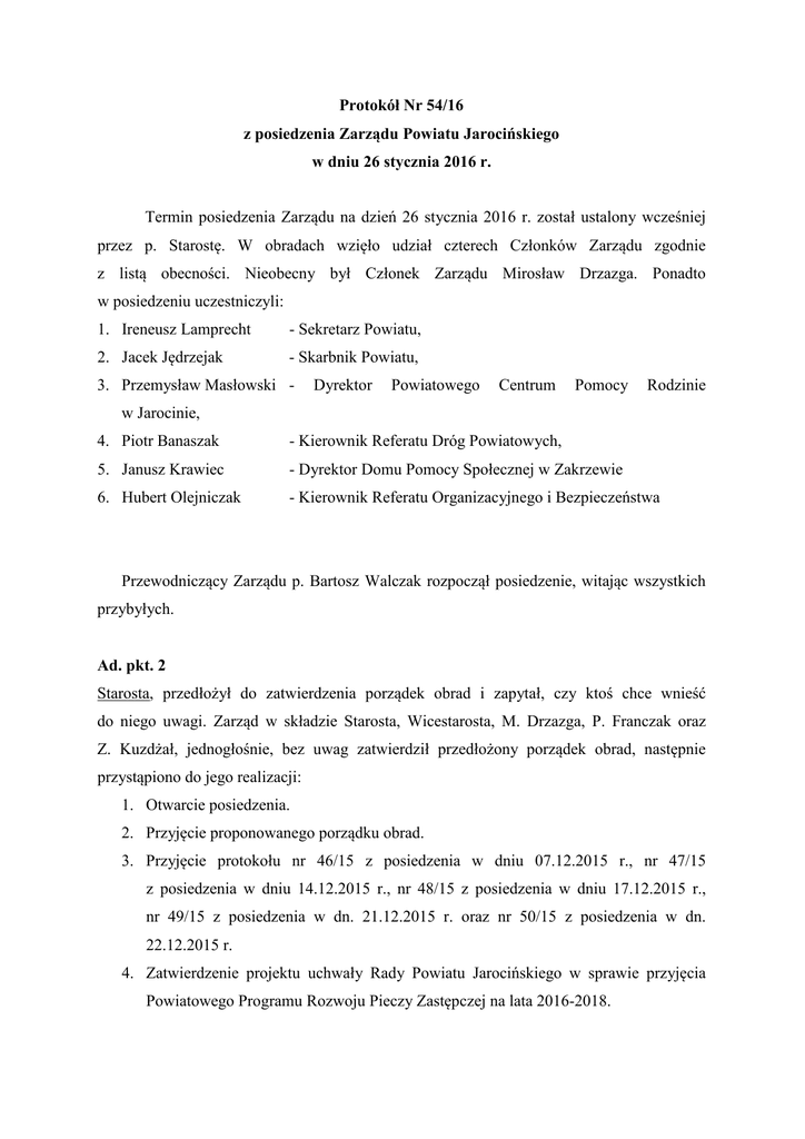 Protokół Nr 54/16 z posiedzenia Zarządu Powiatu Jarocińskiego w dniu 26 stycznia 2016 r. Termin posiedzenia Zarządu na dzień 26 stycznia 2016 r. został ustalony wcześniej przez p. Starostę. W obradach wzięło udział czterech Członków Zarządu zgodnie z listą obecności. Nieobecny był Członek Zarządu Mirosław Drzazga. Ponadto w posiedzeniu uczestniczyli: 1. Ireneusz Lamprecht - Sekretarz Powiatu, 2. Jacek Jędrzejak - Skarbnik Powiatu, 3. Przemysław Masłowski - Dyrektor Powiatowego Centrum Pomocy Rodzinie w Jarocinie, 4. Piotr Banaszak - Kierownik Referatu Dróg Powiatowych, 5. Janusz Krawiec - Dyrektor Domu Pomocy Społecznej w Zakrzewie 6. Hubert Olejniczak - Kierownik Referatu Organizacyjnego i Bezpieczeństwa Przewodniczący Zarządu p. Bartosz Walczak rozpoczął posiedzenie, witając wszystkich przybyłych. Ad. pkt. 2 Starosta, przedłożył do zatwierdzenia porządek obrad i zapytał, czy ktoś chce wnieść do niego uwagi. Zarząd w składzie Starosta, Wicestarosta, M. Drzazga, P. Franczak oraz Z. Kuzdżał, jednogłośnie, bez uwag zatwierdził przedłożony porządek obrad, następnie przystąpiono do jego realizacji: 1. Otwarcie posiedzenia. 2. Przyjęcie proponowanego porządku obrad. 3. Przyjęcie protokołu nr 46/15 z posiedzenia w dniu 07.12.2015 r., nr 47/15 z posiedzenia w dniu 14.12.2015 r., nr 48/15 z posiedzenia w dniu 17.12.2015 r., nr 49/15 z posiedzenia w dn. 21.12.2015 r. oraz nr 50/15 z posiedzenia w dn. 22.12.2015 r. 4. Zatwierdzenie projektu uchwały Rady Powiatu Jarocińskiego w sprawie przyjęcia Powiatowego Programu Rozwoju Pieczy Zastępczej na lata 2016-2018. 5. Rozpatrzenie pisma Dyrektora Powiatowego Centrum Pomocy Rodzinie w Jarocinie nr FN.3011.1.2016 w sprawie zmian w planie finansowym na 2016 r. 6. Zatwierdzenie projektu uchwały Rady Powiatu Jarocińskiego zmieniającej uchwałę w sprawie ustanowienia służebności przesyłu na rzecz Energa- Operator Spółka Akcyjna z siedzibą w Gdańsku przy ul. Marynarki Polskiej 130, 80-557 Gdańsk. 7. Zatwierdzenie projektu uchwały Rady Powiatu Jarocińskiego w sprawie wyrażenia zgody na udzielenie bonifikaty od opłaty rocznej z tytułu trwałego zarządu. 8. Zatwierdzenie projektu uchwały Rady Powiatu Jarocińskiego w sprawie oddania w użyczenie Szpitalowi Powiatowemu w Jarocinie Spółce z o.o. nieruchomości położonej w Bachorzewie. 9. Rozpatrzenie pisma Referatu Geodezji i Gospodarki Nieruchomościami nr R-GNNG.3026.1.2016.ZM w sprawie zmian w planie finansowym na 2016 r. 10. Rozpatrzenie pisma Referatu Geodezji i Gospodarki Nieruchomościami nr R-GNNG.3026.2.2016.ZM w sprawie zmian w planie finansowym na 2016 r. 11. Rozpatrzenie pisma Referatu Dróg Powiatowych nr R-DP.3000.01.2016.KB w sprawie zmian w planie finansowym na 2016 r. 12. Rozpatrzenie pisma Referatu Dróg Powiatowych nr R-DP.7021.3.02.2016.RW w sprawie wyrażenia zgody na zakup nowego samochodu. 13. Rozpatrzenie wniosku Pani Pauliny Wojaczyk w sprawie partycypacji w kosztach przebudowy kolektora deszczowego znajdującego się w Mieszkowie. 14. Rozpatrzenie pisma Sołectwa Sucha- Sierszew w sprawie dokończenia i odnowienia odcinka drogi Kotlin- Sucha w miejscowości Sierszew- Sucha. 15. Rozpatrzenie pisma Referatu Inwestycji nr R.RI.032.1.2016.FK w sprawie możliwości ubiegania się o środki z rezerwy subwencji ogólnej. 16. Rozpatrzenie pisma Referatu Inwestycji nr R-RI.042.1.2016.ZP w sprawie zmian w planie finansowym na 2016 r. 17. Rozpatrzenie pisma Referatu Inwestycji nr R-RI.3026.1.1.2016.FK w sprawie zmian w planie finansowym na 2016 r. 18. Zatwierdzenie projektu uchwały Rady Powiatu Jarocińskiego w sprawie zawarcia porozumienia dotyczącego przejęcia zadania z zakresu administracji rządowej. 19. Zatwierdzenie projektu uchwały Rady Powiatu Jarocińskiego w sprawie uchwalenia Powiatowego Programu Zapobiegania Przestępczości oraz Ochrony Bezpieczeństwa Obywateli i Porządku Publicznego dla Powiatu Jarocińskiego. 20. Rozpatrzenie pisma Komendanta Powiatowego Policji nr ZW-D-237/1/2016 w sprawie wsparcia w formie darowizny rzeczowej lub finansowej na realizację budowy parkingu przy nowej siedzibie Komendy. 21. Rozpatrzenie pisma Referatu Organizacyjnego i Bezpieczeństwa nr A-OB.3026. 1.2016.FA w sprawie zmian w planie finansowym na 2016 r. 22. Rozpatrzenie projektu uchwały Zarządu Powiatu Jarocińskiego w sprawie podania do publicznej wiadomości informacji o możliwości składania wniosków na dofinansowanie w roku 2016 kosztów związanych z likwidacją wyrobów zawierających azbest na terenie powiatu jarocińskiego. 23. Rozpatrzenie projektu uchwały Zarządu Powiatu Jarocińskiego w sprawie przyjęcia sprawozdania z wysokości średnich wynagrodzeń nauczycieli na poszczególnych stopniach awansu zawodowego w szkołach i placówkach prowadzonych przez Powiat Jarociński. 24. Rozpatrzenie wniosku Dyrektora Zespołu Szkół Ponadgimnazjalnych nr 2 w Jarocinie nr ZSP-3111/1/2016 w sprawie wyrażenia zgody na nauczanie indywidualne ucznia. 25. Rozpatrzenie pisma Wydziału Oświaty i Spraw Społecznych nr O.3026.2.2016.MB2 w sprawie zwiększenia budżetu Wydziału w rozdziale 75075 par. 4300. 26. Rozpatrzenie pisma Wydziału Oświaty i Spraw Społecznych nr O.8360.17.2015.BK3 w sprawie zmian w planie finansowym na 2016 r. 27. Rozpatrzenie pisma Dyrektora Domu Pomocy Społecznej w Zakrzewie nr DPSIII/0303/2/16 w sprawie zmian w planie finansowym na 2016 r. 28. Rozpatrzenie pisma Powiatowego Inspektoratu Nadzoru Budowlanego w Jarocinie nr PINB.311.2.2.2016.BL w sprawie zmian w planie finansowym na 2016 r. 29. Rozpatrzenie pisma Dyrektora Powiatowego Urzędu Pracy w Jarocinie nr FK.0320.2.2016 w sprawie zmian w planie finansowym na 2016 r. 30. Przyjęcie do wiadomości informacji Wojewody Wielkopolskiego nr FB-I.3111. 607.2015.7 w sprawie blokady środków. 31. Przyjęcie do wiadomości informacji Wojewody Wielkopolskiego nr FB-I.3111. 611.2015.4 w sprawie zmniejszenia planu dotacji celowej na rok 2