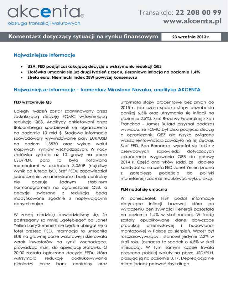 23 września 2013 r. Najważniejsze informacje • • • USA: FED podjął zaskakującą decyzję o wstrzymaniu redukcji QE3 Złotówka umacnia się już drugi tydzień z rzędu, sierpniowa inflacja na poziomie 1,4% Strefa euro: Niemiecki index ZEW powyżej konsensusu Najważniejsze informacje – komentarz Miroslava Novaka, analityka AKCENTA FED wstrzymuje Q3 Ubiegły tydzień został zdominowany przez zaskakującą decyzję FOMC wstrzymującą redukcję QE3. Analitycy ankietowani przez Boloomberga spodziewali się ograniczenia na poziomie 10 mld $. Środowe informacje spowodowały wywindowanie pary EUR/USD na poziom 1,3570 oraz wykup walut krajowych rynków wschodzących. W nocy złotówka zyskała aż 10 groszy na parze USD/PLN, para ta była notowana momentami w okolicach 3,0609 (najniższy wynik od lutego br.). Szef FEDu zapowiedział jednocześnie, że amerykański bank centralny nie operuje żadnym stabilnym harmonogramem na ograniczanie QE3, a decyzje związane z redukcją będą modyfikowane zgodnie z napływającymi danymi makro. W zeszłą niedzielę dowiedzieliśmy się, że postrzegany za mniej „gołębiego“ od Janet Yellen Larry Summers nie będzie ubiegał się o fotel prezesa FED. Informacja ta umocniła EUR na głównej parze walutowej i skierowała wzrok inwestorów na rynki wschodzące, prowadząc m.in. do aprecjacji złotówki. O 20:00 została ogłoszona decyzja FEDu która wstrzymała redukcję dodrukowywania pieniędzy przez bank centralny oraz utrzymała stopy procentowe bez zmian do 2015 r. (do czasu spadku stopy bezrobocia poniżej 6,5% oraz utrzymania się inflacji na poziomie 2,5%). Szef Rezerwy Federalnej z San Francisco - James Bullard przyznał podczas wywiadu, że FOMC był bliski podjęcia decyzji o ograniczeniu QE3 ale ryzyko związane wyższą rentownością zaważyło na tej decyzji. Szef FED, Ben Bernanke, wycofał się także z czerwcowych zapowiedzi dotyczących zakończenia wygaszania QE3 do połowy 2014 r. Część analityków sądzi, że dopiero kandydatka na szefa FED Janet Yellen (znana z gołębiego podejścia do polityki monetarnej) zacznie redukować wykup akcji. PLN nadal się umacnia W poniedziałek NBP podał informacje dotyczące inflacji bazowej która po wyłączeniu cen żywności i energii pozostała na poziomie 1,4% w skali rocznej. W środę zostały opublikowane dane dotyczące produkcji przemysłowej i budowlanomontażowej w Polsce za sierpień. Wzrost był rozczarowywujący i stanowił jedynie 2,2% w skali roku (oznacza to spadek o 4,5% w skali miesiąca). W tym samym czasie trwała przecena polskiej waluty na parze USD/PLN, plasując ją na poziomie 3,17. Deprecjacja nie miała jednak potrwać zbyt długo. Dobre sygnały z Niemiec We wtorek przyszły pozytywne dane zza granicy zachodniej. Index ZEW obrazujący nastroje dotyczące rozwoju sytuacji gospodarczej w Niemczech skoczył zdecydowanie wyżej niż zakładał konsensus aż do 49,6 pkt. Wrześniowy odczyt był o 7,6 pkt wyższy od sierpniowego i osiągnął najwyższą wartość od 3 lat. Wywołał także kontynuacje poniedziałkowych wzrostów na parze EUR/USD. We wtorek para EUR/PLN była wyceniana na poziomie 4,2048, a USD/PLN na 3,1490. Środowa informacja z USA spowodowała powrót inwestorów na rynki wschodzące i dziesięciogroszowy spadek na parze USD/PLN. Para walutowa EUR/USD wybiła się mocno w górę do najwyższych poziomów od lutego 2013 (za euro płaciło się 1,355 dolara). Był to jedynie chwilowy efekt, który został zredukowany przez informacje napływające z Włoszech związane z planowanym impeachmentem Silvio Berlusconiego. EUR/PLN szybko wróciła w okolice 4,20 (rano była kwotowana na poziomie 4,15). W czwarek nastąpiło odreagowanie i lekkie umocnienie dolara na parze USD/PLN. GUSowskie wskaźniki poraz trzeci z rzędu wskazały na poprawę nastrojów konsumenckich - ta informacja została jednak zignorowana przez rynki. Na piątkowe popołudnie zostały zaplanowane wystąpienia członków amerykańskiego banku centralnego (Easther George, Daniela Tarullo, Jamesa Bullarda i Narayana Kocherlakota). W najbliższych dniach W tym tygodniu czekają nas odczyty PMI dla usług i przemysłu w Niemczech, Francji oraz strefie euro (poniedziałek). Narodowy Bank Węgier (wtorek) oraz czeski CNB (czwartek) podejmą decyzję dotyczącą stóp procentowych. Warto zwrócić uwagę na nadchodzące przemówienia członków Europejskiego Banku Centralnego i FEDu, które z reguły mają wpływ na ruchy na FX.