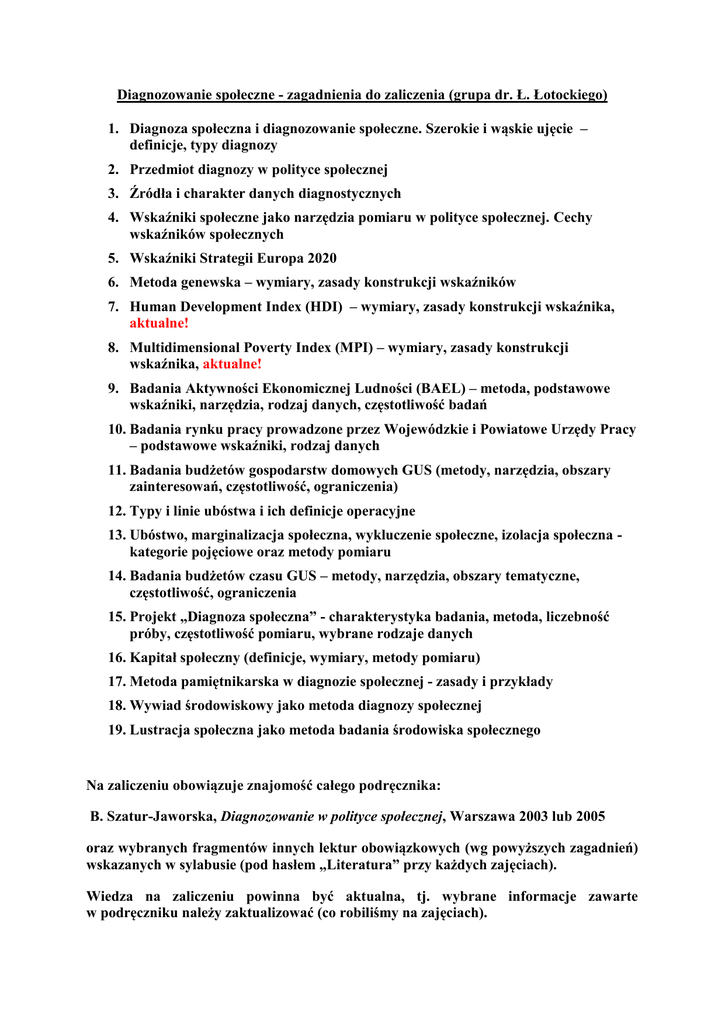 Diagnozowanie społeczne - zagadnienia do zaliczenia (grupa dr. Ł. Łotockiego) 1. Diagnoza społeczna i diagnozowanie społeczne. Szerokie i wąskie ujęcie – definicje, typy diagnozy 2. Przedmiot diagnozy w polityce społecznej 3. Źródła i charakter danych diagnostycznych 4. Wskaźniki społeczne jako narzędzia pomiaru w polityce społecznej. Cechy wskaźników społecznych 5. Wskaźniki Strategii Europa 2020 6. Metoda genewska – wymiary, zasady konstrukcji wskaźników 7. Human Development Index (HDI) – wymiary, zasady konstrukcji wskaźnika, aktualne! 8. Multidimensional Poverty Index (MPI) – wymiary, zasady konstrukcji wskaźnika, aktualne! 9. Badania Aktywności Ekonomicznej Ludności (BAEL) – metoda, podstawowe wskaźniki, narzędzia, rodzaj danych, częstotliwość badań 10. Badania rynku pracy prowadzone przez Wojewódzkie i Powiatowe Urzędy Pracy – podstawowe wskaźniki, rodzaj danych 11. Badania budżetów gospodarstw domowych GUS (metody, narzędzia, obszary zainteresowań, częstotliwość, ograniczenia) 12. Typy i linie ubóstwa i ich definicje operacyjne 13. Ubóstwo, marginalizacja społeczna, wykluczenie społeczne, izolacja społeczna kategorie pojęciowe oraz metody pomiaru 14. Badania budżetów czasu GUS – metody, narzędzia, obszary tematyczne, częstotliwość, ograniczenia 15. Projekt „Diagnoza społeczna” - charakterystyka badania, metoda, liczebność próby, częstotliwość pomiaru, wybrane rodzaje danych 16. Kapitał społeczny (definicje, wymiary, metody pomiaru) 17. Metoda pamiętnikarska w diagnozie społecznej - zasady i przykłady 18. Wywiad środowiskowy jako metoda diagnozy społecznej 19. Lustracja społeczna jako metoda badania środowiska społecznego Na zaliczeniu obowiązuje znajomość całego podręcznika: B. Szatur-Jaworska, Diagnozowanie w polityce społecznej, Warszawa 2003 lub 2005 oraz wybranych fragmentów innych lektur obowiązkowych (wg powyższych zagadnień) wskazanych w sylabusie (pod hasłem „Literatura” przy każdych zajęciach). Wiedza na zaliczeniu powinna być aktualna, tj. wybrane informacje zawarte w podręczniku należy zaktualizować (co robiliśmy na zajęciach).
