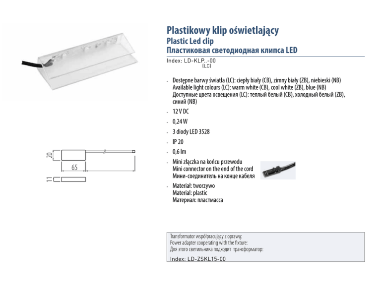 Plastikowy klip oświetlający Plastic Led clip Пластиковая светодиодная клипса LED Index: LD-KLP..-00 (LC) Dostępne barwy światła (LC): ciepły biały (CB), zimny biały (ZB), niebieski (NB) Available light colours (LC): warm white (CB), cool white (ZB), blue (NB) Доступные цвета освещения (LC): теплый белый (CB), холодный белый (ZB), синий (NB) • 12 V DC • 0,24 W • 3 diody LED 3528 • IP 20 • 0,6 lm • Mini złączka na końcu przewodu Mini connector on the end of the cord Мини-cоединитель на конце кабеля • Materiał: tworzywo Material: plastic Материал: пластмасса 20 • 11 65 Transformator współpracujący z oprawą: Power adapter cooperating with the fixture: Для этого светильника подходит трансформатор: Index: LD-ZSKL15-00