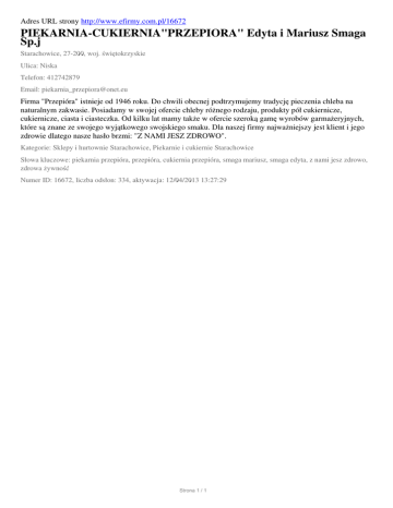 Adres URL strony http://www.efirmy.com.pl/16672 PIEKARNIA-CUKIERNIA"PRZEPIORA" Edyta i Mariusz Smaga Sp.j Starachowice, 27-200, woj. świętokrzyskie Ulica: Niska Telefon: 412742879 Email: [email protected] Firma "Przepióra" istnieje od 1946 roku. Do chwili obecnej podtrzymujemy tradycję pieczenia chleba na naturalnym zakwasie. Posiadamy w swojej ofercie chleby różnego rodzaju, produkty pół cukiernicze, cukiernicze, ciasta i ciasteczka. Od kilku lat mamy także w ofercie szeroką gamę wyrobów garmażeryjnych, które są znane ze swojego wyjątkowego swojskiego smaku. Dla naszej firmy najważniejszy jest klient i jego zdrowie dlatego nasze hasło brzmi: "Z NAMI JESZ ZDROWO". Kategorie: Sklepy i hurtownie Starachowice, Piekarnie i cukiernie Starachowice Słowa kluczowe: piekarnia przepióra, przepióra, cukiernia przepióra, smaga mariusz, smaga edyta, z nami jesz zdrowo, zdrowa żywność Numer ID: 16672, liczba odsłon: 334, aktywacja: 12/04/2013 13:27:29 Strona 1 / 1