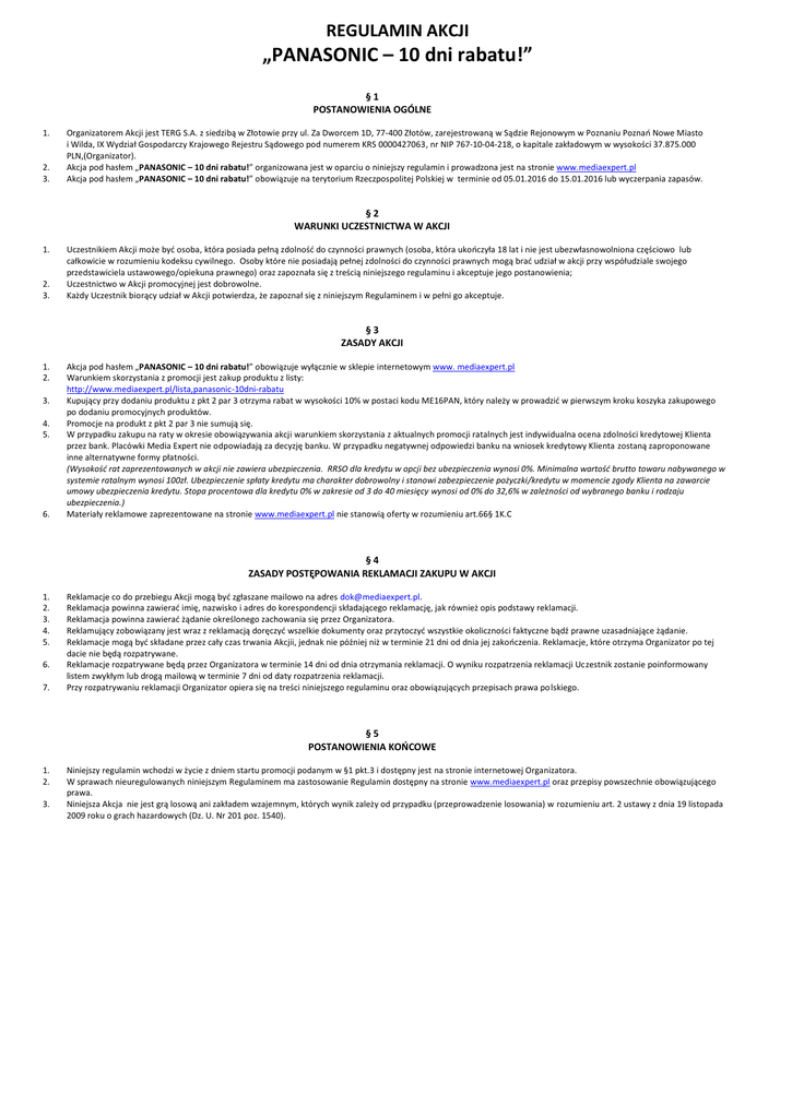 REGULAMIN AKCJI „PANASONIC – 10 dni rabatu!” §1 POSTANOWIENIA OGÓLNE 1. 2. 3. Organizatorem Akcji jest TERG S.A. z siedzibą w Złotowie przy ul. Za Dworcem 1D, 77-400 Złotów, zarejestrowaną w Sądzie Rejonowym w Poznaniu Poznań Nowe Miasto i Wilda, IX Wydział Gospodarczy Krajowego Rejestru Sądowego pod numerem KRS 0000427063, nr NIP 767-10-04-218, o kapitale zakładowym w wysokości 37.875.000 PLN,(Organizator). Akcja pod hasłem „PANASONIC – 10 dni rabatu!” organizowana jest w oparciu o niniejszy regulamin i prowadzona jest na stronie www.mediaexpert.pl Akcja pod hasłem „PANASONIC – 10 dni rabatu!” obowiązuje na terytorium Rzeczpospolitej Polskiej w terminie od 05.01.2016 do 15.01.2016 lub wyczerpania zapasów. §2 WARUNKI UCZESTNICTWA W AKCJI 1. 2. 3. Uczestnikiem Akcji może być osoba, która posiada pełną zdolność do czynności prawnych (osoba, która ukończyła 18 lat i nie jest ubezwłasnowolniona częściowo lub całkowicie w rozumieniu kodeksu cywilnego. Osoby które nie posiadają pełnej zdolności do czynności prawnych mogą brać udział w akcji przy współudziale swojego przedstawiciela ustawowego/opiekuna prawnego) oraz zapoznała się z treścią niniejszego regulaminu i akceptuje jego postanowienia; Uczestnictwo w Akcji promocyjnej jest dobrowolne. Każdy Uczestnik biorący udział w Akcji potwierdza, że zapoznał się z niniejszym Regulaminem i w pełni go akceptuje. §3 ZASADY AKCJI 1. 2. 3. 4. 5. 6. Akcja pod hasłem „PANASONIC – 10 dni rabatu!” obowiązuje wyłącznie w sklepie internetowym www. mediaexpert.pl Warunkiem skorzystania z promocji jest zakup produktu z listy: http://www.mediaexpert.pl/lista,panasonic-10dni-rabatu Kupujący przy dodaniu produktu z pkt 2 par 3 otrzyma rabat w wysokości 10% w postaci kodu ME16PAN, który należy w prowadzić w pierwszym kroku koszyka zakupowego po dodaniu promocyjnych produktów. Promocje na produkt z pkt 2 par 3 nie sumują się. W przypadku zakupu na raty w okresie obowiązywania akcji warunkiem skorzystania z aktualnych promocji ratalnych jest indywidualna ocena zdolności kredytowej Klienta przez bank. Placówki Media Expert nie odpowiadają za decyzję banku. W przypadku negatywnej odpowiedzi banku na wniosek kredytowy Klienta zostaną zaproponowane inne alternatywne formy płatności. (Wysokość rat zaprezentowanych w akcji nie zawiera ubezpieczenia. RRSO dla kredytu w opcji bez ubezpieczenia wynosi 0%. Minimalna wartość brutto towaru nabywanego w systemie ratalnym wynosi 100zł. Ubezpieczenie spłaty kredytu ma charakter dobrowolny i stanowi zabezpieczenie pożyczki/kredytu w momencie zgody Klienta na zawarcie umowy ubezpieczenia kredytu. Stopa procentowa dla kredytu 0% w zakresie od 3 do 40 miesięcy wynosi od 0% do 32,6% w zależności od wybranego banku i rodzaju ubezpieczenia.) Materiały reklamowe zaprezentowane na stronie www.mediaexpert.pl nie stanowią oferty w rozumieniu art.66§ 1K.C §4 ZASADY POSTĘPOWANIA REKLAMACJI ZAKUPU W AKCJI 1. 2. 3. 4. 5. 6. 7. Reklamacje co do przebiegu Akcji mogą być zgłaszane mailowo na adres [email protected]. Reklamacja powinna zawierać imię, nazwisko i adres do korespondencji składającego reklamację, jak również opis podstawy reklamacji. Reklamacja powinna zawierać żądanie określonego zachowania się przez Organizatora. Reklamujący zobowiązany jest wraz z reklamacją doręczyć wszelkie dokumenty oraz przytoczyć wszystkie okoliczności faktyczne bądź prawne uzasadniające żądanie. Reklamacje mogą być składane przez cały czas trwania Akcjii, jednak nie później niż w terminie 21 dni od dnia jej zakończenia. Reklamacje, które otrzyma Organizator po tej dacie nie będą rozpatrywane. Reklamacje rozpatrywane będą przez Organizatora w terminie 14 dni od dnia otrzymania reklamacji. O wyniku rozpatrzenia reklamacji Uczestnik zostanie poinformowany listem zwykłym lub drogą mailową w terminie 7 dni od daty rozpatrzenia reklamacji. Przy rozpatrywaniu reklamacji Organizator opiera się na treści niniejszego regulaminu oraz obowiązujących przepisach prawa polskiego. §5 POSTANOWIENIA KOŃCOWE 1. 2. 3. Niniejszy regulamin wchodzi w życie z dniem startu promocji podanym w §1 pkt.3 i dostępny jest na stronie internetowej Organizatora. W sprawach nieuregulowanych niniejszym Regulaminem ma zastosowanie Regulamin dostępny na stronie www.mediaexpert.pl oraz przepisy powszechnie obowiązującego prawa. Niniejsza Akcja nie jest grą losową ani zakładem wzajemnym, których wynik zależy od przypadku (przeprowadzenie losowania) w rozumieniu art. 2 ustawy z dnia 19 listopada 2009 roku o grach hazardowych (Dz. U. Nr 201 poz. 1540).
