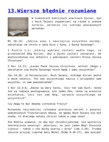 13.Wiersze błędnie rozumiane W niektórych biblijnych wierszach Ojciec, Syn i Duch Święty wspomniani są razem w jednym zwrocie, wersecie wersetów: czy szeregu powiązanych Mt 28,19; „Idźcie więc i nauczajcie wszystkie narody: udzielając im chrztu w imię Ojca i Syna, i Ducha Świętego”. 1 Piotra 1,2; „którzy wybrani zostali wedle tego, co przewidział Bóg Ojciec, aby w Duchu zostali uświęceni, do posłuszeństwa się skłonili i pokropieni zostali Krwią Jezusa Chrystusa”. 2 Kor 13,13; „Łaska Pana Jezusa Chrystusa, miłość |Boga i udzielanie się Ducha Świętego niech będą z wami wszystkimi”. Jan 14,26; „A Pocieszyciel, Duch Święty, którego Ojciec pośle w moim imieniu, Ten was wszystkiego nauczy i przypomni wam wszystko, co wam powiedziałem”. 1 Kor 12,4-6; „Różne są dary łaski, lecz ten sam Duch; różne też są rodzaje posługiwania, ale jeden Pan; różne są wreszcie działania, lecz ten sam Bóg, sprawca wszystkiego we wszystkich”. Czy mogą to być dowody istnienia Trójcy? Rozważmy najczęściej cytowany pierwszy werset z powyżej wymienionych Trynitarianie mówią, że gdyby Duch Święty nie był osobą, to dlaczego należy chrzcić także w jego imię? Ale Biblia ujawnia, że aby być chrześcijaninem, nie wystarczy teoretycznie uwierzyć: „Wierzysz, że jest jeden Bóg? Słusznie czynisz – także i złe duchy wierzą i drżą” (Jak 2,19). Trzeba jeszcze przyjąć cząstkę mocy Bożej (DzAp 8,16-17), aby posiąść dary Ducha (1 Kor 14), aby stać się jednym Ciałem-Kościołem (1 Kor 12,13). Posiadanie Ducha Świętego jest istotnym elementem bycia chrześcijaninem. W Ewangelii Jana 4,24 Jezus powiedział, że „Bóg jest duchem”. Ale my, ludzie, jesteśmy ciałem, nie duchem. Istnieje olbrzymia różnica między ciałem i duchem. W przypadku człowieka nie tylko ciało jest cielesne, podobnie jest z umysłem. Z prochu ziemi zostaliśmy wzięci (1 Kor 3,19) i działamy w granicach ciała. Działamy przy pomocy cielesnych ramion. Lecz Bóg jest duchem. A duch jest wyższy niż ciało. Bóg jest nie tylko święty i nieśmiertelny, ale też myśli i działa na zupełnie innym poziomie, niż my. Bóg będący duchem może działać w sposób dla nas nieosiągalny. Rozmawiając z faryzeuszem Nikodemem Jezus porównał ducha do wiatru: „Wiatr wieje, kędy chce; szum jego słyszysz, ale nie wiesz, skąd przychodzi i dokąd zdąża; tak samo bywa z każdym, kto się z Ducha narodził” (Jan 3,8). Bóg może działać w sposób, jaki nam, ludziom, zbudowanym z ciała trudno jest zrozumieć. Działa On przez Swego Ducha Świętego, Swoją mocą. Duch Boży reaguje na Jego wolę. Spełnia Jego potrzeby i pragnienia, w ten sposób jest jakby wyciągniętym ramieniem bądź posłańcem, którego On używa. Duch Święty jako Boży środek myślenia i działania jest Jego umysłem, Jego energią, Jego postawą, Jego mocą i Jego naturą. Duch Boży działa w umyśle ludzkim prowadząc do nawrócenia. Przenosi on na człowieka cząstkę Bożych własności: mocy, charakteru i umysłu – cząstkę Jego natury. Kiedy pamiętać będziemy o różnicy między ciałem i duchem, to zrozumiemy, dlaczego Biblia mówi tak, jak mówi, o Duchu Świętym. Kiedy Biblia wspomina Ducha Bożego, Ducha Świętego, to zwykle po to, by podkreślić pewne cechy Boga, jakie należą tylko do Niego. TRÓJCA ŚWIĘTA – MIT CZY RZECZYWISTOŚĆ ?