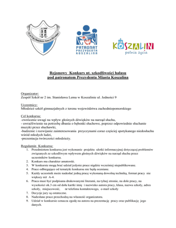 Rejonowy Konkurs nt. szkodliwości hałasu pod patronatem Prezydenta Miasta Koszalina Organizator: Zespół Szkół nr 2 im. Stanisława Lema w Koszalinie ul. Jedności 9 Uczestnicy: Młodzież szkół gimnazjalnych z terenu województwa zachodniopomorskiego Cel konkursu: -zwrócenie uwagi na wpływ głośnych dźwięków na narząd słuchu, - uwrażliwienie na potrzebę dbania o bębenki słuchowe, poprzez odpowiednie słuchanie muzyki przez słuchawki, -budzenie i rozwijanie zainteresowania przyczynami coraz częściej spotykanego niedosłuchu wśród młodych ludzi, -prezentacja twórczości młodzieży. Regulamin Konkursu: 1. Przedmiotem konkursu jest wykonanie projektu ulotki informacyjnej dotyczącej problemów związanych ze szkodliwym wpływem głośnych dźwięków na narząd słuchu przez uczestników konkursu. 2. Konkurs ma charakter amatorski. 3. W konkursie mogą brać udział jedynie prace nigdzie wcześniej niepublikowane. 4. Prace odbiegające od tematyki konkursu nie będą oceniane. 5. Każdy uczestnik może nadesłać jedną pracę wykonaną dowolną techniką, format pracy nie większy niż A-4. 6. Praca musi być podpisana drukowanymi literami, na tylnej stronie, na dole pracy, na wysokości ok.3 cm od dołu kartki imię i nazwisko autora pracy, klasa, nazwa szkoły, adres szkoły, miejscowość, nr telefonu kontaktowego, e-mail szkoły 7. Decyzje jury są ostateczne. 8. Nadesłane prace przechodzą na własność organizatora. 9. Udział w konkursie oznacza zgodę na autora na prezentację pracy oraz publikację jego danych. Terminy: 1. Pracę wykonaną zgodnie z wymogami organizatorów należy dostarczyć drogą pocztową (liczy się data wpływu) lub osobiście do dnia 25 listopada 2016 r. na adres: Zespół Szkół nr 2 im. Stanisława Lema ul. Jedności 9, 75-401 Koszalin z dopiskiem: „KONKURS O HAŁASIE”. 2. Oceny prac dokona jury powołane przez Organizatorów. 3. Rozstrzygnięcie konkursu nastąpi do 1 grudnia 2016 r. 4. Wyniki konkursu zostaną przedstawione na stronie internetowej Organizatora. Nagrody: 1. Komisja przyzna nagrody rzeczowe za I, II, III miejsce w wysokości do 100 złotych. 2. Jury zastrzega sobie prawo do innego podziału nagród. Postanowienia końcowe: Udział w konkursie jest równoznaczny z akceptacją regulaminu oraz zgodą na przetwarzanie danych uczestnika. Dane zwycięzców zostaną opublikowane na stronie internetowej szkoły (imię, nazwisko, szkoła, zajęte miejsce). Uczestnik konkursu do dostarczonej pracy musi dołączyć oświadczenie rodzica/opiekuna prawnego.