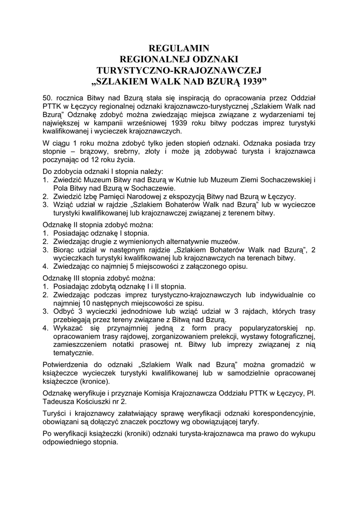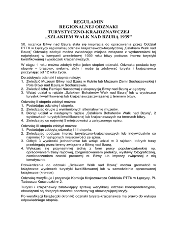 REGULAMIN REGIONALNEJ ODZNAKI TURYSTYCZNO-KRAJOZNAWCZEJ „SZLAKIEM WALK NAD BZURĄ 1939” 50. rocznica Bitwy nad Bzurą stała się inspiracją do opracowania przez Oddział PTTK w Łęczycy regionalnej odznaki krajoznawczo-turystycznej „Szlakiem Walk nad Bzurą” Odznakę zdobyć można zwiedzając miejsca związane z wydarzeniami tej największej w kampanii wrześniowej 1939 roku bitwy podczas imprez turystyki kwalifikowanej i wycieczek krajoznawczych. W ciągu 1 roku można zdobyć tylko jeden stopień odznaki. Odznaka posiada trzy stopnie – brązowy, srebrny, złoty i może ją zdobywać turysta i krajoznawca poczynając od 12 roku życia. Do zdobycia odznaki I stopnia należy: 1. Zwiedzić Muzeum Bitwy nad Bzurą w Kutnie lub Muzeum Ziemi Sochaczewskiej i Pola Bitwy nad Bzurą w Sochaczewie. 2. Zwiedzić Izbę Pamięci Narodowej z ekspozycją Bitwy nad Bzurą w Łęczycy. 3. Wziąć udział w rajdzie „Szlakiem Bohaterów Walk nad Bzurą” lub w wycieczce turystyki kwalifikowanej lub krajoznawczej związanej z terenem bitwy. Odznakę II stopnia zdobyć można: 1. Posiadając odznakę I stopnia. 2. Zwiedzając drugie z wymienionych alternatywnie muzeów. 3. Biorąc udział w następnym rajdzie „Szlakiem Bohaterów Walk nad Bzurą”, 2 wycieczkach turystyki kwalifikowanej lub krajoznawczych na terenach bitwy. 4. Zwiedzając co najmniej 5 miejscowości z załączonego opisu. Odznakę III stopnia zdobyć można: 1. Posiadając zdobytą odznakę I i II stopnia. 2. Zwiedzając podczas imprez turystyczno-krajoznawczych lub indywidualnie co najmniej 10 następnych miejscowości ze spisu. 3. Odbyć 3 wycieczki jednodniowe lub wziąć udział w 3 rajdach, których trasy przebiegają przez tereny związane z Bitwą nad Bzurą. 4. Wykazać się przynajmniej jedną z form pracy popularyzatorskiej np. opracowaniem trasy rajdowej, zorganizowaniem prelekcji, wystawy fotograficznej, zamieszczeniem notatki prasowej nt. Bitwy lub imprezy związanej z nią tematycznie. Potwierdzenia do odznaki „Szlakiem Walk nad Bzurą” można gromadzić w książeczce wycieczek turystyki kwalifikowanej lub w samodzielnie opracowanej książeczce (kronice). Odznakę weryfikuje i przyznaje Komisja Krajoznawcza Oddziału PTTK w Łęczycy, Pl. Tadeusza Kościuszki nr 2. Turyści i krajoznawcy załatwiający sprawę weryfikacji odznaki korespondencyjnie, obowiązani są dołączyć znaczek pocztowy wg obowiązującej taryfy. Po weryfikacji książeczki (kroniki) odznaki turysta-krajoznawca ma prawo do wykupu odpowiedniego stopnia. Książeczka (kronika) odznaki winna zawierać obowiązkowo następujące dane: imię i nazwisko, data urodzenia, miejsce zamieszkania, i ewentualnie przynależność do PTTK. Poniżej spis miejscowości proponowanych wydarzeniami Bitwy nad Bzurą: 1. 2. 3. 4. 5. 6. 7. 8. 9. Babice Bielawy Brochów-Tułowice Góra Św. Małgorzaty Granica Kampinos Kiernozia Kutno Laski 10. Leszno 11. Łęczyca 12. Łomianki 13. Łowicz 14. Modlna 15. Piątek 16. Sieraków 17. Sobota 18. Sochacze do zwiedzenia związanych z 19. Strzegocin 20. Topola Królewska 21. Tum 22. Uniejów 23. Galewice 24. Waliszew 25. Witkowice 26. Wólka Węglowa 27. Zaborów Regulamin został zaakceptowany przez Plenum Komisji Turystyki Pieszej ZW PTTK w dniu 4 marca 1989 roku w Płocku oraz w dniu 6 kwietnia przez Prezydium Komisji Krajoznawczej ZG PTTK w Warszawie. Ustanowiono w dniu 31 maja 1989 r. – Uchwała Prezydium ZG PTTK nr 189/89. 2