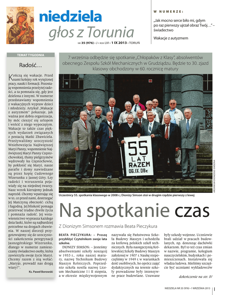 niedziela głos z Torunia nr temat tygodnia Radość… w numerze: „Jak mocno serce biło mi, gdym po raz pierwszy ujrzał obraz Twój…” – świadectwo Wakacje z autyzmem 35 (976) • J • rok LVI • 1 IX 2013 • toruń 7 września odbędzie się spotkanie „Chłopaków z Klasy”, absolwentów obecnego Zespołu Szkół Mechanicznych w Grudziądzu. Będzie to 30. zjazd klasowy obchodzony w 60. rocznicę matury ończą się wakacje. Przed nami kolejny rok wytężonej pracy, nauki i formacji. Pozostają wspomnienia przeżytej radości, a ta pomnaża się, gdy jest dzielona z innymi. W numerze przedstawiamy wspomnienia z wakacyjnych wypraw dzieci i młodzieży. Artykuł „Wakacje z autyzmem” pokazuje, jak ważna jest dobra organizacja, by móc cieszyć się urlopem i wrócić z niego wypoczętym. Wakacje to także czas pięknych wydarzeń związanych z postacią Matki Zbawiciela. Przeżywaliśmy uroczystość Wniebowzięcia Najświętszej Maryi Panny, wspomnienie Najświętszej Maryi Panny Częstochowskiej, tłumy pielgrzymów wędrowały ku Częstochowie, by pokłonić się Maryi, nasze parafie i domy nawiedzane są przez kopię Cudownego Wizerunku z Jasnej Góry. Łzy radości i wzruszenia pojawiały się na niejednej twarzy. Nasz wzrok kierujemy jednak naprzód. Chcemy wpatrując się w to, co przed nami, dostrzegać Jej Matczyną obecność: cichą i łagodną. Jej bliskość pomaga przetrwać trudne chwile życia i pomnaża radość. Jej wstawiennictwo wyprasza każdego dnia łaski, które są najbardziej potrzebne na drogach zbawienia. W naszej diecezji przygotowujemy się do uroczystości zakończenia peregrynacji Jasnogórskiego Wizerunku, dlatego w numerze zamieszczamy świadectwo osoby, która zawierzyła swoje życie Maryi. Chcemy razem z nią wołać: „Maryjo, prowadź nas drogą wiary!”. Ks. Paweł Borowski Archiwum Dionizego Simsona K Uczestnicy 55. spotkania klasowego w 2008 r.; Dionizy Simson stoi w drugim rzędzie pierwszy z lewej Na spotkanie czas Z Dionizym Simsonem rozmawia Beata Pieczykura Beata Pieczykura: – Proszę przybliżyć Czytelnikom swoje lata szkolne. Dionizy Simson: – Jesteśmy absolwentami szkoły noszącej w 1953 r., roku naszej matury, nazwę Technikum Budowy Maszyn Rolniczych. Poprzednio szkoła nosiła nazwę Liceum Mechaniczne I i II stopnia, a w okresie międzywojennym nazywała się Państwowa Szkoła Budowy Maszyn i uchodziła za królową polskich szkół technicznych. Była następczynią Królewskiej Szkoły Budowy Maszyn założonej w 1907 r. Naukę rozpoczęliśmy w 1949 r. w warunkach dość osobliwych, bo oprócz zajęć dydaktycznych na terenie szkoły prowadzone były intensywne prace budowlane. Usuwane były szkody wojenne. Uczniowie brali udział w pracach budowlanych, np. donosząc dachówki dekarzom. Był to też czas zmian w nazwie, programie, kolegium nauczycielskim, budynkach i pomieszczenach. Instalowała się władza ludowa. Mieliśmy szczęście być uczniami wykładowców dokończenie na str. IV NIEDZIELA NR 35 (976) • 1 września 2013 I głos z torunia Nabierali mocy do służby przy ołtarzu L Ministranci i lektorzy ze swoim opiekunem ks. Dawidem Urbaniakiem ne krajobrazy podczas spływu kajakowego po rzece Wel z Lidzbarka do Chełst. Spróbowaliśmy również naszych sił taktycznych w paintballu. Mogliśmy przez chwilę poczuć się jak komandosi. Kiedy pogoda sprzyjała, graliśmy w piłkę nożną, siatkówkę plażo- Archiwum parafii iturgiczna służba ołtarza z parafii pw. Matki Bożej Zwycięskiej i św. Jerzego w Toruniu w dniach 12-16 sierpnia uczestniczyła w wakacyjnym wypoczynku w Lidzbarku Welskim pod opieką ks. Dawida Urbaniaka. Był to czas intensywnej formacji duchowej i ludzkiej. Każdy dzień rozpoczynaliśmy i kończyliśmy modlitwą oraz braterskimi rozmowami. Każdego poranka uczestniczyliśmy w Eucharystii w parafii pw. św. Wojciecha. Mimo iż pogoda nie zawsze sprzyjała, czekało na nas wiele atrakcji. Wędrowaliśmy ścieżkami edukacyjnymi w Górznieńsko-Lidzbarskim Parku Krajobrazowym do Dębu Jagiełły, podziwialiśmy jedyną w Polsce aleję drzew sosnowych, których wysokość sięgała ok. 30 m. Podczas wędrówki czekały na nas liczne zadania przyrodnicze do rozwiązania. Na zakończenie posililiśmy się kiełbaskami z ogniska. Podziwialiśmy pięk- Koncert Amadeus 1 września o godz. 16 w Hotelu Pałac Romantyczny w Turznie (ul. Toruńska 1) odbędzie się koncert w wykonaniu muzyków Orkiestry Kameralnej Polskiego Radia Amadeus z Poznania pod dyrekcją Agnieszki Duczmal, z udziałem solisty Anny Marii Staśkiewicz (skrzypce). W programie: Antonio Vivaldi „Cztery pory roku”, Edvard Grieg „Suita z czasów Holberga”. To wydarzenie zostanie połączone z ekspozycją obrazu „Cztery pory roku. Cztery pory życia” autorstwa Mariusza Kałdowskiego. Koncert został objęty dofinansowaniem ze środków województwa kujawsko-pomorskiego oraz Ministra Kultury i Dziedzictwa Narodowego. Część dochodów ze sprzedaży biletów zostanie przeznaczona na cel charytatywny – dla dzieci z Domu Pomocy Społecznej Sióstr Miłosierdzia w Chełmnie. Honorowy patronat nad koncertem sprawuje marszałek województwa kujawsko-pomorskiego Piotr Całbecki. Bilety w cenie 70 zł do nabycia przed koncertem. wą oraz kąpaliśmy się i pływaliśmy rowerami wodnymi. Podczas pobytu towarzyszyły nam dobry humor i optymizm. Dziękujemy Bogu oraz ludziom dobrej woli, że mogliśmy wspólnie spędzić ten wakacyjny czas. Ks. Dawid Urbaniak Schola parafialna w Hartowcu P Bożej Zwycięskiej i św. Jerzego w Toruniu, które pod opieką ks. Łukasza, p. Tamary i czwórki rodzi- ców w dniach 5-11 sierpnia uczestniczyły w wyjeździe rekolekcyjno-wypoczynkowym w Hartowcu. Archiwum parafii ozwólcie dzieciom przychodzić do Mnie” – te słowa towarzyszyły dzieciom z parafii pw. Matki Uczestnicy wyjazdu wraz z opiekunami przed ośrodkiem rekolekcyjnym w Hartowcu II NIEDZIELA NR 35 (976) 