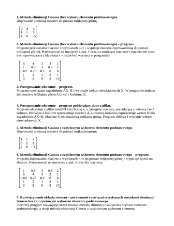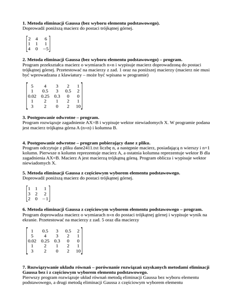 1. Metoda eliminacji Gaussa (bez wyboru elementu podstawowego