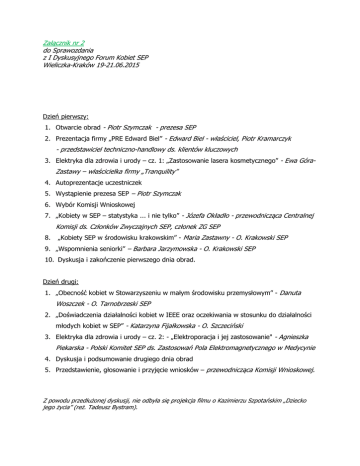 Załącznik nr 2 do Sprawozdania z I Dyskusyjnego Forum Kobiet SEP Wieliczka-Kraków 19-21.06.2015 SZCZEGÓŁOWE PUNKTY OBRAD Dzień pierwszy: 1. Otwarcie obrad - Piotr Szymczak - prezesa SEP 2. Prezentacja firmy „PRE Edward Biel” - Edward Biel - właściciel, Piotr Kramarczyk - przedstawiciel techniczno-handlowy ds. klientów kluczowych 3. Elektryka dla zdrowia i urody – cz. 1: „Zastosowanie lasera kosmetycznego” - Ewa Góra- Zastawy – właścicielka firmy „Tranquility” 4. Autoprezentacje uczestniczek 5. Wystąpienie prezesa SEP – Piotr Szymczak 6. Wybór Komisji Wnioskowej 7. „Kobiety w SEP – statystyka ... i nie tylko” - Józefa Okładło - przewodnicząca Centralnej Komisji ds. Członków Zwyczajnych SEP, członek ZG SEP 8. „Kobiety SEP w środowisku krakowskim” - Maria Zastawny - O. Krakowski SEP 9. „Wspomnienia seniorki” – Barbara Jarzymowska - O. Krakowski SEP 10. Dyskusja i zakończenie pierwszego dnia obrad. Dzień drugi: 1. „Obecność kobiet w Stowarzyszeniu w małym środowisku przemysłowym” - Danuta Woszczek - O. Tarnobrzeski SEP 2. „Doświadczenia działalności kobiet w IEEE oraz oczekiwania w stosunku do działalności młodych kobiet w SEP” - Katarzyna Fijałkowska - O. Szczeciński 3. Elektryka dla zdrowia i urody – cz. 2: - „Elektroporacja i jej zastosowanie" - Agnieszka Piekarska - Polski Komitet SEP ds. Zastosowań Pola Elektromagnetycznego w Medycynie 4. Dyskusja i podsumowanie drugiego dnia obrad 5. Przedstawienie, głosowanie i przyjęcie wniosków – przewodnicząca Komisji Wnioskowej. Z powodu przedłużonej dyskusji, nie odbyła się projekcja filmu o Kazimierzu Szpotańskim „Dziecko jego życia” (reż. Tadeusz Bystram).
