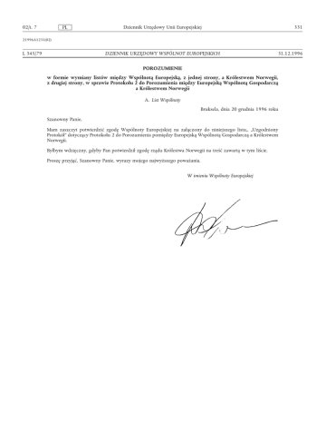 02/t. 7 PL Dziennik Urzędowy Unii Europejskiej 331 21996A1231(02) L 345/79 DZIENNIK URZĘDOWY WSPÓLNOT EUROPEJSKICH 31.12.1996 POROZUMIENIE w formie wymiany listów między Wspólnotą Europejską, z jednej strony, a Królestwem Norwegii, z drugiej strony, w sprawie Protokołu 2 do Porozumienia między Europejską Wspólnotą Gospodarczą a Królestwem Norwegii A. List Wspólnoty Bruksela, dnia 20 grudnia 1996 roku Szanowny Panie, Mam zaszczyt potwierdzić zgodę Wspólnoty Europejskiej na załączony do niniejszego listu,, „Uzgodniony Protokół” dotyczący Protokołu 2 do Porozumienia pomiędzy Europejską Wspólnotą Gospodarczą a Królestwem Norwegii. Byłbym wdzięczny, gdyby Pan potwierdził zgodę rządu Królestwa Norwegii na treść zawartą w tym liście. Proszę przyjąć, Szanowny Panie, wyrazy mojego najwyższego poważania. W imieniu Wspólnoty Europejskiej 332 PL Dziennik Urzędowy Unii Europejskiej B. List Norwegii Bruksela, dnia 20 grudnia 1996 roku Szanowny Panie, Mam zaszczyt potwierdzić otrzymanie dzisiejszego listu Szanownego Pana, który brzmi, jak następuje: „Mam zaszczyt potwierdzić zgodę Wspólnoty Europejskiej na załączony do niniejszego listu »Uzgodniony Protokół« dotyczący Protokołu 2 do Porozumienia między Europejską Wspólnotą Gospodarczą a Królestwem Norwegii.” Mam zaszczyt potwierdzić zgodę mojego rządu na treść Pana listu i na proponowaną datę wejścia w życie zmian. Proszę przyjąć, Szanowny Panie, wyrazy mojego najwyższego poważania. W imieniu rządu Królestwa Norwegii 02/t. 7 02/t. 7 Dziennik Urzędowy Unii Europejskiej PL 333 UZGODNIONY PROTOKÓŁ I. Wstęp 1. W następstwie szeregu posiedzeń urzędników Komisji z przedstawicielstwami Norwegii uzgodniono, że zostanie przedstawione do akceptacji ich odpowiednim władzom szereg zmian dostosowujących odpowiednie zasady stosowane przez Wspólnotę i Norwegię dla przywozu przetworzonych produktów rolnych w zakresie Protokołu 2 do Porozumienia o wolnym handlu z 1973 roku. Zmiany te stosuje się od dnia 1 września 1996 roku. 2. Zmiany określone w ustępie 1 są następstwem uznania przez obie strony potrzeby dostosowania ceł w handlu dwustronnym między Wspólnotą a Norwegią w związku z wdrażaniem przez obie strony uzgodnień GATT. W tym celu, z zastrzeżeniem dodatkowych postanowień określonych w części V, obie strony uzgodniły, że w odniesieniu do surowców rolnych określonych w ustępie 1 część II i część III są stosowane stawki referencyjne. II. Norweski system przywozu 1. Do obliczania stawek celnych dla przetworzonych produktów rolnych będą używane następujące stawki referencyjne (NOK/kg) w stosunku do surowców rolnych: Wzorzec a) Skład standardowy Zawartość rzeczywista Mleko pełne w proszku ( ) 11,78 11,78 11,78 Mleko odtłuszczone w proszku (*) 12,54 12,54 12,54 Masło (*) 13,13 13,13 13,13 Mleko do produkcji jogurtu b) 3,10 3,10 Mleko do produkcji napojów b) 2,30 2,30 Mleko pełne w płynie b) — 1,47 Mleko odtłuszczone w płynie b) — 1,10 Mleko pełne skondensowane b) — 5,13 Mleko skondensowane odtłuszczone b) — 4,87 Mleko w proszku o zaw. 20 % tłuszczu b) — 11,76 Maślanka w proszku b) — 12,30 Śmietana b) — 4,62 Mieszanka na bazie śmietany b) — 5,49 Śmietana kwaśna gęsta b) — 6,90 Śmietana w proszku b) — 11,10 Serwatka w proszku b) — 3,09 Kazeiniany b) — 34,50 b) — 34,50 Mąka pszenna ( ) 2,02 2,02 2,02 Mąka żytnia 2,02 2,23 2,02 Mąka z pszenicy Durum 2,02 1,36 2,02 Mąka jęczmienna 2,02 — 2,02 Mąka żytnio-pszenna 2,02 — 2,02 Mąka kukurydziana 0 — 0 Mąka ryżowa 0 — 0 Mąka z innych zbóż 0 — 0 Pszenica zwykła 1,57 — 1,57 Pszenica durum 1,01 — 1,01 * Albumina mlekowa * 334 Dziennik Urzędowy Unii Europejskiej PL Wzorzec a) 02/t. 7 Skład standardowy Zawartość rzeczywista Jęczmień 1,41 — 1,41 Owies 1,21 — 1,21 Żyto 1,51 — 1,51 Mieszanka żyta z pszenicą (meslin) 1,51 — 1,51 Kukurydza 0 — 0 Inne zboża 0 — 0 Otręby pszenicy 2,02 — 2,02 Otręby owsiane 2,02 — 2,02 Płatki owsiane 2,02 — 2,02 Słód z pszenicy 0 — 0 Słód jęczmienny 0 — 0 Gluten pszenny 0 — 0 Ryż 0 — 0 Skrobia ziemniaczana (*) 4,55 4,55 4,55 Pozostałe skrobie (*) 4,55 — 4,55 Skrobia modyfikowana 4,55 — 4,55 Glukoza i syrop glukozowy 4,55 4,55 4,55 Cukier 0 — 0 Maltodekstryna 0 — 0 Ziemniaki 0,83 — 0,83 Mąka i płatki ziemniaczane 3,87 12,38 12,38 Mięso wołowe, bez kości (o zaw. tłuszczu 14 %) (*) 26,69 26,69 26,69 Mięso wieprzowe (o zaw. tłuszczu 23 %) 19,82 19,82 19,82 Mięso baranie 8,90 — 8,90 Mięso drobiowe 3,11 — 3,11 Tłuszcze inne niż masło 0 — 0 Mrożone maliny (*) 1,78 — 1,78 Koncentrat z malin 9,22 — 9,22 Mrożone czarne porzeczki 1,78 — 1,78 Koncentrat z czarnych porzeczek 4,81 — 4,81 Mrożone truskawki 1,78 1,89 1,78 Koncentrat z truskawek 9,22 — 9,22 Przecier jabłkowy 0 — 0 Koncentrat jabłkowy 0 — 0 * Ser ( ) 20,70 20,70 20,70 Ser w proszku 12,83 — 12,83 46,77 46,77 46,77 * Całe jaja w proszku ( ) Jaja w skorupkach 9,77 — 9,77 Żółtka jaj konserwowe (żółtka ciekłe) 27,73 27,73 27,73 Żółtka jaj w proszku 58,57 — 58,57 Pasta jajeczna (całe jaja bez skorupek) 9,61 9,61 9,61 Albumina płynna 0 — 0 Albumina w proszku 0 — 0 Uwagi: a) * Stawki referencyjne dla surowców rolnych oznakowanych gwiazdką ( ) są stawkami, na bazie których oblicza się należności celne dla przetworzonych produktów rolnych objętych systemem wzorca — pozostałe stawki referencyjne dla surowców rolnych zgłaszanych według tej pozycji są stawkami wynikającymi z zastosowania współczynników przeliczeniowych. b) Stawki referencyjne dla wzorców tych surowców rolnych będą zależały od rzeczywistej zawartości tłuszczu i protein w mleku zgodnie ze współczynnikami przeliczeniowymi. 02/t. 7 PL Dziennik Urzędowy Unii Europejskiej 2. Norweskie kody taryfowe wymienione w niniejszym Protokole odnoszą się do