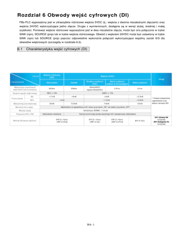Rozdział 6 Obwody wejść cyfrowych (DI) FBs-PLC wyposażony jest w ultraszybkie różnicowe wejścia 5VDC (tj.: wejścia z dwoma niezależnymi złączami) oraz wejścia 24VDC wykorzystujące jedno złącze. Drugie z wymienionych, dostępne są w wersji dużej, średniej i małej szybkości. Ponieważ wejście różnicowe wyposażone jest w dwa niezależne złącza, może być ono połączone w trybie SINK (npn), SOURCE (pnp) lub w trybie wejścia różnicowego. Obwód z wejściem 24VDC może być ustawiony w trybie SINK (npn) lub SOURCE (pnp) poprzez odpowiednie wykonanie połączeń wykorzystujące wspólny zacisk S/S dla obwodów wejściowych (szczegóły w rozdziale 6.3). 6.1 Charakterystyka wejść cyfrowych (DI) H6-1 Element Charakterystyki Wejście różnicowe 5VDC Ultraszybkie (HSC) Wejście pojedyncze 24VDC Uwaga Dużej szybkości (HSC) Średniej szybkości (HSC) Średniej/małej szybkości FBS-20MNR/T/J X0,1 X4, 5, 8, 9 X2,3,6,7,10,11 FBS-32MNR/T/J X0,1,4,5 X8, 9, 12, 13 X2,3,6,7,10,11,14,15 X16~19 FBS-44MNR/T/J X0,1,4,5,8,9, 12,13 X2,3,6,7,10,11,14,15 X16~27 Lista szybkości odpowiedzi wejścia dla różnych modeli FBS-10MCR/T/J X0,1 X4,5 X2,3 FBS-14MCR/T/J X0,1 X4,5 X2,3,6,7 FBS-20MCR/T/J X0,1,4,5 X8,9 X2,3,6,7,10,11 FBS-24MCR/T/J X0,1,4,5 X8,9.12,13 X2,3,6,7,10,11 FBS-32MCR/T/J X0,1,4,5,8,9 X12,13 X2,3,6,7,10,11,14,15 X16~19 FBS-40MCR/T/J X0,1,4,5,8,9 X12,13 X2,3,6,7,10,11,14,15 X16~23 FBS-60MCR/T/J X0,1,4,5,8,9,12,13 X2,3,6,7,10,11,14,15 X16~35 FBS-10MAR/T/J X0,1,4,5 X2,3 FBS-14MAR/T/J X0,1,4,5 X2,3,6,7 FBS-20MAR/T/J X0,1,4,5,8,9 X2,3,6,7,10,11 FBS-24MAR/T/J X0,1,4,5,8,9,12,13 X2,3,6,7,10,11 FBS-32MAR/T/J X0,1,4,5,8,9,12,13 X2,3,6,7,10,11,14,15 X16~19 FBS-40MAR/T/J X0,1,4,5,8,9,12,13 X2,3,6,7,10,11,14,15 X16~23 FBS-60MAR/T/J X0,1,4,5,8,9,12,13 X2,3,6,7,10,11,14,15 X16~35 Moduł/jednostka rozszerzeń R/T/J Stała czasowa filtracji zakłóceń*3 Małej szybkości *1:Granica prędkości wejściowej w modelu MA wynosi 10kHz Wszystkie punkty wejściowe DHF(0 ~ 15mS) AHF(0.47µs) + DHF(0 ~ 15mS) AHF(4.7µs) + H6-2 DHF(0 ~ 15mS) AHF(0.47µs) + AHF(4.7ms) : : DHF Cyfrowy filtr sprzętowy AHF Analogowy filtr sprzętowy 6.2 Budowa i połączenia obwodu wejściowego z ultraszybkim różnicowym wejściem cyfrowym Jedynie jednostka główna FBs-MN wyposażona jest w obwód z ultraszybkim różnicowym wejściem cyfrowym wykorzystywanym głównie jako wejście na szybki licznik sprzętowy (HHSC) o maksymalnej częstotliwości roboczej do 920 kHz. W praktyce, aby zapewnić dużą szybkość i odporność na zakłócenia, należy zastosować wejście różnicowe. W otoczeniach o niskim poziomie zakłóceń oraz średniej częstotliwości roboczej (<200kHz), można zastosować nieróżnicowe wejście 5VDC SINK (npn) lub SOURCE (pnp), lub też wejście 24VDC SINK (npn) lub SOURCE (pnp) poprzez szeregowe podłączenie rezystora 3KΩ/0.5W w sposób przedstawiony na rysunku poniżej. H6-3 6.3 Obwód z wejściem 24VDC dla połączeń wejścia SINK/SOURCE (NPN/PNP) Obwody z wejściem cyfrowym 24VDC w FBs-PLC dostępne są w trzech wersjach: dużej, średniej i małej szybkości. Wszystkie charakteryzują się zbliżoną budową obwodów. Do złącz wejściowych stosowane jest połączenie jednego zakończenia wszystkich punktów wejściowych (z optoizolacją) wewnątrz PLC do jednego wewnętrznego punktu wspólnego oznaczonego jako S/S. Drugie zakończenie każdego obwodu połączone jest z odpowiednim złączem, tj. X0, X1, X2 itp. Użytkownik musi przeprowadzić taką samą procedurę przy podłączaniu do wejścia cyfrowego zewnętrznych urządzeń. Jedne zakończenia wszystkich urządzeń wejściowych (np.: przycisków, włączników) połączone są ze sobą tworząc wspólne połączenie zewnętrzne, natomiast pozostałe zakończenia obwodów wejściowych połączone są ze złączami wejściowymi PLC X0, X1, X2, itd. Na końcu należy podłączyć zewnętrzne wspólne połączenie oraz wewnętrzne wspólne złącze S/S do dodatnich/ujemnych złącz układu zasilania 24VDC. W zależności od wyboru połączenia +24VDC lub -24VDC do zacisku S/S mamy połączenie SINK (npn) lub SOURCE (pnp). Schematy połączeń dla obu przypadków przedstawiono poniżej: H6-4