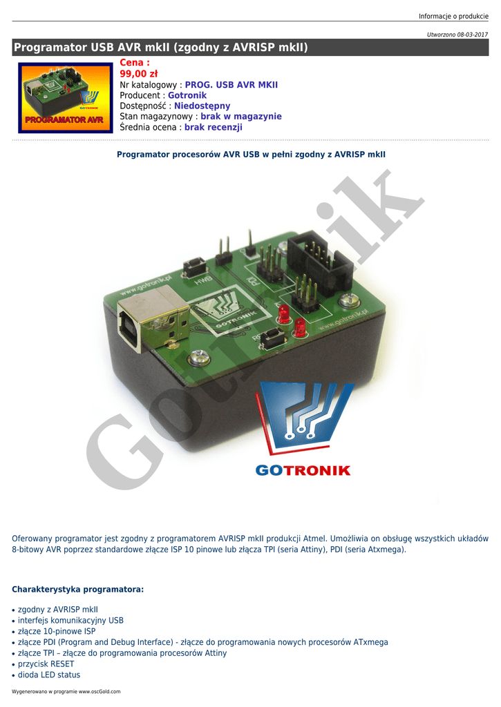 Informacje o produkcie Utworzono 08-03-2017 Programator USB AVR mkII (zgodny z AVRISP mkII) Cena : 99,00 zł Nr katalogowy : PROG. USB AVR MKII Producent : Gotronik Dostępność : Niedostępny Stan magazynowy : brak w magazynie Średnia ocena : brak recenzji G ot r on ik Programator procesorów AVR USB w pełni zgodny z AVRISP mkII Oferowany programator jest zgodny z programatorem AVRISP mkII produkcji Atmel. Umożliwia on obsługę wszystkich układów 8-bitowy AVR poprzez standardowe złącze ISP 10 pinowe lub złącza TPI (seria Attiny), PDI (seria Atxmega). Charakterystyka programatora: ● ● ● ● ● ● ● zgodny z AVRISP mkII interfejs komunikacyjny USB złącze 10-pinowe ISP złącze PDI (Program and Debug Interface) - złącze do programowania nowych procesorów ATxmega złącze TPI – złącze do programowania procesorów Attiny przycisk RESET dioda LED status Wygenerowano w programie www.oscGold.com ● ● ● ● dioda LED power (zasilanie) możliwość włączenia/wyłączenia napięcia zasilające programowany układ możliwość współpracy układami niskonapięciowymi możliwość samodzielnego wgrywania nowego firmware poprzez USB (bez potrzeby użycia innego programatora) Oprogramowanie współpracujące: ● ● ● AVRStudio CodevisionAVR Image Craft Programator posiada złącza: ● ● złącze 10-pinowe ISP złącze PDI (Program and Debug Interface) - złącze do programowania nowych procesorów ATxmega złącze TPI – złącze do programowania procesorów ATtiny Lista obsługiwanych układów: on ik ● G ot r Dzięki temu że programator współpracuje ze środowiskiem AVRStudio on wszystkie procesory 8-bitowe AVR produkcji Atmel. Informacje o produkcie on ik ATTINY10 ATTINY12 ATTINY13 ATTINY13A ATTINY15 ATTINY167 ATTINY20 ATTINY22 ATTINY2313 ATTINY2313A ATTINY24 ATTINY24A ATTINY25 ATTINY26 ATTINY261 ATTINY261A ATTINY4 ATTINY40 ATTINY4313 ATTINY43U ATTINY44 ATTINY44A ATTINY45 ATTINY461 ATTINY461A ATTINY48 ATTINY5 ATTINY84 ATTINY85 ATTINY861 ATTINY861A ATTINY87 ATTINY88 ATTINY9 G ot r AT86RF401 AT89S51 AT89S52 AT90CAN128 AT90CAN32 AT90CAN64 AT90PWM1 AT90PWM2 AT90PWM216 AT90PWM2B AT90PWM3 AT90PWM316 AT90PWM3B AT90PWM81 AT90SCR100H AT90USB1286 AT90USB1287 AT90USB162 AT90USB646 AT90USB647 AT90USB82 ATMEGA128 ATMEGA1280 ATMEGA1281 ATMEGA1284 ATMEGA1284P ATMEGA128A ATMEGA128RFA1 ATMEGA16 ATMEGA162 ATMEGA163 ATMEGA164A ATMEGA164P ATMEGA164PA ATMEGA165 ATMEGA165P ATMEGA165PA ATMEGA168 ATMEGA168A ATMEGA168P ATMEGA168PA ATMEGA169 ATMEGA169P ATMEGA169PA ATMEGA16A ATMEGA16HVA ATMEGA16HVA2 ATMEGA16HVB ATMEGA16M1 ATMEGA16U2 ATMEGA16U4 ATMEGA2560 ATMEGA2561 ATMEGA32 ATMEGA324A ATMEGA324P ATMEGA324PA ATMEGA325 ATMEGA3250 ATMEGA3250P ATMEGA325P ATMEGA328 ATMEGA328P ATMEGA329 ATMEGA3290 ATMEGA3290P ATMEGA329P ATMEGA329PA ATMEGA32A ATMEGA32C1 ATMEGA32HVB ATMEGA32M1 ATMEGA32U2 ATMEGA32U4 ATMEGA32U6 ATMEGA48 ATMEGA48A ATMEGA48P ATMEGA48PA ATMEGA64 ATMEGA640 ATMEGA644 ATMEGA644A ATMEGA644P ATMEGA644PA ATMEGA645 ATMEGA6450 ATMEGA649 ATMEGA6490 ATMEGA649P ATMEGA64A ATMEGA64C1 ATMEGA64M1 ATMEGA8 ATMEGA8515 ATMEGA8535 ATMEGA88 ATMEGA88A ATMEGA88P ATMEGA88PA ATMEGA8A ATMEGA8HVA ATMEGA8U2 Wygenerowano w programie www.oscGold.com ATXMEGA128A1 ATXMEGA128A1U ATXMEGA128A3 ATXMEGA128D3 ATXMEGA16A4 ATXMEGA16D4 ATXMEGA192A3 ATXMEGA192D3 ATXMEGA256A3 ATXMEGA256A3B ATXMEGA256D3 ATXMEGA32A4 ATXMEGA32D4 ATXMEGA64A1 ATXMEGA64A3 ATXMEGA64D3 ot r on ik programator współpracuje także z najnowszą wersja Atmel Studio 6.2: G Sercem programatora jest mikroprocesor AT90USB162 produkcji Atmel który posiada sprzętowy interfejs USB. Dzięki wykorzystaniu tego procesora programator pracuje stabilnie w odróżnieniu od programatorów opartych np. na Atmega8 gdzie transmisja USB jest prowadzona programowo, dodatkowo procesor wykonuje także „obsługę” programatora (i powoduje to bardzo niestabilna pracę takiej konstrukcji). Dodatkowym atutem zastosowania układu AT90USB162 jest możliwość łatwego wgrania nowego firmware za pomocą programu FLIP (FLexible In-system Programmer). ot r on ik Informacje o produkcie G Dzięki zastosowaniu na wyjściu programatora układu buforowego GTL2003 mamy możliwość obsługi układów o napięciu zasilania od 1,0V do 5,0V (1.0 V, 1.2 V, 1.5 V, 1.8 V, 2.5 V, 3.3 V, and 5 V). Dodatkowo GTL posiada zabezpieczenie ESD przed wyładowaniami elektrostatycznymi co dodatkowo chroni cały programator przed uszkodzeniem. Wygenerowano w programie www.oscGold.com on ik ot r G Zdjęcia programatora: G ot r on ik Informacje o produkcie Wygenerowano w programie www.oscGold.com on ik ot r G G ot r on ik Informacje o produkcie Wygenerowano w programie www.oscGold.com on ik ot r G G ot r on ik Informacje o produkcie Wygenerowano w programie www.oscGold.com on ik ot r G Przykładowe połączenie programatora z minimodułem ATMEGA32. ● ● ● ● G Zestaw zawiera: ot r on ik Informacje o produkcie programator USB AVR taśma IDC-10pin przewody -6szt. izolatory do przewodów -6szt. Wygenerowano w programie www.oscGold.com on ik ot r G