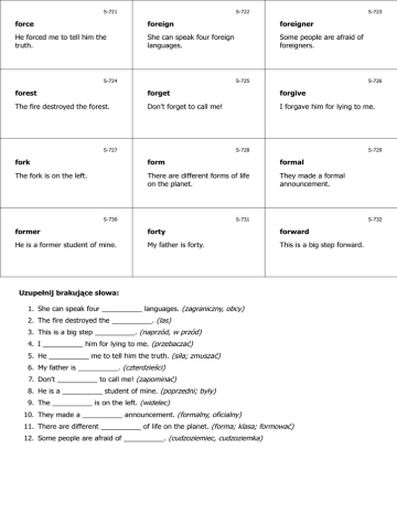 S-721 S-722 S-723 force foreign foreigner He forced me to tell him the truth. She can speak four foreign languages. Some people are afraid of foreigners. S-724 S-725 S-726 forest forget forgive The fire destroyed the forest. Don’t forget to call me! I forgave him for lying to me. S-727 S-728 S-729 fork form formal The fork is on the left. There are different forms of life on the planet. They made a formal announcement. S-730 S-731 S-732 former forty forward He is a former student of mine. My father is forty. This is a big step forward. Uzupełnij brakujące słowa: 1. She can speak four __________ languages. (zagraniczny, obcy) 2. The fire destroyed the __________. (las) 3. This is a big step __________. (naprzód, w przód) 4. I __________ him for lying to me. (przebaczać) 5. He __________ me to tell him the truth. (siła; zmuszać) 6. My father is __________. (czterdzieści) 7. Don’t __________ to call me! (zapominać) 8. He is a __________ student of mine. (poprzedni; były) 9. The __________ is on the left. (widelec) 10. They made a __________ announcement. (formalny, oficialny) 11. There are different __________ of life on the planet. (forma; klasa; formować) 12. Some people are afraid of __________. (cudzoziemiec, cudzoziemka) S-723 S-722 S-721 cudzoziemiec, cudzoziemka zagraniczny, obcy siła; zmuszać Niektórzy ludzie boją się cudzoziemców. Ona potrafi mówić w czterech językach. Zmusił mnie, bym powiedział mu prawdę. www.isel.edu.pl www.isel.edu.pl www.isel.edu.pl S-726 S-725 S-724 przebaczać zapominać las Przebaczyłem mu to, że mnie okłamał. Nie zapomnij do mnie zadzwonić! Pożar zniszczył las. www.isel.edu.pl www.isel.edu.pl www.isel.edu.pl S-729 S-728 S-727 formalny, oficialny forma; klasa; formować widelec Wydali oficjalny komunikat. Na planecie są/występują różne formy życia. Widelec jest po lewej (stronie). www.isel.edu.pl www.isel.edu.pl www.isel.edu.pl S-732 S-731 S-730 naprzód, w przód czterdzieści poprzedni; były To duży krok naprzód. Mój ojciec ma czterdzieści lat. On jest moim byłym studentem. www.isel.edu.pl Odpowiedzi: 1. foreign 2. forest 3. forward 4. forgave 5. forced 6. forty 7. forget 8. former 9. fork 10. formal 11. forms 12. foreigners www.isel.edu.pl www.isel.edu.pl
