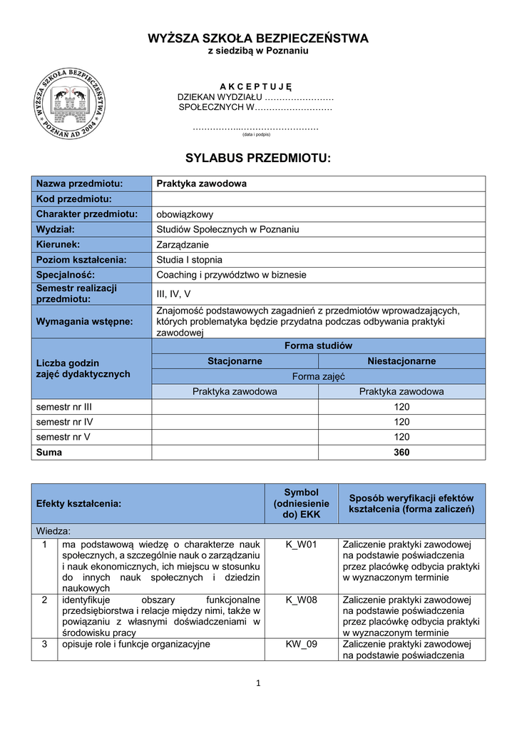 WYŻSZA SZKOŁA BEZPIECZEŃSTWA z siedzibą w Poznaniu AKCEPTUJĘ DZIEKAN WYDZIAŁU …………………… SPOŁECZNYCH W……………………… ……………..……………………… (data i podpis) SYLABUS PRZEDMIOTU: Nazwa przedmiotu: Praktyka zawodowa Kod przedmiotu: Charakter przedmiotu: obowiązkowy Wydział: Studiów Społecznych w Poznaniu Kierunek: Zarządzanie Poziom kształcenia: Studia I stopnia Specjalność: Semestr realizacji przedmiotu: Coaching i przywództwo w biznesie Wymagania wstępne: Liczba godzin zajęć dydaktycznych III, IV, V Znajomość podstawowych zagadnień z przedmiotów wprowadzających, których problematyka będzie przydatna podczas odbywania praktyki zawodowej Forma studiów Stacjonarne Niestacjonarne Forma zajęć Praktyka zawodowa Praktyka zawodowa semestr nr III 120 semestr nr IV 120 semestr nr V 120 Suma 360 Efekty kształcenia: Wiedza: 1 ma podstawową wiedzę o charakterze nauk społecznych, a szczególnie nauk o zarządzaniu i nauk ekonomicznych, ich miejscu w stosunku do innych nauk społecznych i dziedzin naukowych 2 identyfikuje obszary funkcjonalne przedsiębiorstwa i relacje między nimi, także w powiązaniu z własnymi doświadczeniami w środowisku pracy 3 opisuje role i funkcje organizacyjne 1 Symbol (odniesienie do) EKK Sposób weryfikacji efektów kształcenia (forma zaliczeń) K_W01 Zaliczenie praktyki zawodowej na podstawie poświadczenia przez placówkę odbycia praktyki w wyznaczonym terminie K_W08 Zaliczenie praktyki zawodowej na podstawie poświadczenia przez placówkę odbycia praktyki w wyznaczonym terminie Zaliczenie praktyki zawodowej na podstawie poświadczenia KW_09 4 zna i interpretuje podstawowe przepisy prawa regulujące funkcjonowanie podmiotów gospodarczych KW_18 Umiejętności: 1 potrafi zastosować wiedzę specjalistyczną do współpracy z innymi obszarami funkcjonalnymi w typowych sytuacjach profesjonalnych 2 3 4 potrafi ocenić przydatność typowych metod, procedur i dobrych praktyk do realizacji zdań związanych z różnymi problemami i obszarami działalności przedsiębiorstwa lub innej organizacji, analizy otoczenia przedsiębiorstwa/instytucji posługuje się przepisami prawa oraz systemami znormalizowanymi przedsiębiorstwa (rachunkowości, bhp itp.) w celu uzasadniania konkretnych działań posiada umiejętności kierowania i współdziałania w projektach wprowadzających określone zmiany w organizacji K_U02 K_U06 K_U11 K_U13 przez placówkę odbycia praktyki w wyznaczonym terminie Zaliczenie praktyki zawodowej na podstawie poświadczenia przez placówkę odbycia praktyki w wyznaczonym terminie Zaliczenie praktyki zawodowej na podstawie poświadczenia przez placówkę odbycia praktyki w wyznaczonym terminie Zaliczenie praktyki zawodowej na podstawie poświadczenia przez placówkę odbycia praktyki w wyznaczonym terminie Zaliczenie praktyki zawodowej na podstawie poświadczenia przez placówkę odbycia praktyki w wyznaczonym terminie Zaliczenie praktyki zawodowej na podstawie poświadczenia przez placówkę odbycia praktyki w wyznaczonym terminie Kompetencje społeczne: 1 jest przygotowany do samodzielnego K_K01 Udział w dyskusjach i zdobywania i doskonalenia wiedzy oraz konsultacjach podczas praktyk umiejętności profesjonalnych i badawczych, rozumie potrzebę stałego dokształcania się zawodowego 2 sprawnie komunikuje się z otoczeniem w K_K04 Udział w dyskusjach i miejscu pracy i poza nim oraz przekazuje konsultacjach podczas praktyk swoją wiedzę przy użyciu różnych środków przekazu informacji 3 jest przygotowany do odważnego K_K06 Udział w dyskusjach i przekazywania i obrony własnych poglądów konsultacjach podczas praktyk nie tylko w sprawach zawodowych 4 posiada zdolność adaptacji i działania w K_K08 Udział w dyskusjach i nowych warunkach i sytuacjach, np. konsultacjach podczas praktyk związanych z odmiennością kulturową grupy 5 postępuje etycznie w ramach wyznaczonych K_K11 Udział w dyskusjach i ról organizacyjnych i społecznych konsultacjach podczas praktyk Realizowanie zadań powierzonych przez opiekuna praktyk z ramienia instytucji Metody Praca indywidualna i w grupach, dyskusje, analizy sytuacji rzeczywistych oraz dydaktyczne: dokumentacji Konsultacje PROGRAM PRAKTYKI ZAWODOWEJ Kierunek studiów: ZARZĄDZANIE Specjalność: COACHING I PRZYWÓDZTWO W BIZNESIE Studia: NIESTACJONARNE ORGANIZACJA PRAKTYKI 2 1. Studenci po II, III i IV semestrze studiów na kierunku zarządzanie, specjalność Coaching i przywództwo w biznesie odbywają praktykę zawodową w wymiarze 4 tygodni – 30 godzin tygodniowo. Praktyka może być realizowana w trybie śródrocznym lub w trybie ciągłym, a jej zakończenie winno nastąpić najpóźniej do końca V semestru studiów. Dzienna i tygodniowa liczba realizowanych godzin praktyki może być elastyczna zgodnie z wewnętrznymi ustaleniami czy możliwościami placówki przyjmującej studenta, jednak w sumie musi ona wynosić 120 godzin. 2. Do liczby godzin praktyki nie wlicza się czasu przeznaczonego przez studenta na niezbędne przygotowanie się do zajęć w danej placówce. 3. Ze względu na charakter praktyki, może być ona odbywana wyłącznie na terenie jednej placówki. Podstawą podjęcia praktyki jest skierowanie z Uczelni. 4. Praktyka może być realizowana w placówkach o całodobowym trybie pracy, fakt ten jednak nie powoduje możliwości odpowiedniego skrócenia planowego wymiaru czasu praktyki. 5. Wskazane jest, aby praktyka odbywała się pod kierownictwem opiekuna (pracownika) posiadającego wyższe wykształcenie oraz pełne kwalifikacje wymagane na danym stanowisku. Zakładowy opiekun praktyki udziela pomocy studentom w zależności od stopnia trudności realizowanych zadań i możliwości poszczególnych praktykantów. 6. Praktyka ma charakter czynny, tzn. że w szczególności hospitacje i tym podobne formy biernego udziału w zajęciach powinny stanowić nie więcej niż 25% ogólnego czasu praktyki. 