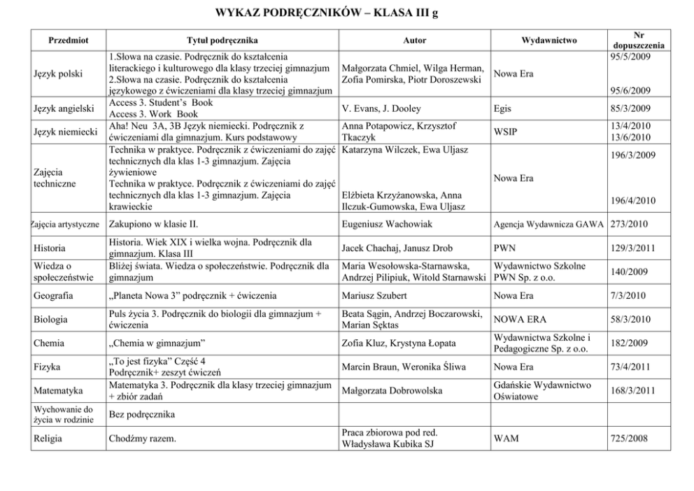 WYKAZ PODRĘCZNIKÓW – KLASA III g Tytuł podręcznika Przedmiot Język polski Język angielski Język niemiecki Zajęcia techniczne Zajęcia artystyczne 1.Słowa na czasie. Podręcznik do kształcenia literackiego i kulturowego dla klasy trzeciej gimnazjum 2.Słowa na czasie. Podręcznik do kształcenia językowego z ćwiczeniami dla klasy trzeciej gimnazjum Access 3. Student’s Book Access 3. Work Book Aha! Neu 3A, 3B Język niemiecki. Podręcznik z ćwiczeniami dla gimnazjum. Kurs podstawowy Technika w praktyce. Podręcznik z ćwiczeniami do zajęć technicznych dla klas 1-3 gimnazjum. Zajęcia żywieniowe Technika w praktyce. Podręcznik z ćwiczeniami do zajęć technicznych dla klas 1-3 gimnazjum. Zajęcia krawieckie Zakupiono w klasie II. Wiedza o społeczeństwie Historia. Wiek XIX i wielka wojna. Podręcznik dla gimnazjum. Klasa III Bliżej świata. Wiedza o społeczeństwie. Podręcznik dla gimnazjum Geografia Historia Autor Wydawnictwo Nr dopuszczenia 95/5/2009 Małgorzata Chmiel, Wilga Herman, Nowa Era Zofia Pomirska, Piotr Doroszewski 95/6/2009 V. Evans, J. Dooley Anna Potapowicz, Krzysztof Tkaczyk Katarzyna Wilczek, Ewa Uljasz Egis 85/3/2009 WSIP 13/4/2010 13/6/2010 196/3/2009 Nowa Era Elżbieta Krzyżanowska, Anna Ilczuk-Gumowska, Ewa Uljasz 196/4/2010 Eugeniusz Wachowiak Agencja Wydawnicza GAWA 273/2010 Jacek Chachaj, Janusz Drob PWN 129/3/2011 Maria Wesołowska-Starnawska, Wydawnictwo Szkolne Andrzej Pilipiuk, Witold Starnawski PWN Sp. z o.o. 140/2009 „Planeta Nowa 3” podręcznik + ćwiczenia Mariusz Szubert Nowa Era 7/3/2010 Biologia Puls życia 3. Podręcznik do biologii dla gimnazjum + ćwiczenia Beata Sągin, Andrzej Boczarowski, Marian Sęktas NOWA ERA 58/3/2010 Chemia „Chemia w gimnazjum” Zofia Kluz, Krystyna Łopata Wydawnictwa Szkolne i Pedagogiczne Sp. z o.o. 182/2009 Marcin Braun, Weronika Śliwa Nowa Era 73/4/2011 Małgorzata Dobrowolska Gdańskie Wydawnictwo Oświatowe 168/3/2011 Praca zbiorowa pod red. Władysława Kubika SJ WAM 725/2008 Fizyka Matematyka „To jest fizyka” Część 4 Podręcznik+ zeszyt ćwiczeń Matematyka 3. Podręcznik dla klasy trzeciej gimnazjum + zbiór zadań Wychowanie do życia w rodzinie Bez podręcznika Religia Chodźmy razem.