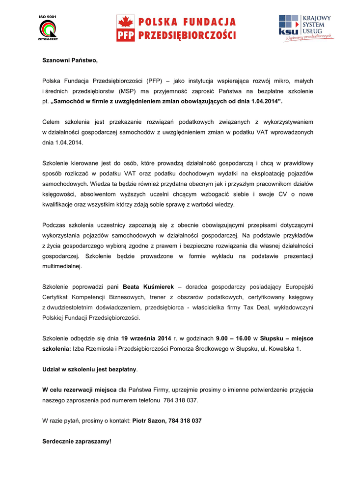 ISO 9001 ZETOM-CERT Szanowni Państwo, Polska Fundacja Przedsiębiorczości (PFP) – jako instytucja wspierająca rozwój mikro, małych i średnich przedsiębiorstw (MSP) ma przyjemność zaprosić Państwa na bezpłatne szkolenie pt. „Samochód w firmie z uwzględnieniem zmian obowiązujących od dnia 1.04.2014”. Celem szkolenia jest przekazanie rozwiązań podatkowych związanych z wykorzystywaniem w działalności gospodarczej samochodów z uwzględnieniem zmian w podatku VAT wprowadzonych dnia 1.04.2014. Szkolenie kierowane jest do osób, które prowadzą działalność gospodarczą i chcą w prawidłowy sposób rozliczać w podatku VAT oraz podatku dochodowym wydatki na eksploatację pojazdów samochodowych. Wiedza ta będzie również przydatna obecnym jak i przyszłym pracownikom działów księgowości, absolwentom wyższych uczelni chcącym wzbogacić siebie i swoje CV o nowe kwalifikacje oraz wszystkim którzy zdają sobie sprawę z wartości wiedzy. Podczas szkolenia uczestnicy zapoznają się z obecnie obowiązującymi przepisami dotyczącymi wykorzystania pojazdów samochodowych w działalności gospodarczej. Na podstawie przykładów z życia gospodarczego wybiorą zgodne z prawem i bezpieczne rozwiązania dla własnej działalności gospodarczej. Szkolenie będzie prowadzone w formie wykładu na podstawie prezentacji multimedialnej. Szkolenie poprowadzi pani Beata Kuśmierek – doradca gospodarczy posiadający Europejski Certyfikat Kompetencji Biznesowych, trener z obszarów podatkowych, certyfikowany księgowy z dwudziestoletnim doświadczeniem, przedsiębiorca - właścicielka firmy Tax Deal, wykładowczyni Polskiej Fundacji Przedsiębiorczości. Szkolenie odbędzie się dnia 19 września 2014 r. w godzinach 9.00 – 16.00 w Słupsku – miejsce szkolenia: Izba Rzemiosła i Przedsiębiorczości Pomorza Środkowego w Słupsku, ul. Kowalska 1. Udział w szkoleniu jest bezpłatny. W celu rezerwacji miejsca dla Państwa Firmy, uprzejmie prosimy o imienne potwierdzenie przyjęcia naszego zaproszenia pod numerem telefonu 784 318 037. W razie pytań, prosimy o kontakt: Piotr Sazon, 784 318 037 Serdecznie zapraszamy! ISO 9001 ZETOM-CERT Program szkolenia „Samochód w firmie z uwzględnieniem zmian obowiązujących od dnia 1.04.2014” Temat zajęć Godzina 09.00 – 09.15 Powitanie uczestników i wprowadzenie I. 1. 2. 3. 09.15– 10.30 4. 5. 6. 10.30 – 10.45 Przerwa II. 1. 2. 3. 10.45– 12.15 4. 5. 6. 7. 12.15 – 12.30 1. 2. 3. 4. 12.30– 14.15 14.30– 16.00 16.00 WYDATKI ZWIĄZANE Z EKSPLOATACJĄ POJAZDU SAMOCHODOWEGO W PODATKU VAT I PODATKU DOCHODOWYM Wykorzystanie pojazdu wyłącznie w celach biznesowych lub do użytku mieszanego. Wydatki, których dotyczą nowe zasady odliczania podatku VAT. Warunki pełnego odliczenia podatku naliczonego od wydatków związanych z pojazdami samochodowymi: a) terminy złożenia deklaracji informacyjnej VAT-26, b) konsekwencje nie złożenia deklaracji VAT-26, c) zasady prowadzenia ewidencji przebiegu pojazdu, d) podmioty zobowiązane oraz zwolnione z prowadzenia ewidencji, e) zasady używania pojazdów. Klasyfikacja pojazdów samochodowych na podstawie stanu prawnego obowiązującego od 1.04.2014. Zasady odliczania podatku VAT od paliwa. Badania techniczne pojazdów samochodowych a odliczenie podatku VAT. Towary montowane w pojazdach. Przerwa III. 14.15 – 14.30 NABYCIE POJAZDU SAMOCHODOWEGO Definicja pojazdu samochodowego. Zakup nowego lub używanego pojazdu samochodowego: a) wprowadzenie do firmy, b) samochód jako środek trwały: ustalanie wartości początkowej, odpisy amortyzacyjne, Rozliczanie kosztów eksploatacyjnych w podatku dochodowym na podstawie ewidencji przebiegu pojazdu. Zasady odliczania pełnego lub 50% podatku VAT przy nabyciu pojazdu samochodowego. Wyłączenia i ograniczenia w odliczeniu podatku naliczonego związanego z nabyciem pojazdu samochodowego. Użytkowanie i wykup pojazdu samochodowego na podstawie umowy leasingu - skutki w podatku VAT. POZOSTAŁE ZMIANY W PRZEPISACH DOTYCZĄCYCH POJAZDÓW SAMOCHODOWYCH Zmiana wykorzystania pojazdu. System korekt podatku naliczonego. Zachowanie tzw. praw nabytych (najem, leasing). Sankcje karno-skarbowe za nieprawidłowości. Przerwa IV. STUDIUM PRZYPADKU NA PODSTAWIE ORZECZNICTWA Zakończenie szkolenia