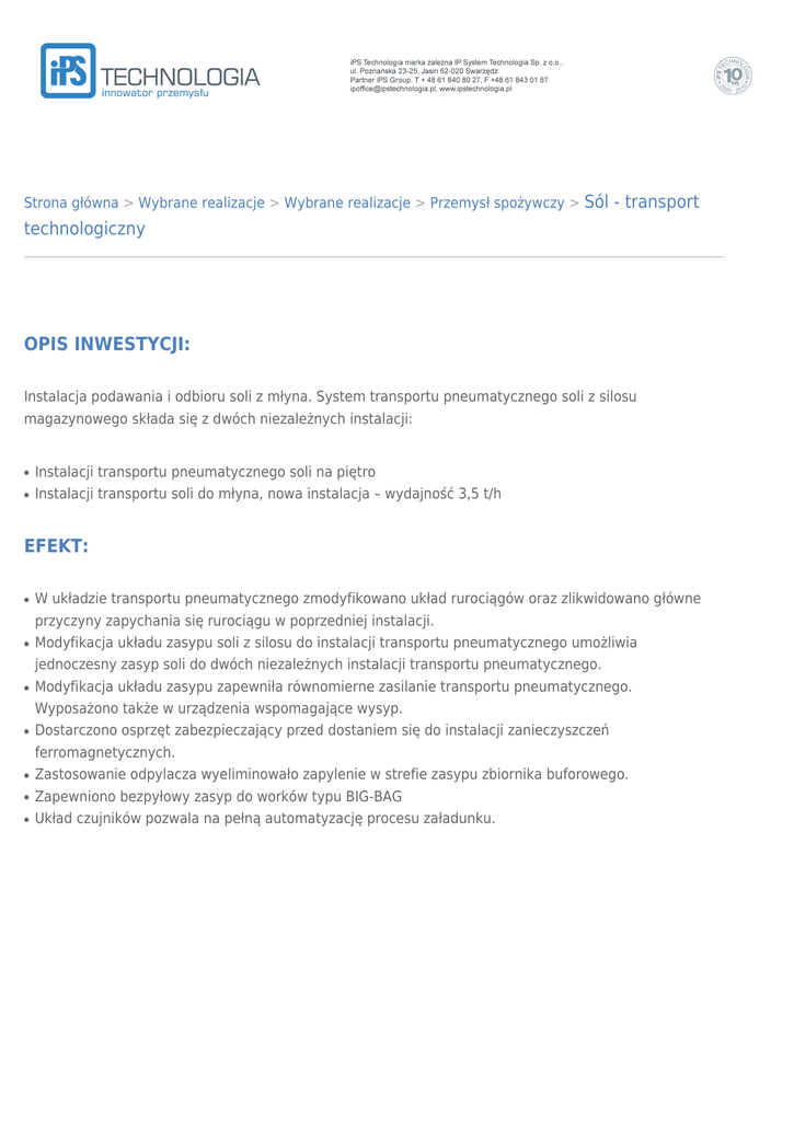 Strona główna > Wybrane realizacje > Wybrane realizacje > Przemysł spożywczy > Sól - transport technologiczny OPIS INWESTYCJI: Instalacja podawania i odbioru soli z młyna. System transportu pneumatycznego soli z silosu magazynowego składa się z dwóch niezależnych instalacji: ● ● Instalacji transportu pneumatycznego soli na piętro Instalacji transportu soli do młyna, nowa instalacja – wydajność 3,5 t/h EFEKT: ● ● ● ● ● ● ● W układzie transportu pneumatycznego zmodyfikowano układ rurociągów oraz zlikwidowano główne przyczyny zapychania się rurociągu w poprzedniej instalacji. Modyfikacja układu zasypu soli z silosu do instalacji transportu pneumatycznego umożliwia jednoczesny zasyp soli do dwóch niezależnych instalacji transportu pneumatycznego. Modyfikacja układu zasypu zapewniła równomierne zasilanie transportu pneumatycznego. Wyposażono także w urządzenia wspomagające wysyp. Dostarczono osprzęt zabezpieczający przed dostaniem się do instalacji zanieczyszczeń ferromagnetycznych. Zastosowanie odpylacza wyeliminowało zapylenie w strefie zasypu zbiornika buforowego. Zapewniono bezpyłowy zasyp do worków typu BIG-BAG Układ czujników pozwala na pełną automatyzację procesu załadunku.