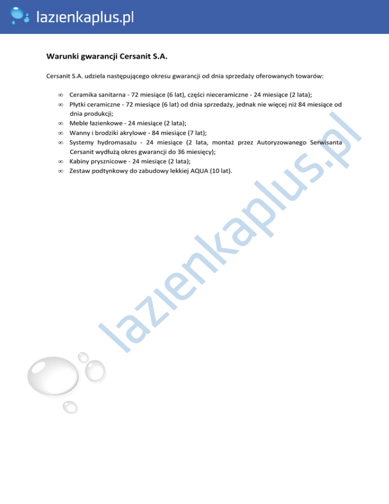 Warunki gwarancji Cersanit S.A. Cersanit S.A. udziela następującego okresu gwarancji od dnia sprzedaży oferowanych towarów: • • • • • • • Ceramika sanitarna - 72 miesiące (6 lat), części nieceramiczne - 24 miesiące (2 lata); Płytki ceramiczne - 72 miesiące (6 lat) od dnia sprzedaży, jednak nie więcej niż 84 miesiące od dnia produkcji; Meble łazienkowe - 24 miesiące (2 lata); Wanny i brodziki akrylowe - 84 miesiące (7 lat); Systemy hydromasażu - 24 miesiące (2 lata, montaż przez Autoryzowanego Serwisanta Cersanit wydłużą okres gwarancji do 36 miesięcy); Kabiny prysznicowe - 24 miesiące (2 lata); Zestaw podtynkowy do zabudowy lekkiej AQUA (10 lat).