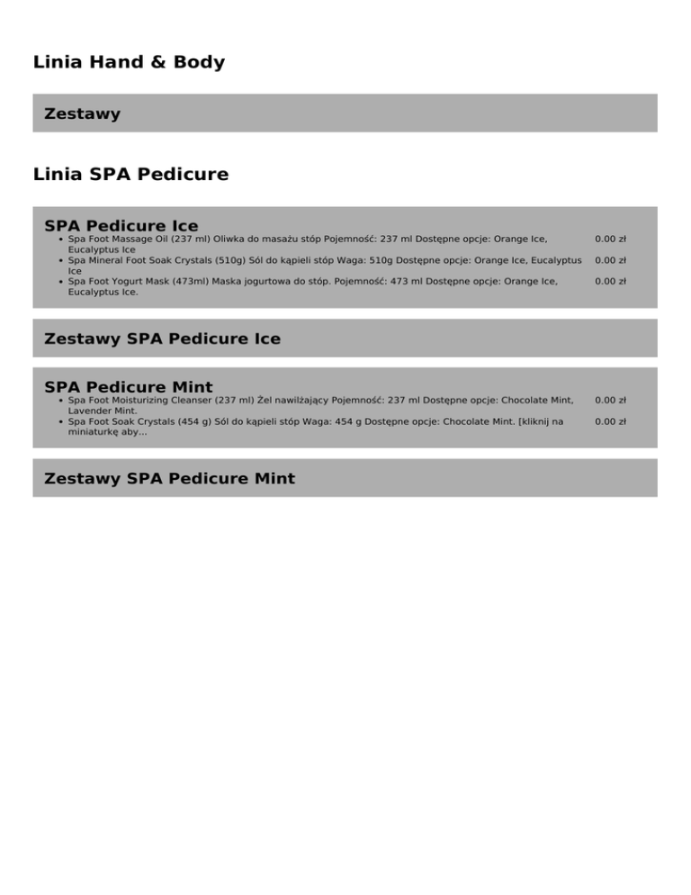 Linia Hand & Body Zestawy Linia SPA Pedicure SPA Pedicure Ice Spa Foot Massage Oil (237 ml) Oliwka do masażu stóp Pojemność: 237 ml Dostępne opcje: Orange Ice, Eucalyptus Ice Spa Mineral Foot Soak Crystals (510g) Sól do kąpieli stóp Waga: 510g Dostępne opcje: Orange Ice, Eucalyptus Ice Spa Foot Yogurt Mask (473ml) Maska jogurtowa do stóp. Pojemność: 473 ml Dostępne opcje: Orange Ice, Eucalyptus Ice. 0.00 zł 0.00 zł 0.00 zł Zestawy SPA Pedicure Ice SPA Pedicure Mint Spa Foot Moisturizing Cleanser (237 ml) Żel nawilżający Pojemność: 237 ml Dostępne opcje: Chocolate Mint, Lavender Mint. Spa Foot Soak Crystals (454 g) Sól do kąpieli stóp Waga: 454 g Dostępne opcje: Chocolate Mint. [kliknij na miniaturkę aby... Zestawy SPA Pedicure Mint Powered by TCPDF (www.tcpdf.org) 0.00 zł 0.00 zł