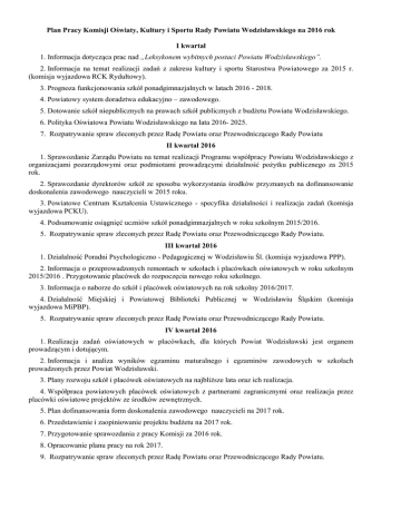 Plan Pracy Komisji Oświaty, Kultury i Sportu Rady Powiatu Wodzisławskiego na 2016 rok I kwartał 1. Informacja dotycząca prac nad „Leksykonem wybitnych postaci Powiatu Wodzisławskiego”. 2. Informacja na temat realizacji zadań z zakresu kultury i sportu Starostwa Powiatowego za 2015 r. (komisja wyjazdowa RCK Rydułtowy). 3. Prognoza funkcjonowania szkół ponadgimnazjalnych w latach 2016 - 2018. 4. Powiatowy system doradztwa edukacyjno – zawodowego. 5. Dotowanie szkół niepublicznych na prawach szkół publicznych z budżetu Powiatu Wodzisławskiego. 6. Polityka Oświatowa Powiatu Wodzisławskiego na lata 2016- 2025. 7. Rozpatrywanie spraw zleconych przez Radę Powiatu oraz Przewodniczącego Rady Powiatu II kwartał 2016 1. Sprawozdanie Zarządu Powiatu na temat realizacji Programu współpracy Powiatu Wodzisławskiego z organizacjami pozarządowymi oraz podmiotami prowadzącymi działalność pożytku publicznego za 2015 rok. 2. Sprawozdanie dyrektorów szkół ze sposobu wykorzystania środków przyznanych na dofinansowanie doskonalenia zawodowego nauczycieli w 2015 roku. 3. Powiatowe Centrum Kształcenia Ustawicznego - specyfika działalności i realizacja zadań (komisja wyjazdowa PCKU). 4. Podsumowanie osiągnięć uczniów szkół ponadgimnazjalnych w roku szkolnym 2015/2016. 5. Rozpatrywanie spraw zleconych przez Radę Powiatu oraz Przewodniczącego Rady Powiatu. III kwartał 2016 1. Działalność Poradni Psychologiczno - Pedagogicznej w Wodzisławiu Śl. (komisja wyjazdowa PPP). 2. Informacja o przeprowadzonych remontach w szkołach i placówkach oświatowych w roku szkolnym 2015/2016 . Przygotowanie placówek do rozpoczęcia nowego roku szkolnego. 3. Informacja o naborze do szkół i placówek oświatowych na rok szkolny 2016/2017. 4. Działalność Miejskiej i Powiatowej Biblioteki Publicznej w Wodzisławiu Śląskim (komisja wyjazdowa MiPBP). 5. Rozpatrywanie spraw zleconych przez Radę Powiatu oraz Przewodniczącego Rady Powiatu. IV kwartał 2016 1. Realizacja zadań oświatowych w placówkach, dla których Powiat Wodzisławski jest organem prowadzącym i dotującym. 2. Informacja i analiza wyników egzaminu maturalnego i egzaminów zawodowych w szkołach prowadzonych przez Powiat Wodzisławski. 3. Plany rozwoju szkół i placówek oświatowych na najbliższe lata oraz ich realizacja. 4. Współpraca powiatowych placówek oświatowych z partnerami zagranicznymi oraz realizacja przez placówki oświatowe projektów ze środków zewnętrznych. 5. Plan dofinansowania form doskonalenia zawodowego nauczycieli na 2017 rok. 6. Przedstawienie i zaopiniowanie projektu budżetu na 2017 rok. 7. Przygotowanie sprawozdania z pracy Komisji za 2016 rok. 8. Opracowanie planu pracy na rok 2017. 9. Rozpatrywanie spraw zleconych przez Radę Powiatu oraz Przewodniczącego Rady Powiatu.