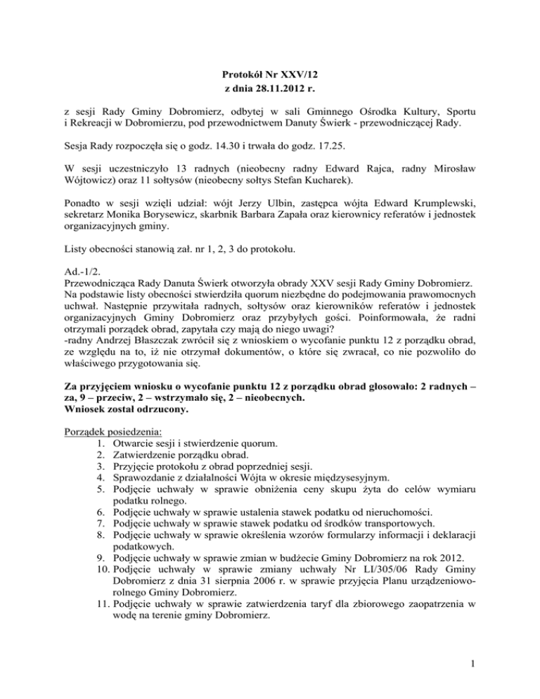 Protokół Nr XXV/12 z dnia 28.11.2012 r. z sesji Rady Gminy Dobromierz, odbytej w sali Gminnego Ośrodka Kultury, Sportu i Rekreacji w Dobromierzu, pod przewodnictwem Danuty Świerk - przewodniczącej Rady. Sesja Rady rozpoczęła się o godz. 14.30 i trwała do godz. 17.25. W sesji uczestniczyło 13 radnych (nieobecny radny Edward Rajca, radny Mirosław Wójtowicz) oraz 11 sołtysów (nieobecny sołtys Stefan Kucharek). Ponadto w sesji wzięli udział: wójt Jerzy Ulbin, zastępca wójta Edward Krumplewski, sekretarz Monika Borysewicz, skarbnik Barbara Zapała oraz kierownicy referatów i jednostek organizacyjnych gminy. Listy obecności stanowią zał. nr 1, 2, 3 do protokołu. Ad.-1/2. Przewodnicząca Rady Danuta Świerk otworzyła obrady XXV sesji Rady Gminy Dobromierz. Na podstawie listy obecności stwierdziła quorum niezbędne do podejmowania prawomocnych uchwał. Następnie przywitała radnych, sołtysów oraz kierowników referatów i jednostek organizacyjnych Gminy Dobromierz oraz przybyłych gości. Poinformowała, że radni otrzymali porządek obrad, zapytała czy mają do niego uwagi? -radny Andrzej Błaszczak zwrócił się z wnioskiem o wycofanie punktu 12 z porządku obrad, ze względu na to, iż nie otrzymał dokumentów, o które się zwracał, co nie pozwoliło do właściwego przygotowania się. Za przyjęciem wniosku o wycofanie punktu 12 z porządku obrad głosowało: 2 radnych – za, 9 – przeciw, 2 – wstrzymało się, 2 – nieobecnych. Wniosek został odrzucony. Porządek posiedzenia: 1. Otwarcie sesji i stwierdzenie quorum. 2. Zatwierdzenie porządku obrad. 3. Przyjęcie protokołu z obrad poprzedniej sesji. 4. Sprawozdanie z działalności Wójta w okresie międzysesyjnym. 5. Podjęcie uchwały w sprawie obniżenia ceny skupu żyta do celów wymiaru podatku rolnego. 6. Podjęcie uchwały w sprawie ustalenia stawek podatku od nieruchomości. 7. Podjęcie uchwały w sprawie stawek podatku od środków transportowych. 8. Podjęcie uchwały w sprawie określenia wzorów formularzy informacji i deklaracji podatkowych. 9. Podjęcie uchwały w sprawie zmian w budżecie Gminy Dobromierz na rok 2012. 10. Podjęcie uchwały w sprawie zmiany uchwały Nr LI/305/06 Rady Gminy Dobromierz z dnia 31 sierpnia 2006 r. w sprawie przyjęcia Planu urządzenioworolnego Gminy Dobromierz. 11. Podjęcie uchwały w sprawie zatwierdzenia taryf dla zbiorowego zaopatrzenia w wodę na terenie gminy Dobromierz. 1 12. Podjęcie uchwały w sprawie rozpatrzenia skargi na działalność dyrektora Zespołu Szkół im. Henryka Sienkiewicza w Roztoce. 13. Interpelacje i wnioski radnych. 14. Odpowiedzi na interpelacje złożone na poprzednich sesjach i między sesjami. 15. Wolne wnioski, zapytania, informacje. 16. Zamknięcie obrad sesji. Ad.-3. -przewodnicząca Rady Danuta Świerk poinformowała, że protokół z ostatniej sesji został wyłożony do wglądu w Biurze Rady, nie wniesiono do tej pory do niego żadnych uwag. Zapytała, czy radni mają uwagi do protokołu? Uwag nie zgłoszono. Stwierdziła, iż protokół został przyjęty przez aklamację. Ad.-4. -przewodnicząca Rady Danuta Świerk zapytała, czy radni mają pytania do przedłożonego sprawozdania z działalności Wójta w okresie międzysesyjnym? Pytań nie zgłoszono. -wójt Jerzy Ulbin poinformował, że podpisana została umowa na usuwanie wyrobów zawierających azbest z terenu gminy na lata 2012-2013, wnioski były już zbierane. Sprawa zostaje ponowiona, wnioski można składać do 15 stycznia 2013 r. – i dotyczy tych osób, które chcą usunąć azbest w 2013 r. z posesji, a nie złożyły jeszcze wniosku. Dodał, że kampania informacyjna zostanie przeprowadzona. Ad.-5. -skarbnik gminy Barbara Zapała omówiła projekt uchwały w sprawie obniżenia ceny skupu żyta do celów wymiaru podatku rolnego. Poinformowała, że w związku z trudną sytuacją finansową rolników gminy Dobromierz obniża sie stawkę GUS o 16,96 % tj. z kwoty 75,86 zł za 1 dt. na kwotę 63,00 zł za 1 dt. Projekt uchwały stanowi załącznik do protokołu. -przewodnicząca Rady Danuta Świerk zapytała, czy radni mają pytania do przedmiotowego projektu uchwały? -radny Marek Jaworski poinformował, że jest konsekwentny. Zwrócił uwagę na zapis „W związku z trudną sytuacją finansową rolników gminy Dobromierz obniża sie stawkę GUS” i dodał, że właściwie podwyższa się stawkę z ubiegłego roku o 3 zł . W ogólnym rozrachunku jest podwyżka podatku, a nie obniżka. W dniu wczorajszym na Komisji Rolnictwa złożony został wniosek - byłem za tym, żeby stawka została taka, jak była w ubiegłym roku 60 zł za kwintal żyta. Przegłosowano tak jak przegłosowano. Poprosił, za nim pan wójt poda ceny w gminach ościennych, aby wziąć pod uwagę naszych rolników, którzy dostali w kość w zbiorach, bo były wymrożenia - musieli jeszcze raz dosiewać, to znowu jakieś pieniądze itd. Zapytał, czy te 3 zł to jest dużo? Dodał, może dużo, może mało. Złożył wniosek mówiący o pozostawieniu takiej stawki podatku jak w tamtym roku. Stwierdził, że nie będzie mocnego uszczerbku dla gminy i mocnej zwyżki dla rolników, ale wtedy można będzie powiedzieć , że „w związku z trudną sytuacją rolników” pozostawiony został ten podatek, jak był w ubiegłym roku. -wójt Jerzy Ulbin poinformował, że w ubiegłym roku stawka wynosiła 60 zł i wśród 12 gmin ościennych (8 powiatu świdnickiego, Paszowice, Bolków, Mściwojów, Stare Bogaczewice) stawka została obniżona o ponad 19% w 7 gminach, a 5 gmin miało wyższe stawki. W tym roku gmina Dobromierz dalej obniża stawkę o ok. 17% i znajduje się w grupie 4 gmin, które mają najniższe stawki (Świdnica, Strzegom – 62,40 zł, Jaworzyna – 64,20 zł, Dobromierz – 2 63 zł), 2 gminy - 70 zł, 6 gmin najwyższa stawka – 75,86 zł. Zwrócił uwagę na stawki GUS w 2006 r. – 27,88 zł, gdy w gminie Dobromierz w tym czasie ustalono stawkę maksymalną, w