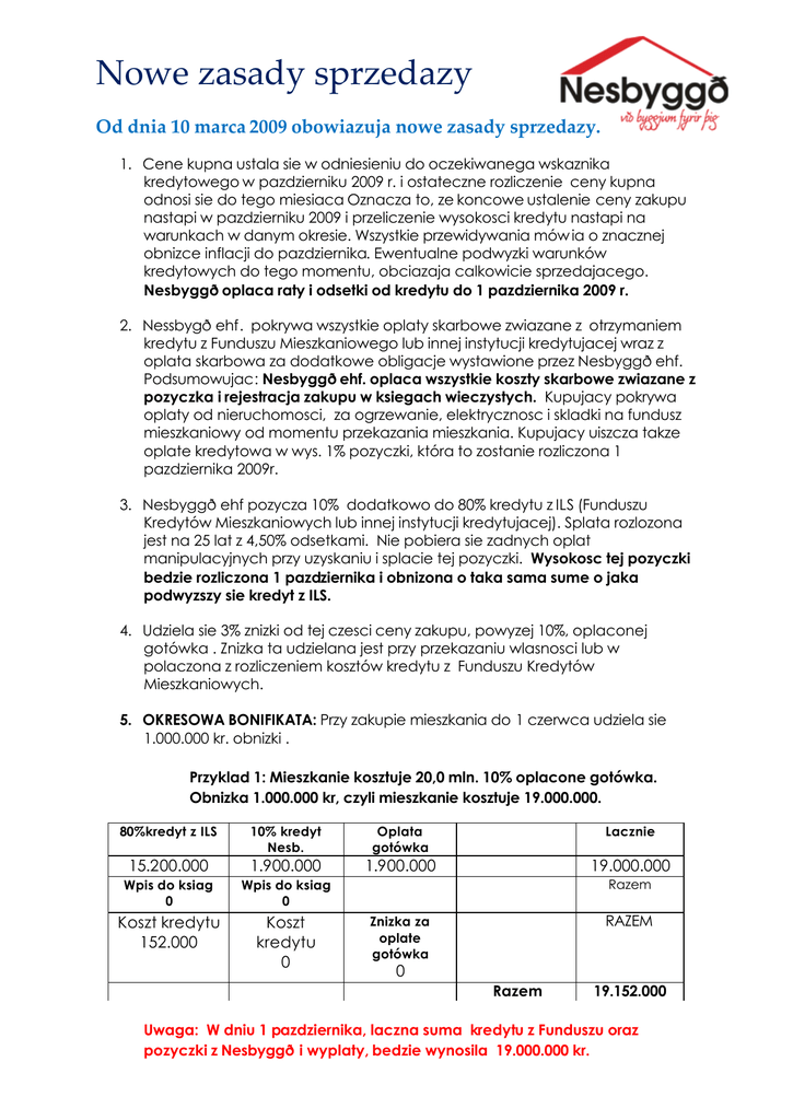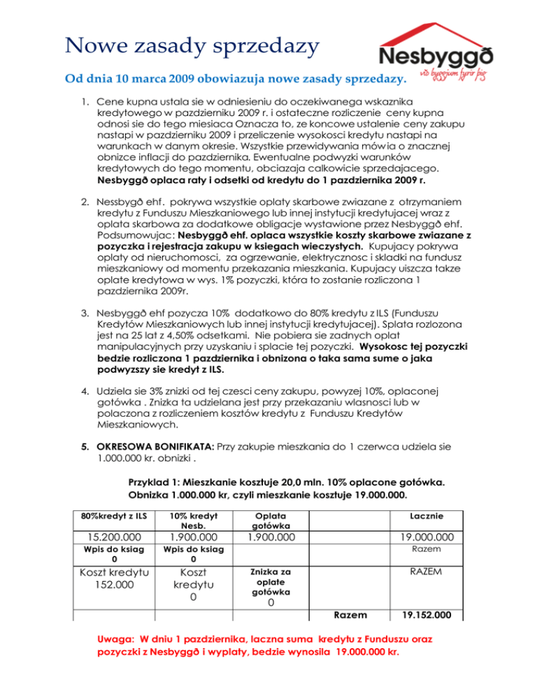 Nowe zasady sprzedazy Od dnia 10 marca 2009 obowiazuja nowe zasady sprzedazy. 1. Cene kupna ustala sie w odniesieniu do oczekiwanega wskaznika kredytowego w pazdzierniku 2009 r. i ostateczne rozliczenie ceny kupna odnosi sie do tego miesiaca Oznacza to, ze koncowe ustalenie ceny zakupu nastapi w pazdzierniku 2009 i przeliczenie wysokosci kredytu nastapi na warunkach w danym okresie. Wszystkie przewidywania mów ia o znacznej obnizce inflacji do pazdziernika. Ewentualne podwyzki warunków kredytowych do tego momentu, obciazaja calkowicie sprzedajacego. Nesbyggð oplaca raty i odsetki od kredytu do 1 pazdziernika 2009 r. 2. Nessbygð ehf. pokrywa wszystkie oplaty skarbowe zwiazane z otrzymaniem kredytu z Funduszu Mieszkaniowego lub innej instytucji kredytujacej wraz z oplata skarbowa za dodatkowe obligacje wystawione przez Nesbyggð ehf. Podsumowujac: Nesbyggð ehf. oplaca wszystkie koszty skarbowe zwiazane z pozyczka i rejestracja zakupu w ksiegach wieczystych. Kupujacy pokrywa oplaty od nieruchomosci, za ogrzewanie, elektrycznosc i skladki na fundusz mieszkaniowy od momentu przekazania mieszkania. Kupujacy uiszcza takze oplate kredytowa w wys. 1% pozyczki, która to zostanie rozliczona 1 pazdziernika 2009r. 3. Nesbyggð ehf pozycza 10% dodatkowo do 80% kredytu z ILS (Funduszu Kredytów Mieszkaniowych lub innej instytucji kredytujacej). Splata rozlozona jest na 25 lat z 4,50% odsetkami. Nie pobiera sie zadnych oplat manipulacyjnych przy uzyskaniu i splacie tej pozyczki. Wysokosc tej pozyczki bedzie rozliczona 1 pazdziernika i obnizona o taka sama sume o jaka podwyzszy sie kredyt z ILS. 4. Udziela sie 3% znizki od tej czesci ceny zakupu, powyzej 10%, oplaconej gotówka . Znizka ta udzielana jest przy przekazaniu wlasnosci lub w polaczona z rozliczeniem kosztów kredytu z Funduszu Kredytów Mieszkaniowych. 5. OKRESOWA BONIFIKATA: Przy zakupie mieszkania do 1 czerwca udziela sie 1.000.000 kr. obnizki . Przyklad 1: Mieszkanie kosztuje 20,0 mln. 10% oplacone gotówka. Obnizka 1.000.000 kr, czyli mieszkanie kosztuje 19.000.000. 80%kredyt z ILS 10% kredyt Nesb. Oplata gotówka Lacznie 15.200.000 1.900.000 1.900.000 19.000.000 Wpis do ksiag 0 Wpis do ksiag 0 Koszt kredytu 152.000 Koszt kredytu 0 Razem RAZEM Znizka za oplate gotówka 0 Razem 19.152.000 Uwaga: W dniu 1 pazdziernika, laczna suma kredytu z Funduszu oraz pozyczki z Nesbyggð i wyplaty, bedzie wynosila 19.000.000 kr.