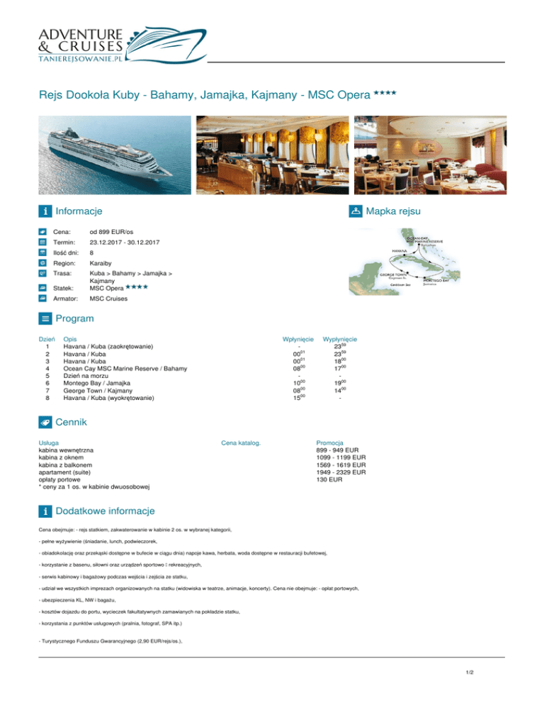 Rejs Dookoła Kuby - Bahamy, Jamajka, Kajmany - MSC Opera Informacje Cena: od 899 EUR/os Termin: 23.12.2017 - 30.12.2017 Ilość dni: 8 Region: Karaiby Trasa: Statek: Kuba > Bahamy > Jamajka > Kajmany MSC Opera Armator: MSC Cruises Mapka rejsu Program Dzień 1 2 3 4 5 6 7 8 Opis Havana / Kuba (zaokrętowanie) Havana / Kuba Havana / Kuba Ocean Cay MSC Marine Reserve / Bahamy Dzień na morzu Montego Bay / Jamajka George Town / Kajmany Havana / Kuba (wyokrętowanie) Wpłynięcie 0001 0001 0800 1000 0800 1500 Wypłynięcie 2359 2359 1800 1700 1900 1400 - Cennik Usługa kabina wewnętrzna kabina z oknem kabina z balkonem apartament (suite) opłaty portowe * ceny za 1 os. w kabinie dwuosobowej Cena katalog. Promocja 899 - 949 EUR 1099 - 1199 EUR 1569 - 1619 EUR 1949 - 2329 EUR 130 EUR Dodatkowe informacje Cena obejmuje: - rejs statkiem, zakwaterowanie w kabinie 2 os. w wybranej kategorii, - pełne wyżywienie (śniadanie, lunch, podwieczorek, - obiadokolację oraz przekąski dostępne w bufecie w ciągu dnia) napoje kawa, herbata, woda dostępne w restauracji bufetowej, - korzystanie z basenu, siłowni oraz urządzeń sportowo – rekreacyjnych, - serwis kabinowy i bagażowy podczas wejścia i zejścia ze statku, - udział we wszystkich imprezach organizowanych na statku (widowiska w teatrze, animacje, koncerty). Cena nie obejmuje: - opłat portowych, - ubezpieczenia KL, NW i bagażu, - kosztów dojazdu do portu, wycieczek fakultatywnych zamawianych na pokładzie statku, - korzystania z punktów usługowych (pralnia, fotograf, SPA itp.) - Turystycznego Funduszu Gwarancyjnego (2,90 EUR/rejs/os.), 1/2 -obowiązkowych napiwków dla załogi osoba dorosła 9 EUR/os./dzień dzieci 3-13 lat 4,5 EUR/os./dzień. All Inclusive (opcjonalnie) Istnieje możliwość wykupienia formuły all inclusive na czas trwania rejsu. Pakiet obejmuje napoje alkoholowe i bezalkoholowe dostępne we wszystkich barach bez ograniczeń (Napoje objęte pakietem: piwo, wino, napoje gazowane, likiery, koktajle, wódka, koniak, whisky itp.) Koszt pakietu 26 EUR/dzień osoba dorosła i 12 EUR/dzień dziecko. Formuła all inclusive obowiązkowa jest na czas całego rejsu dla wszystkich osób podróżujących w jednej kabinie. 2/2 Powered by TCPDF (www.tcpdf.org)